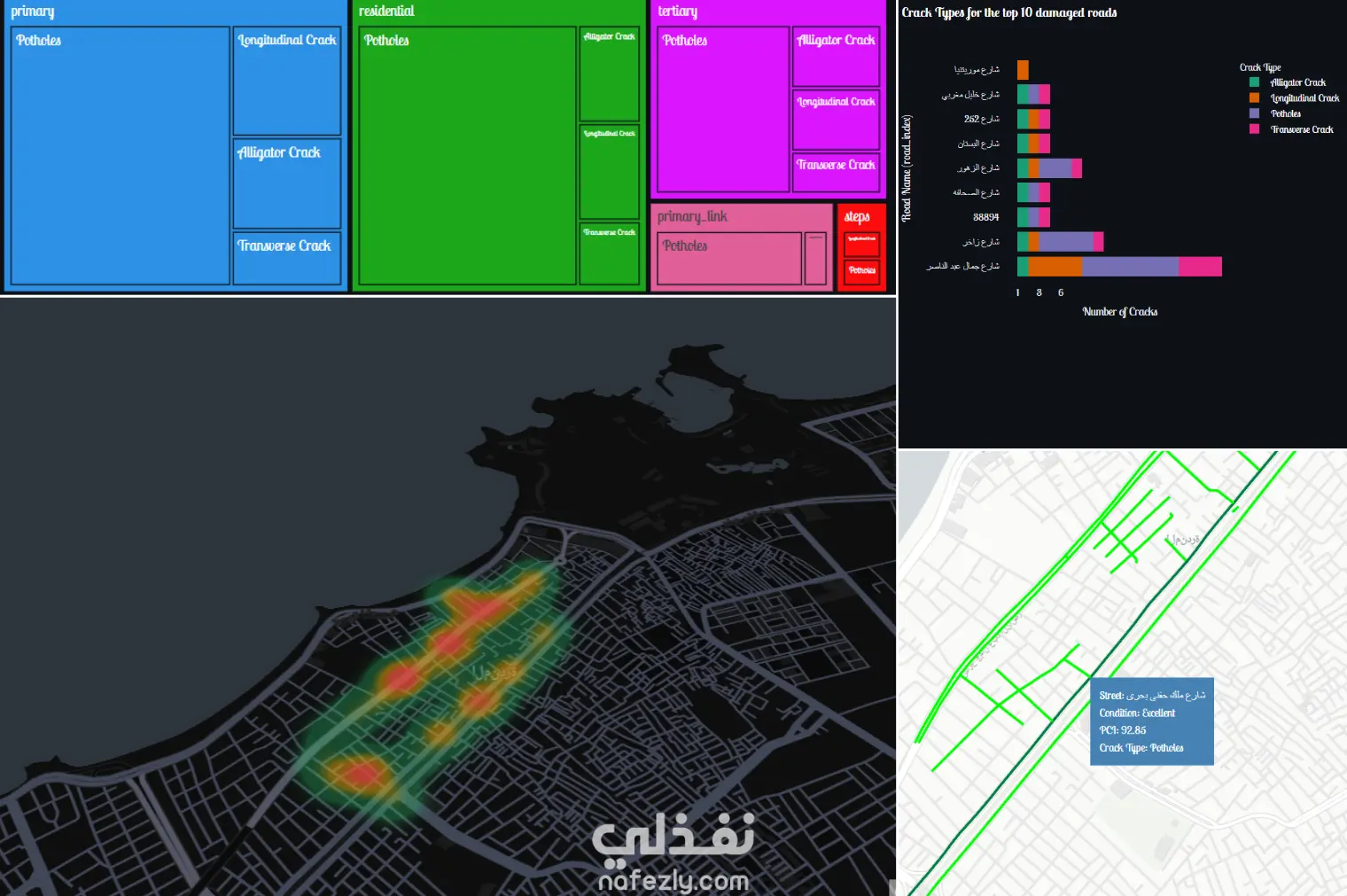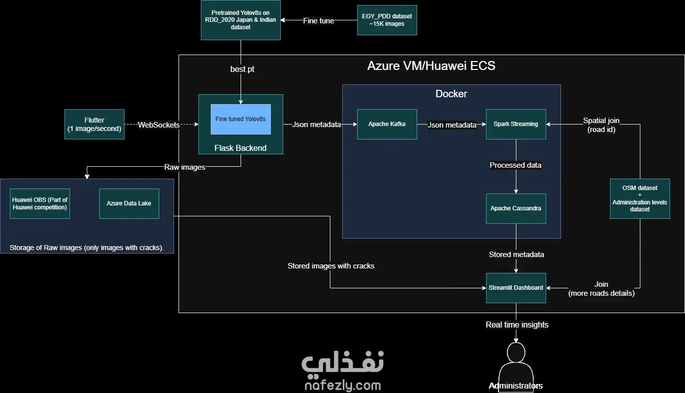 PavementEye is an end-to-end solution for sustainable infrastructure management, designed to: • Automatically detect and classify pavement cracks using computer vision (YOLO v8s). • Process and geolocate data via a robust streaming data pipeline, syncing with OpenStreetMap. • Fully hosted on Azure cloud. • Centralize all insights into a real-time dashboard, visualizing road severity levels to intelligently prioritize repair schedules.