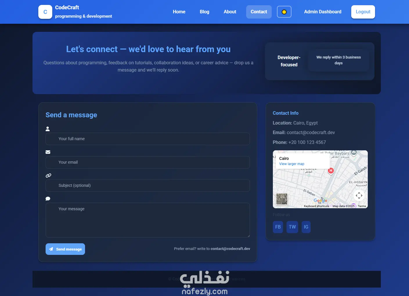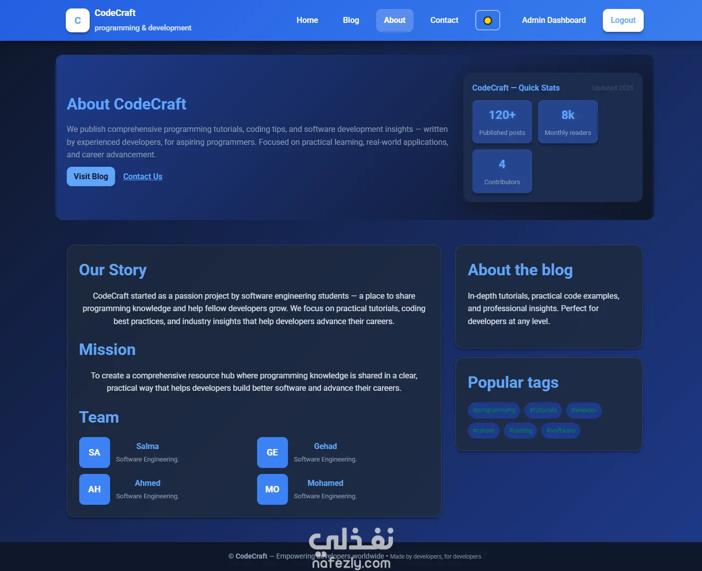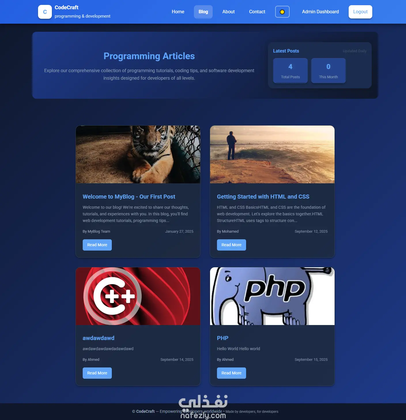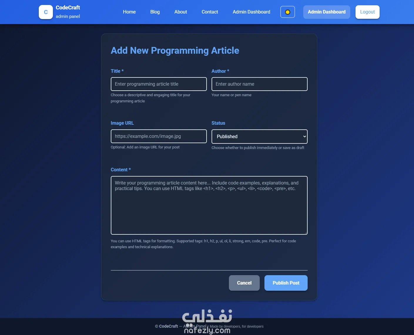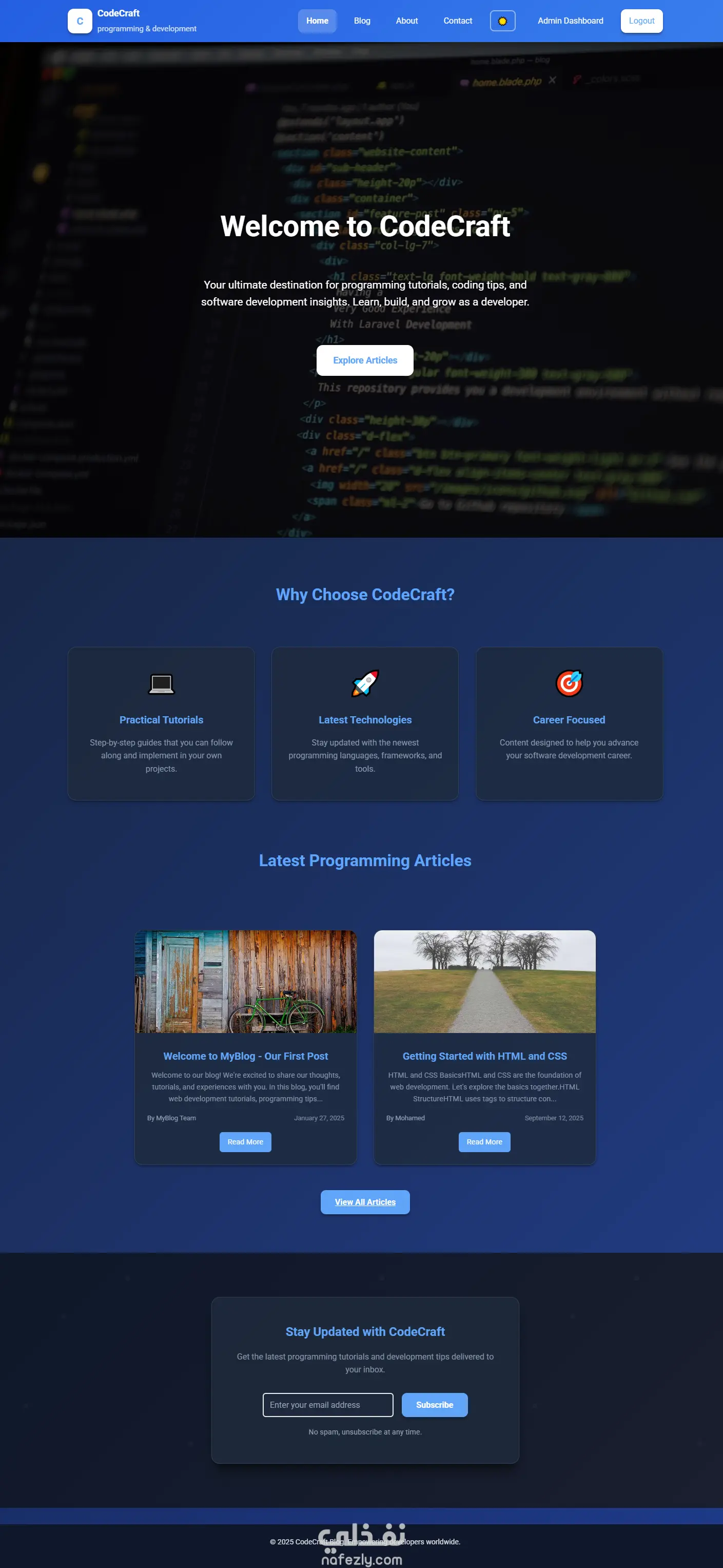 مشروع "CodeCraft" هو نظام بلوجر بسيط مخصص لإدارة ونشر المقالات البرمجية.