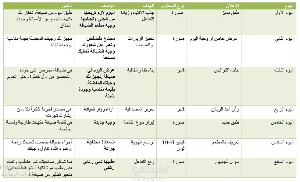 تنظيم المحتوى حسب أهداف محددة: جذب الانتباه، بناء الثقة، تحفيز المبيعات، رفع التفاعل وكتابة نصوص مختصرة وملهمة لكل منشور لتعزيز التفاعل مع الجمهور.