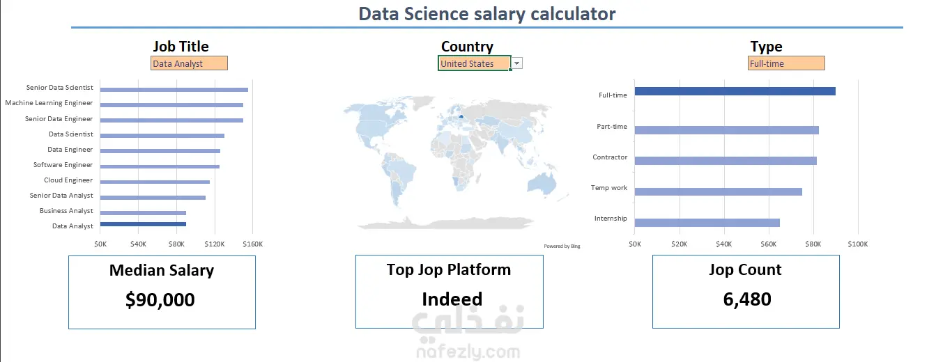 تم إنشاء لوحة معلومات رواتب وظائف البيانات هذه لمساعدة الباحثين عن عمل في تحليل الرواتب الخاصة بالوظائف التي يطمحون إليها، والتأكد من حصولهم على تعويض عادل. تحتوي البيانات على معلومات تفصيلية حول المسمّيات الوظيفية، الرواتب، المواقع، والمهارات الأساسية التي يتم عرضها هنا. تم استخدام المهارات التالية في إكسل للتحليل: 1- المخططات (Charts) 2- الصيغ والدوال (Formulas and Functions) 3- التحقق من صحة البيانات (Data Validation) مجموعة بيانات وظائف البيانات أنشأت هذه اللوحة بمساعدة Luke Barousse لعرض رؤى حول اتجاهات الرواتب عبر مختلف المسمّيات الوظيفية المرتبطة بالبيانات. باستخدام البيانات من الدورة التدريبية الخاصة به، تساعد هذه اللوحة المستخدمين على اتخاذ قرارات مهنية واعية، من خلال استكشاف كيفية تأثير الموقع ونوع الوظيفة على الرواتب.