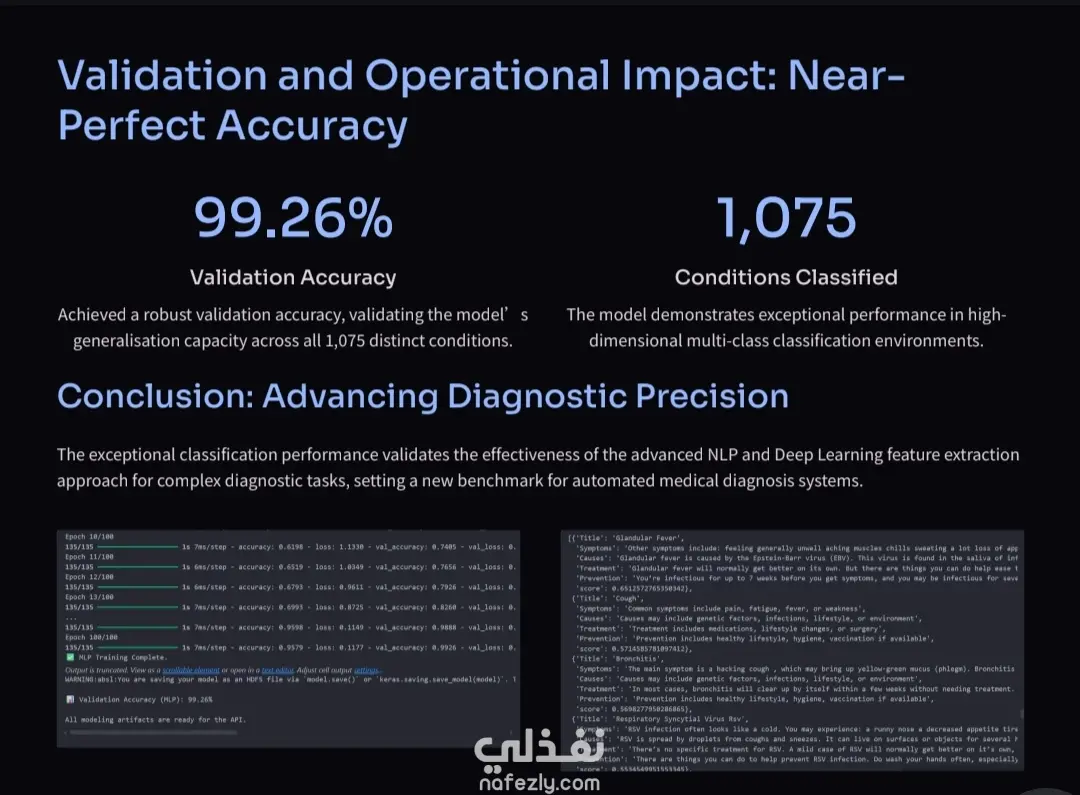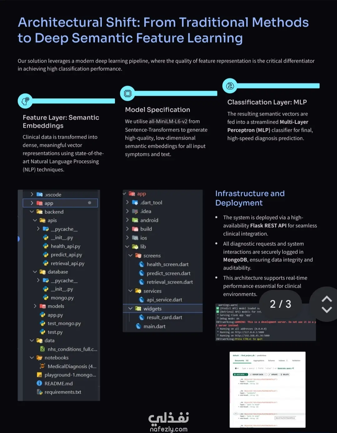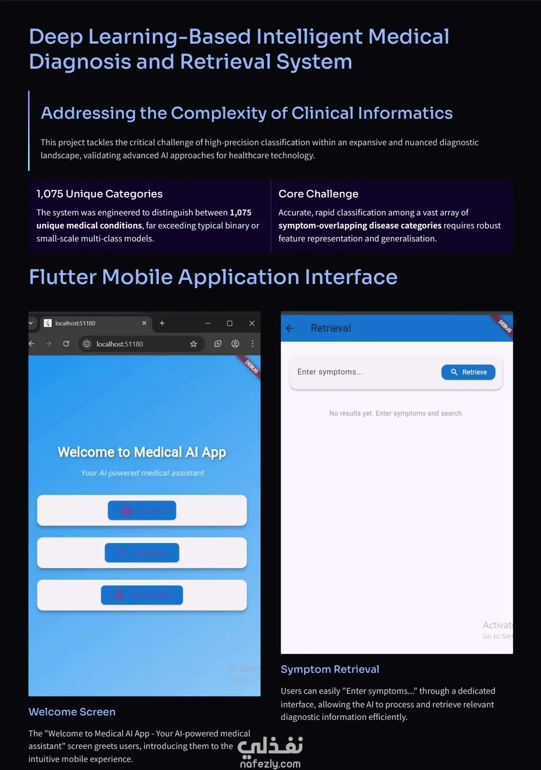 ▪️خلصت مشروع اسمه Deep Learning-Based Intelligent Medical Diagnosis System ? الفكرة كانت إني أعمل system يساعد في تشخيص الأمراض باستخدام AI وNLP، بحيث المستخدم يكتب الـsymptoms، والنظام يحاول يطلّعله تشخيص مبدئي. اشتغلت على الـmodel باستخدام Sentence Transformers (all-MiniLM-L6-v2) عشان أطلع الـembeddings وبعدها استخدمت MLP classifier عشان التصنيف. قبل الtraining عملت tokenization وcleaning للـdata عشان أجهز النصوص بشكل مناسب للـmodel. كمان جمّعت الـdataset عن طريق web scraping من موقع https://lnkd.in/eNAQdUPJ عشان أقدر أجيب symptoms وdescriptions حقيقية وأبني عليها الـmodel بشكل واقعي. الـbackend كان بـ Flask، والتخزين بـ MongoDB، وعملت الـinterface بـ Flutter app. المشروع ده علّمني دمج الـAI models بالـapplications،وازاي أتعامل مع الـdata من أول preprocessing لحد النتيجة النهائية