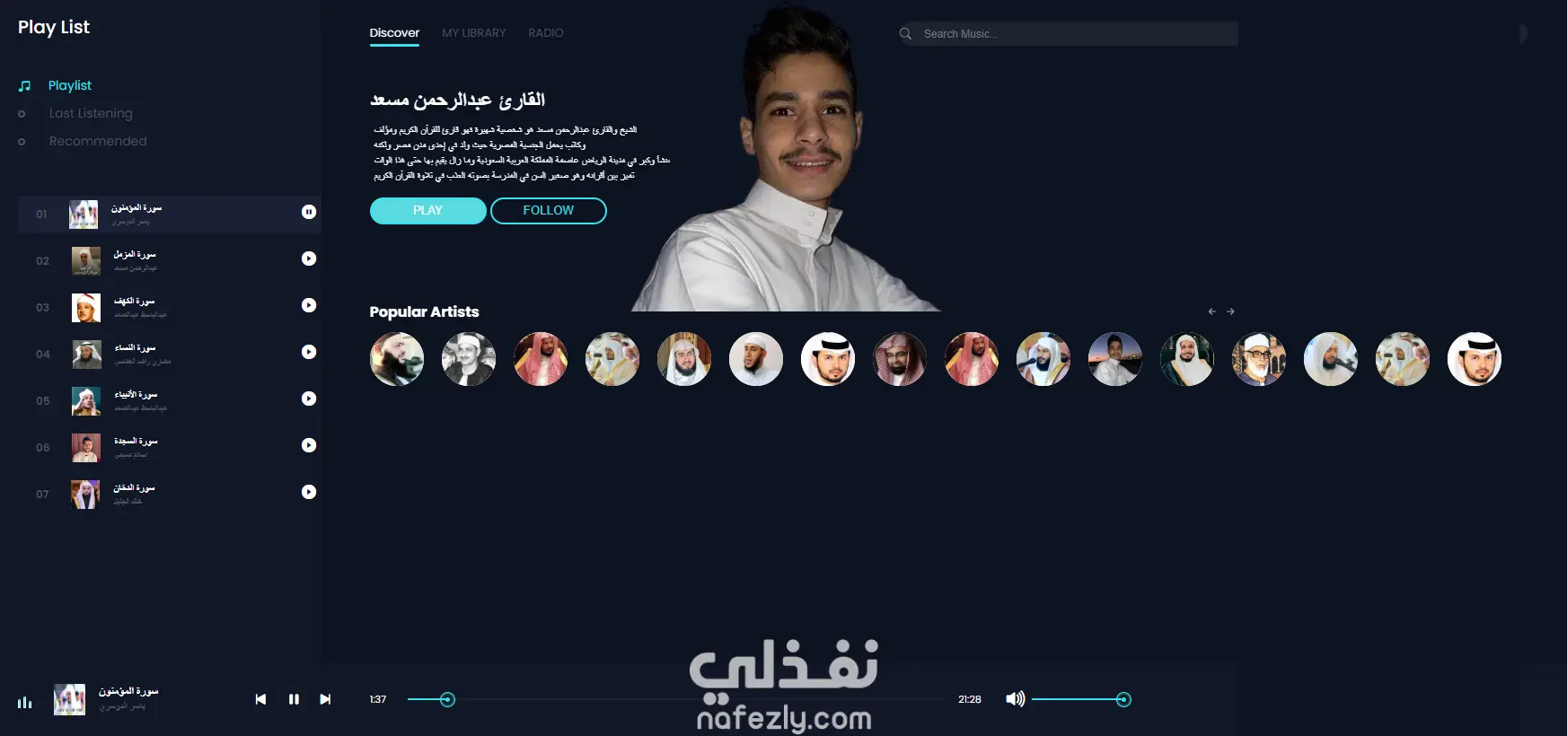 تطبيق Music Player كامل المميزات تشغيل جميع صيغ الصوت الشائعة (MP3 – WAV – AAC). التشغيل في الخلفية مع التحكم من الإشعارات. Mini Player في أسفل الشاشة أثناء التصفح. صفحة تشغيل احترافية (Now Playing) مع صورة الألبوم. قوائم تشغيل (Playlists) قابلة للإضافة والحذف وإعادة الترتيب. عرض الأغاني حسب: الفنان – الألبوم – المجلد – النوع. نظام Shuffle و Repeat