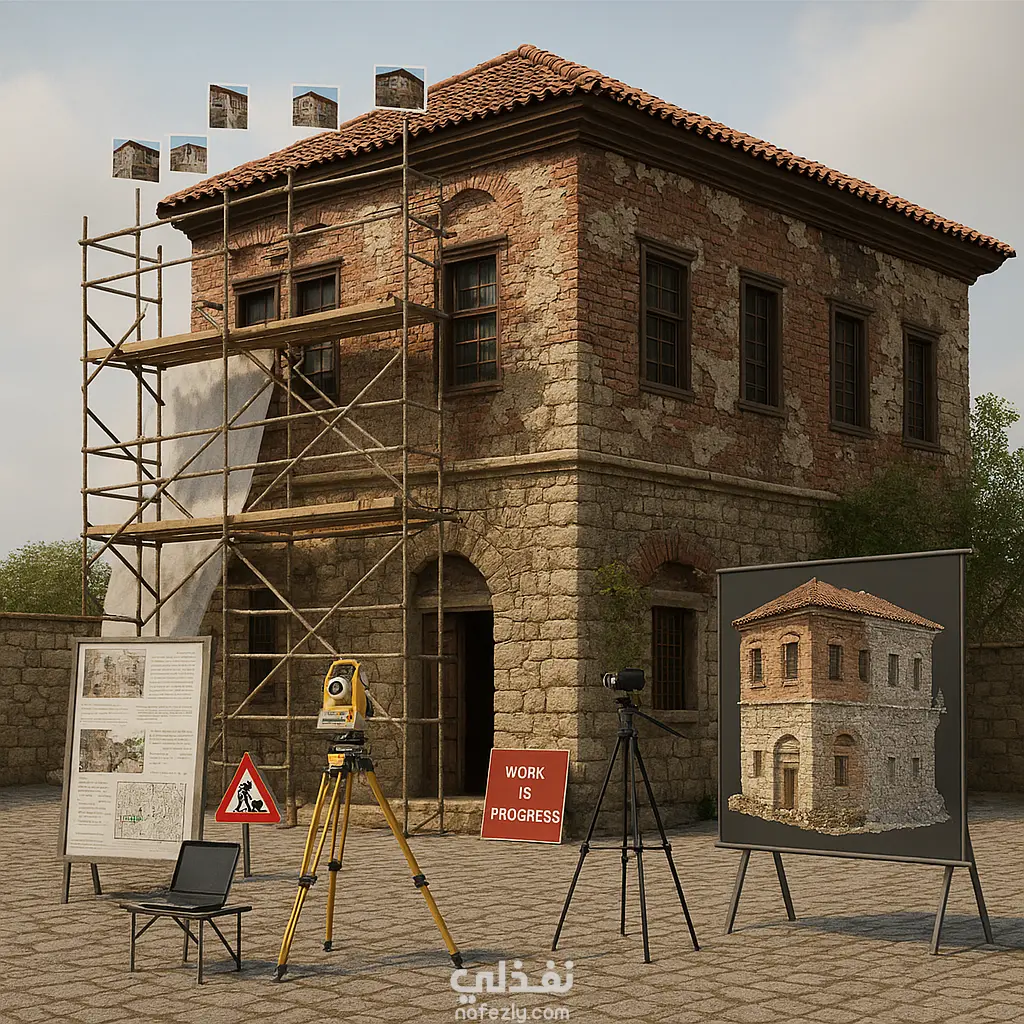 تنفيذ أعمال الرفع المعماري ثلاثي الأبعاد، وتسجيل الحالة الراهنة للموقع باستخدام تقنيات المسح الرقمي والتصوير الفوتوغرافي. إعداد تقرير فني شامل يوضح الأضرار وأولويات الحماية.