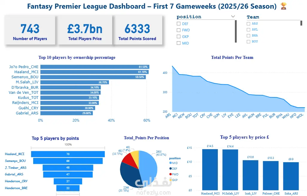 لوحة بيانات (Dashboard) تحليلية تم تصميمها باستخدام (Power BI)، وهي مخصصة لمساعدة لاعبي "فانتازي الدوري الإنجليزي" على اتخاذ قرارات مبنية على البيانات.