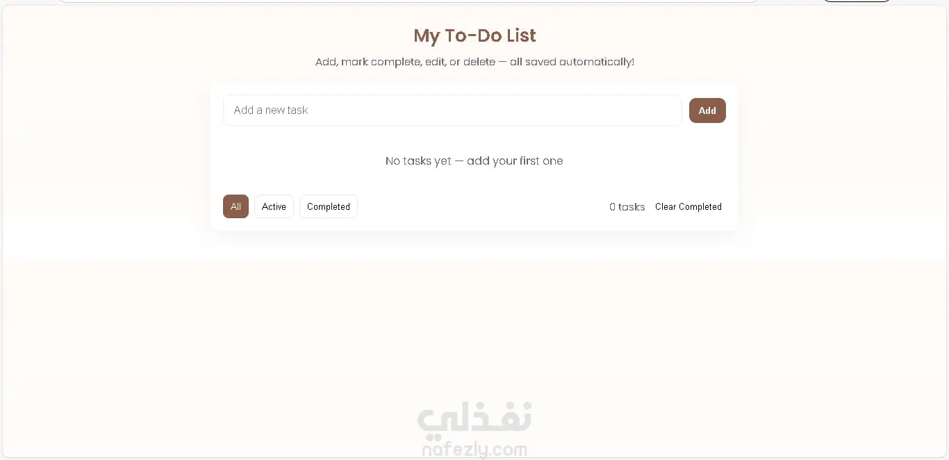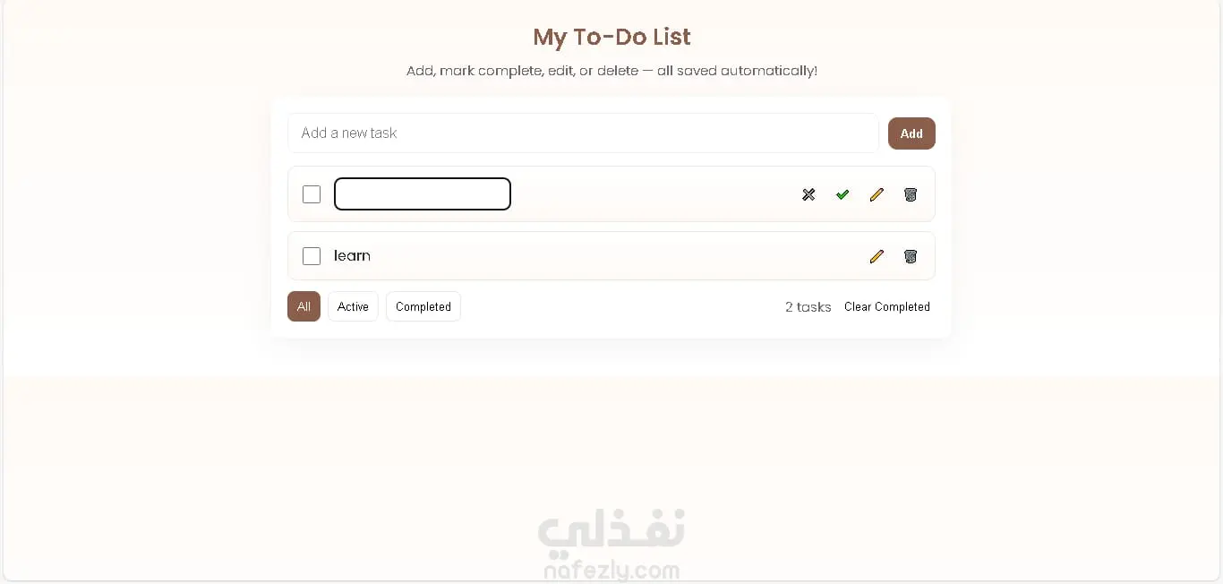 تطبيق ويب تفاعلي لإدارة المهام اليومية (To-Do List) تم تطويره باستخدام HTML، CSS، وJavaScript. يتيح للمستخدمين إضافة المهام، تعديلها، وحذفها بسهولة مع واجهة أنيقة وسلسة الاستخدام، كما يتم حفظ المهام تلقائيًا في المتصفح (Local Storage) لضمان عدم فقدان البيانات بعد إغلاق الصفحة. المزايا الأساسية: إضافة المهام وحذفها وتحديد المهام المنجزة تصميم بسيط وألوان مريحة للعين سرعة وأداء ممتاز