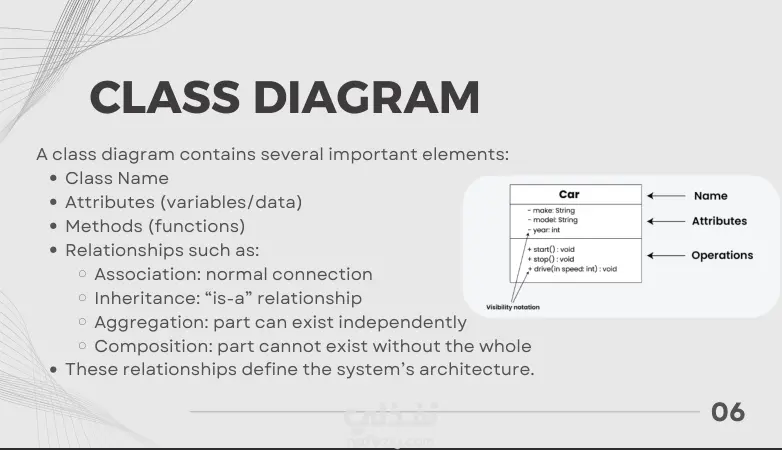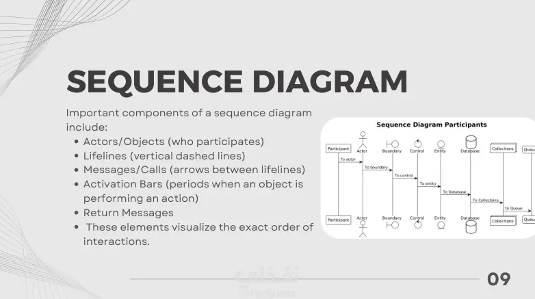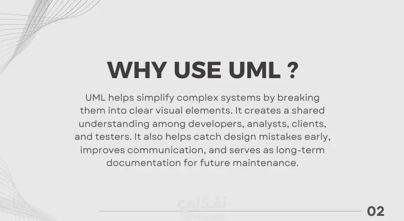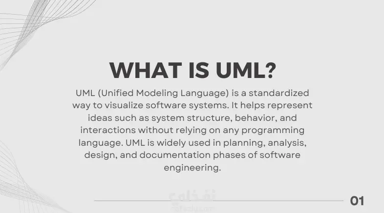 هذا العمل عبارة عن عرض تقديمي احترافي (Presentation) شامل يشرح مفاهيم UML – Unified Modeling Language بطريقة مبسّطة ومنسقة، مخصص لطلاب الحاسب والمبرمجين المبتدئين أو لأي شخص يرغب في فهم أساسيات تحليل وتصميم الأنظمة. محتوى العرض يتضمن البريزنتيشن شرحًا واضحًا ومنظمًا للموضوعات التالية: تعريف UML وأهميته في تحليل وتصميم الأنظمة. الأسباب التي تجعل UML أداة فعّالة في التواصل بين أعضاء الفريق. تقسيم مخططات UML إلى مخططات هيكلية Structural ومخططات سلوكية Behavioral. شرح مفصل لمخطط Class Diagram مع توضيح عناصره الأساسية وأنواع العلاقات المختلفة بين الكائنات. تقديم مخطط Sequence Diagram مع شرح عناصره ودوره في تتبع تسلسل العمليات داخل النظام. صفحة تلخيص عامة تجمع أهم النقاط الأساسية. مواصفات التصميم تصميم حديث، بسيط، واحترافي يناسب العروض الأكاديمية والعملية. تنسيق ألوان هادئ وخط واضح لسهولة القراءة. تنظيم المحتوى عبر شرائح متسلسلة (10 شرائح). استخدام أسلوب بصري يساعد على الفهم مثل النقاط المختصرة والأمثلة. هدف العمل الهدف من هذا العرض هو تقديم شرح واضح وسهل لمفاهيم الـ UML للمساعدة في الدراسة، الفهم، أو تقديمه ضمن مادة أكاديمية أو ورشة تدريبية.