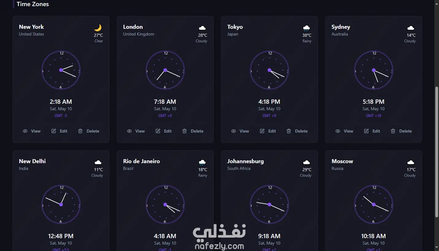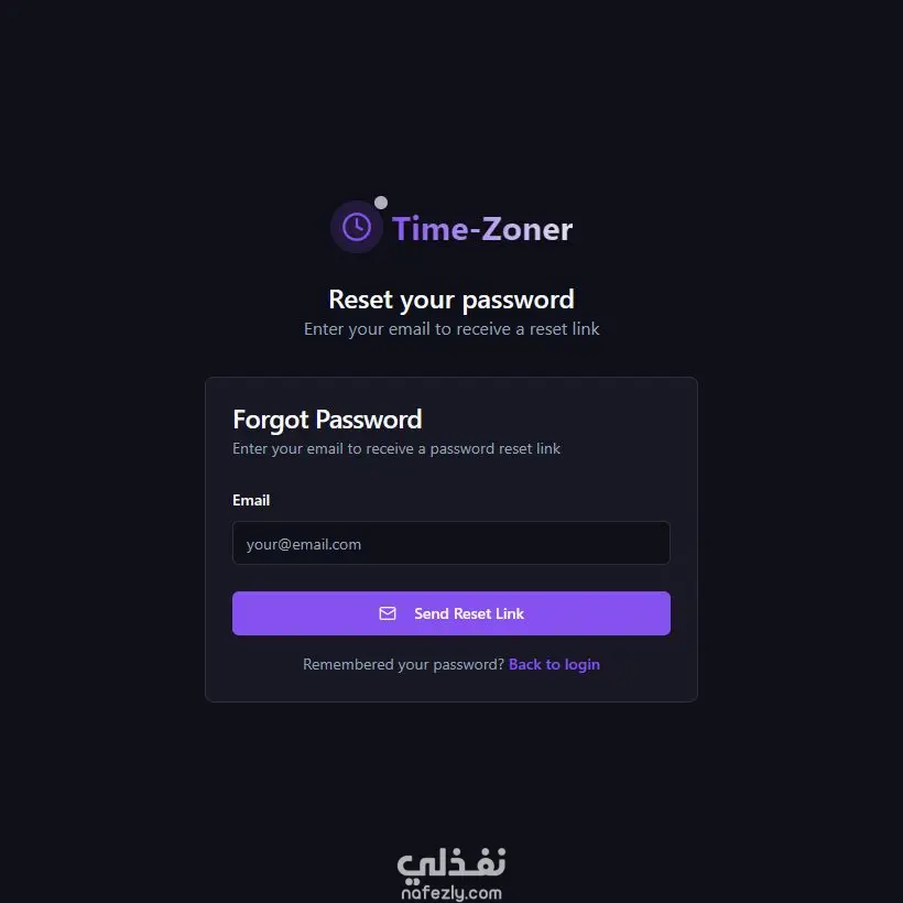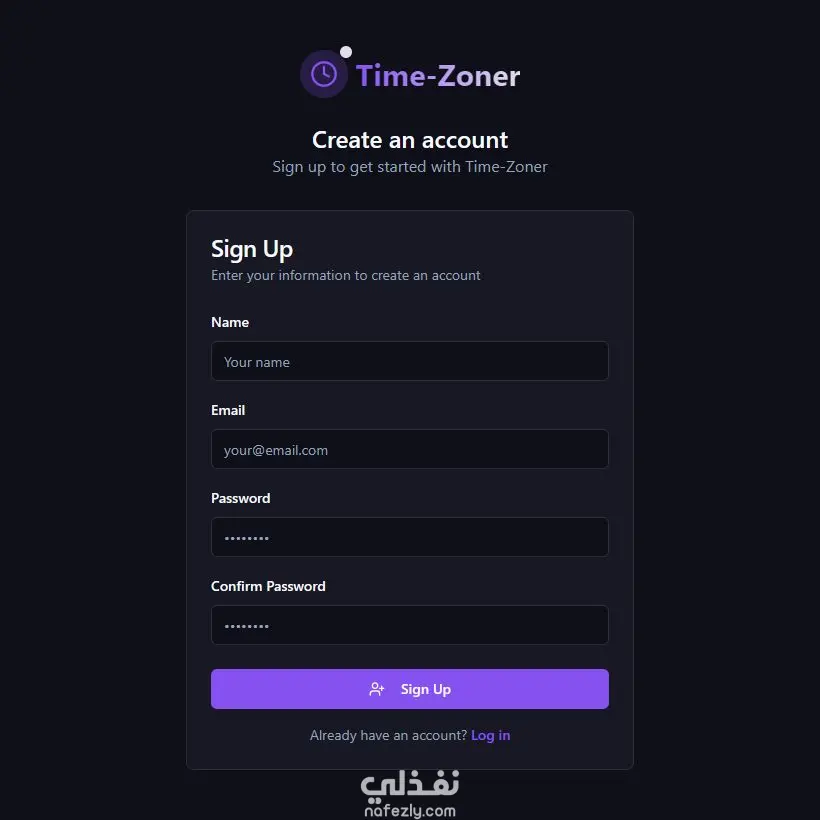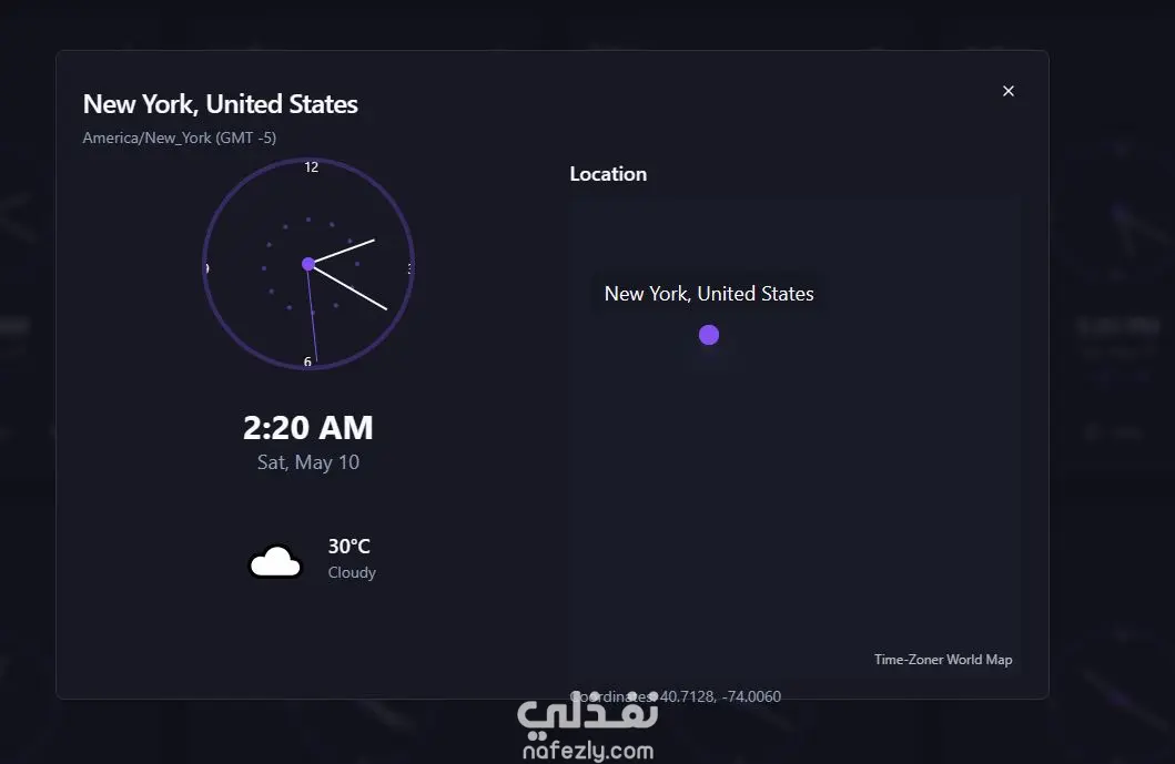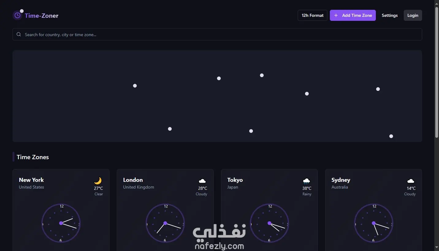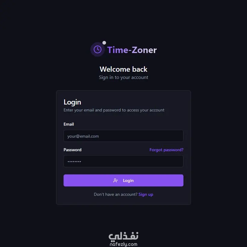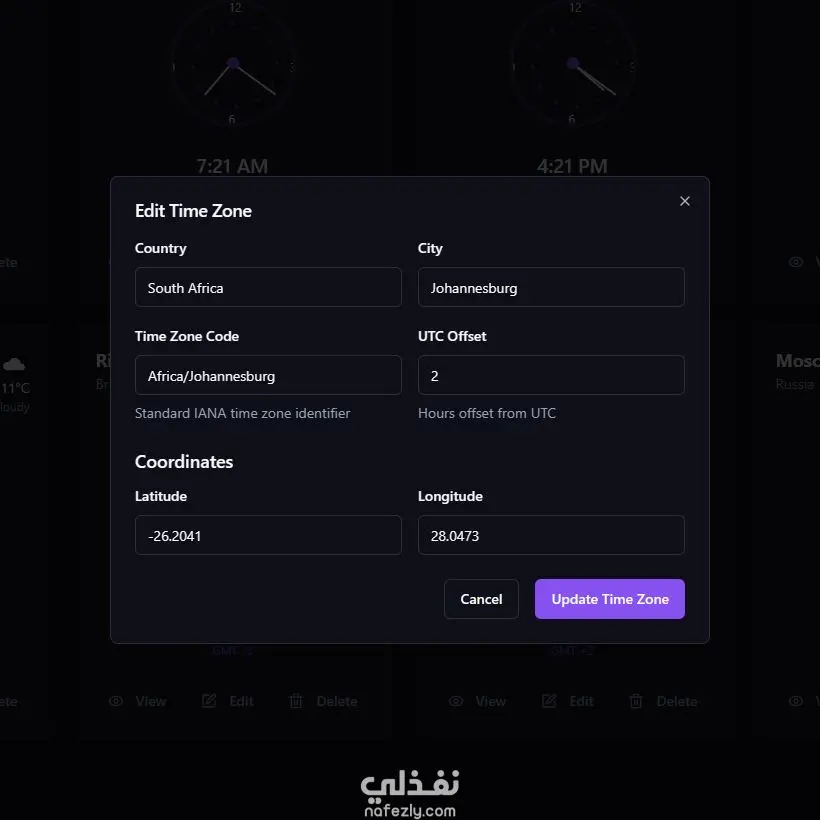 المميزات: عرض Real-time: يشوف الوقت الحالي في أي مكان في العالم. ساعات تفاعلية: بشكل حديث مع animations. تسجيل الدخول والمصادقة: باستخدام OTP. دعم اللغات: العربي والإنجليزي. بحث سهل: تقدر تدور على أي دولة بسرعة. خرائط جوجل: علشان تشوف مكان الدولة.