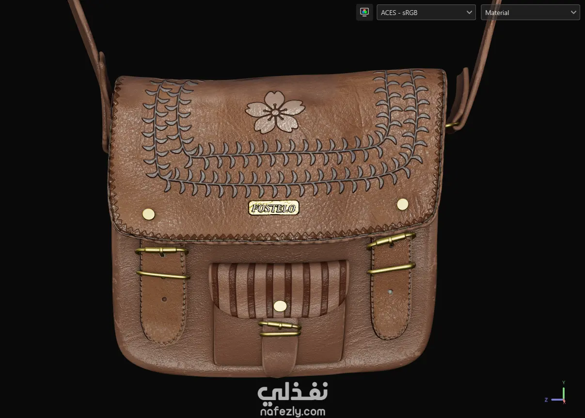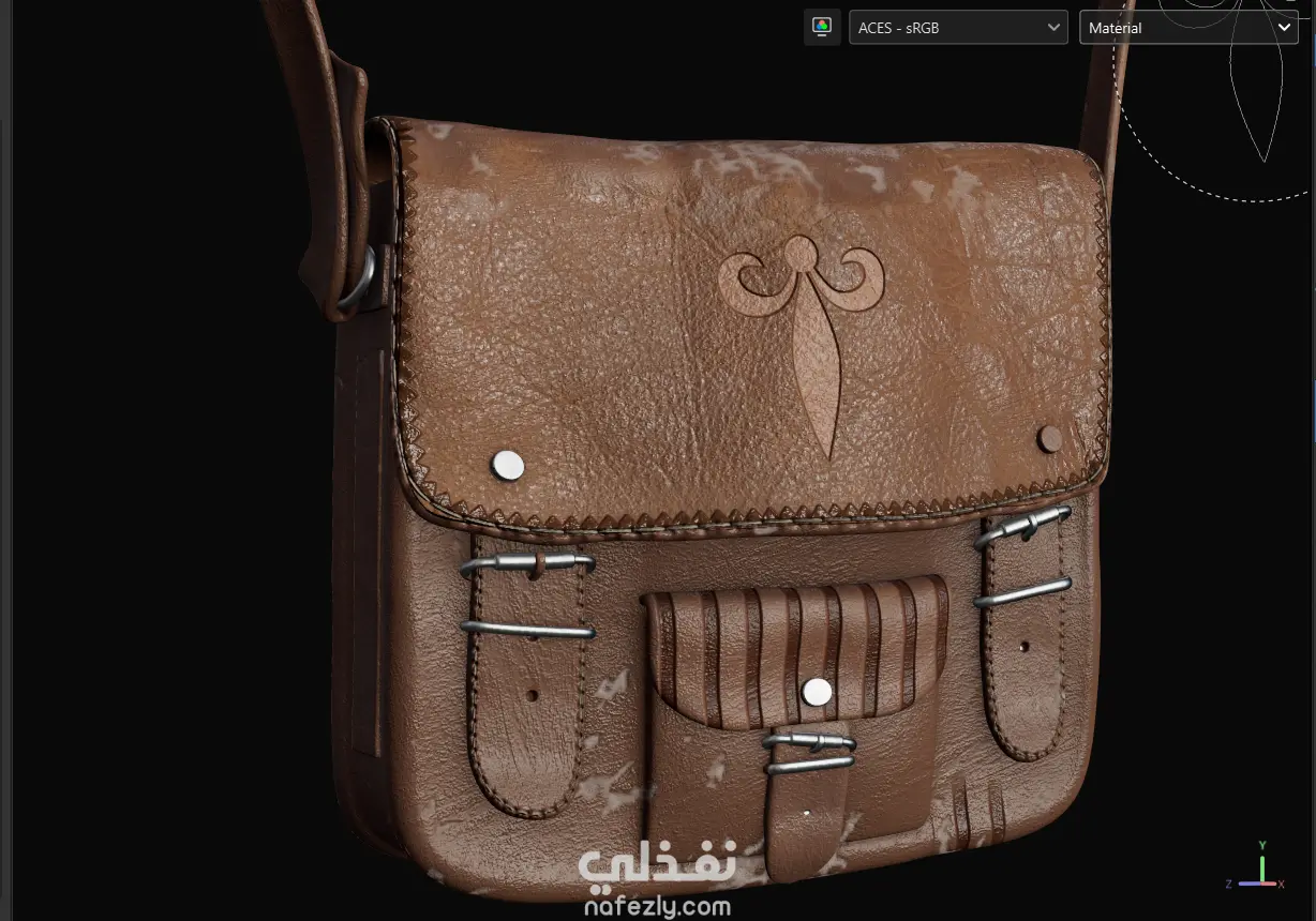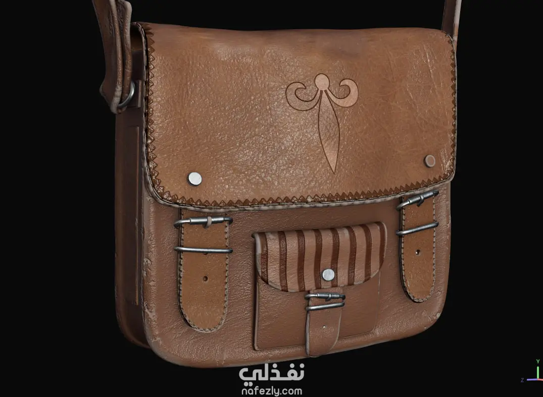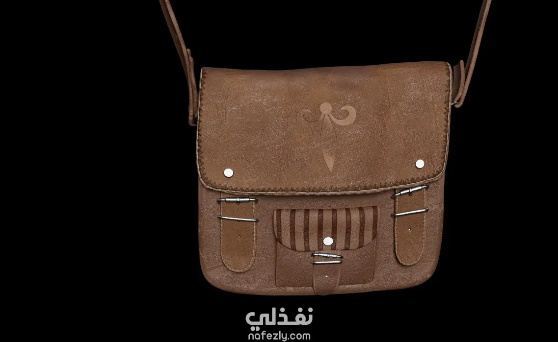 النتيجة النهائية تُظهر حقيبة عالية الجودة بملمس واقعي وتفاصيل دقيقة مناسبة للمشاهد القريبة، الألعاب، أو المشاريع الإعلانية.