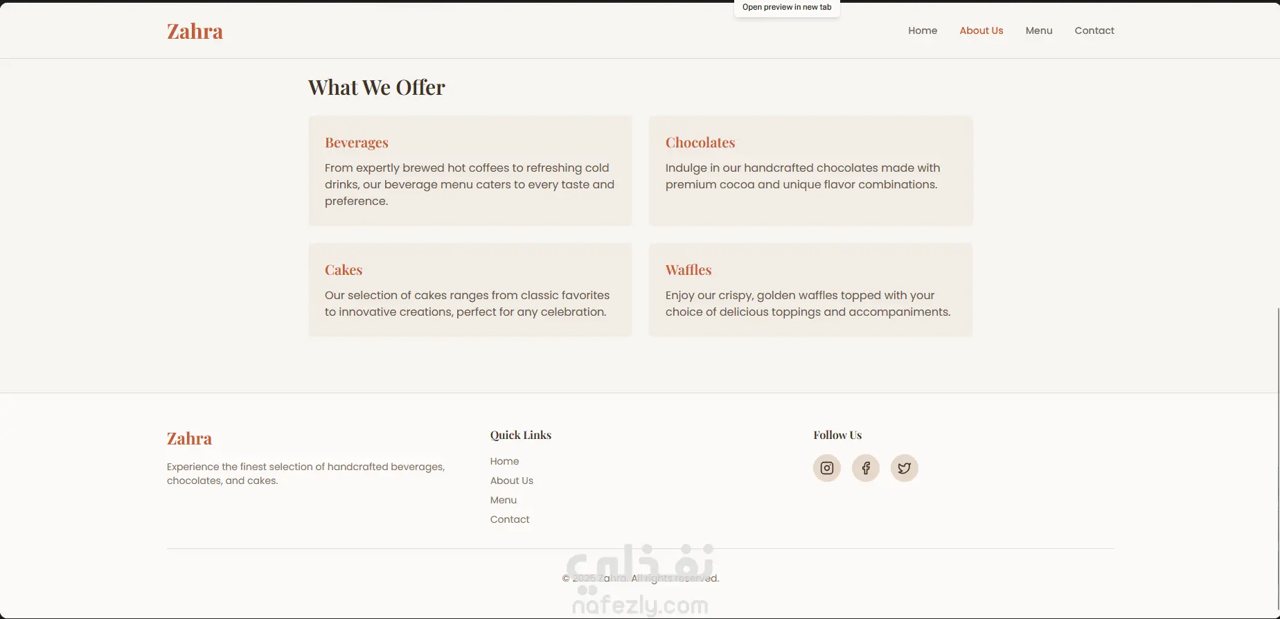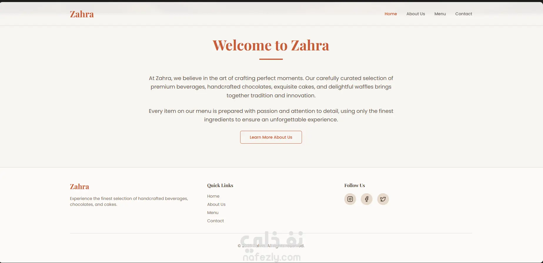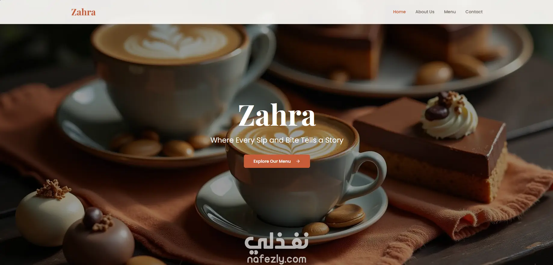 صفحات يمكن إنشاؤها لك:الصفحة الرئيسية (Home)-من نحن (About)-الخدمات أو المنيو (Menu / Services)-صفحة التواصل (Contact)