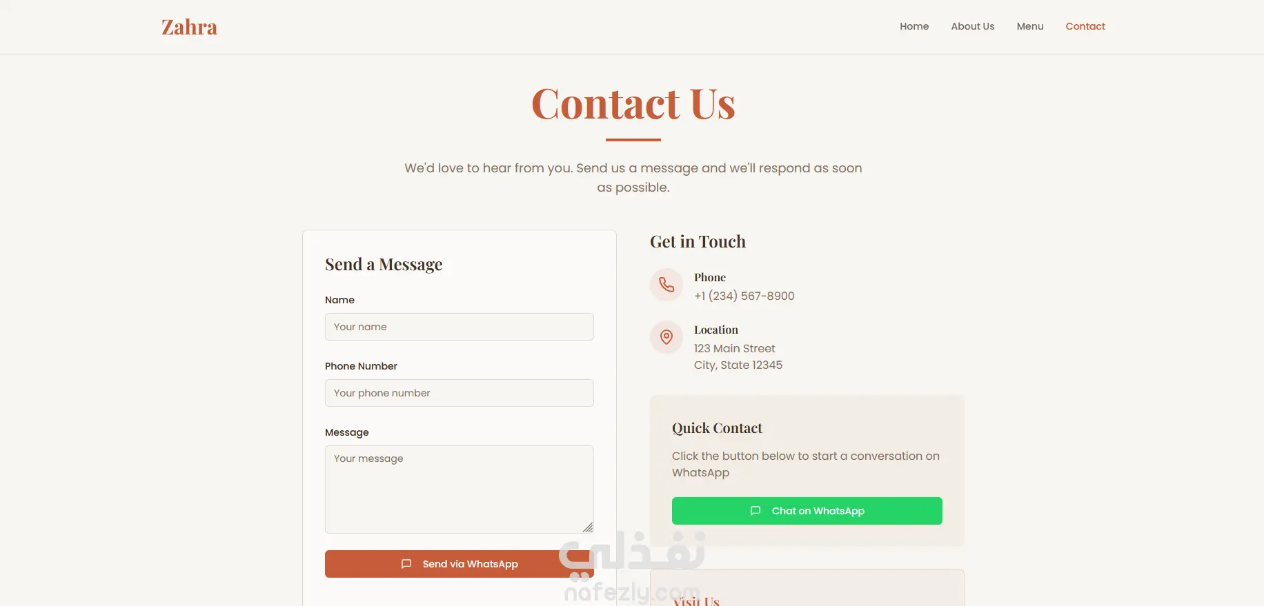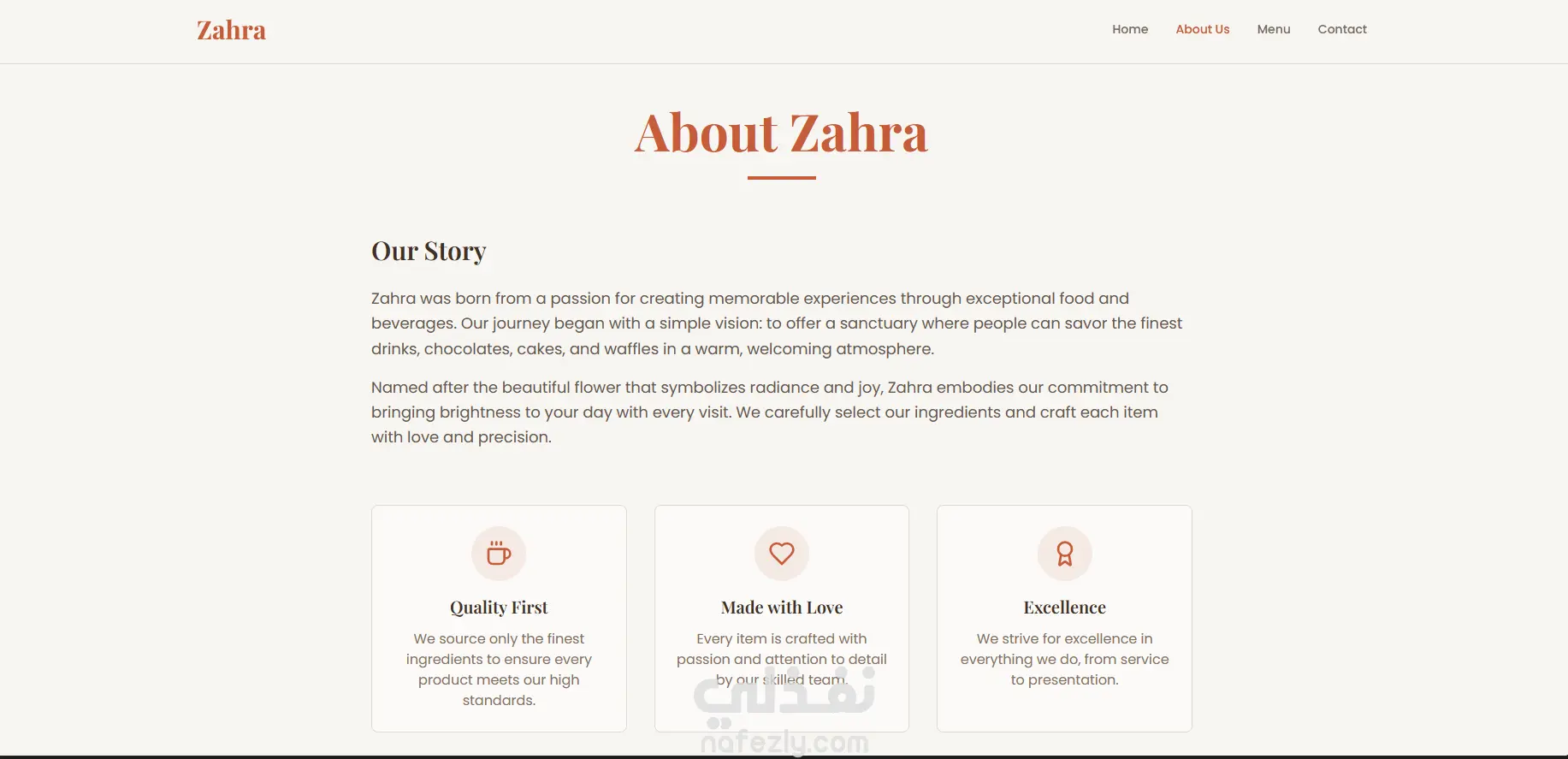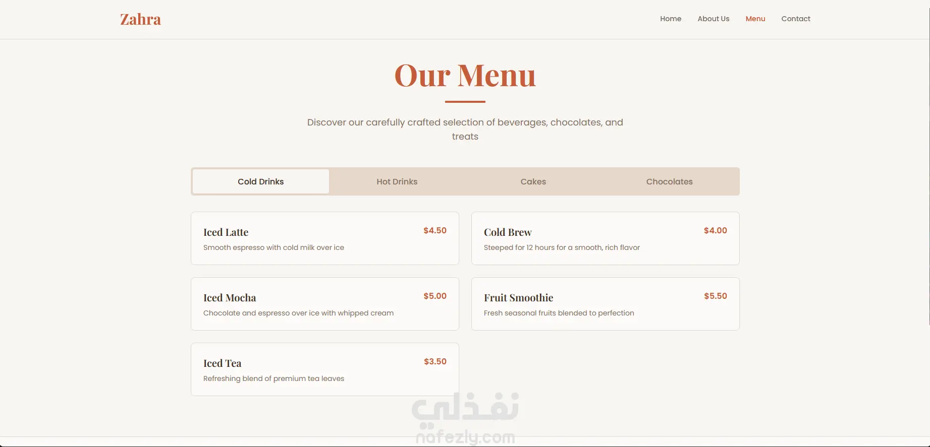 صفحات يمكن إنشاؤها لك:الصفحة الرئيسية (Home)-من نحن (About)-الخدمات أو المنيو (Menu / Services)-صفحة التواصل (Contact)