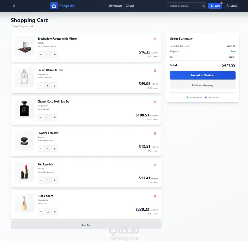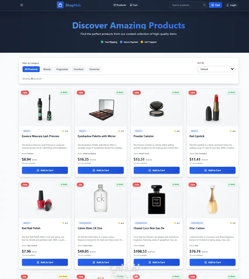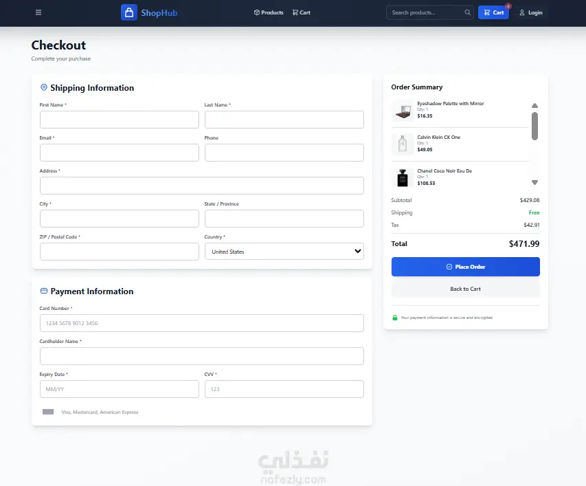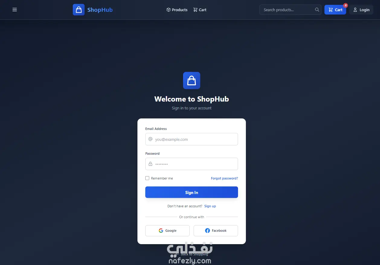 ShopHub - منصة التجارة الإلكترونية الحديثة وصف المشروع ShopHub هو موقع تجارة إلكترونية متكامل وعصري مبني بأحدث تقنيات تطوير الويب. الموقع يوفر تجربة تسوق سلسة واحترافية مع تصميم أنيق وسريع الاستجابة. الهدف من المشروع تم تطوير هذا الموقع لتوفير منصة تسوق إلكتروني كاملة المميزات تشمل: عرض المنتجات: استعراض مجموعة واسعة من المنتجات بتفاصيل شاملة البحث والفلترة: إمكانية البحث عن المنتجات وفلترتها حسب الفئة والسعر والتقييم سلة التسوق: نظام متكامل لإضافة المنتجات وإدارة الطلبات عملية الشراء: نظام checkout كامل مع نماذج الشحن والدفع تسجيل الدخول: صفحات تسجيل دخول وإنشاء حساب عصرية المميزات الرئيسية مميزات التسوق كتالوج منتجات شامل مع صور عالية الجودة ووصف تفصيلي نظام بحث ذكي للعثور على المنتجات بسهولة فلاتر متقدمة للتصنيف حسب السعر والفئة والتقييم صفحة تفاصيل المنتج مع معرض صور تفاعلي سلة تسوق ذكية تحفظ البيانات حتى بعد إغلاق المتصفح نظام checkout احترافي مع نماذج شحن ودفع كاملة
