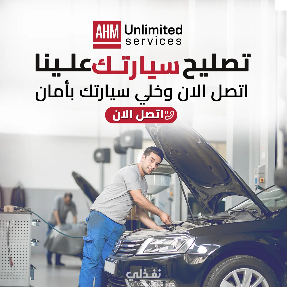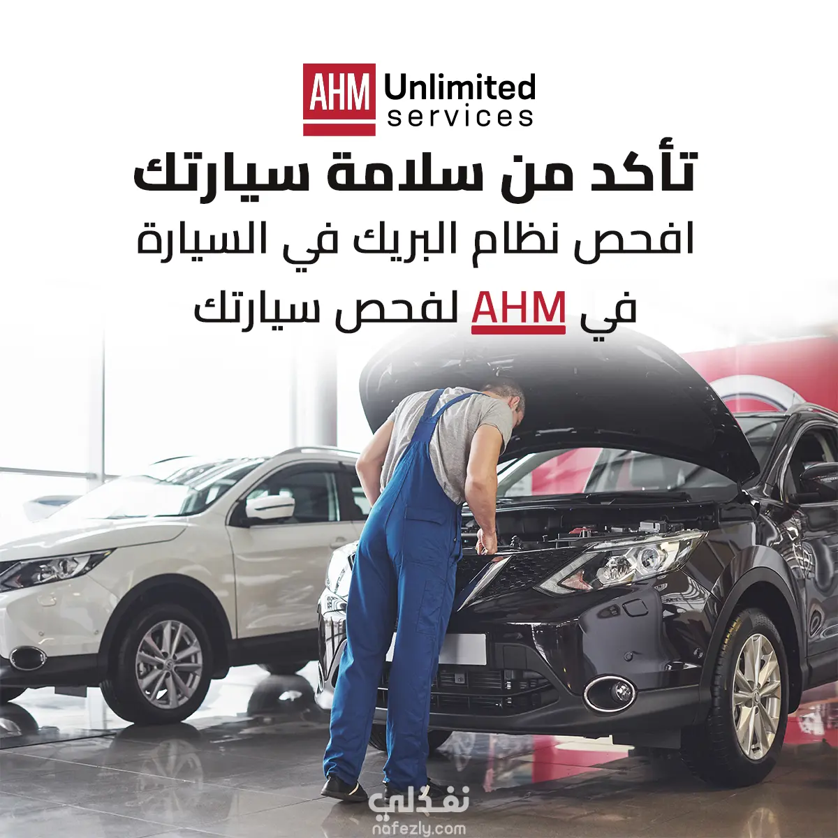 تصميم إعلان خدمة تصليح سيارات لشركة AHM Unlimited Services. تصميم بسيط وواضح يجذب الانتباه ويحفز العميل على الاتصال فورًا. استخدمت ألوان قوية وصورة تعبر عن الخدمة بوضوح.
