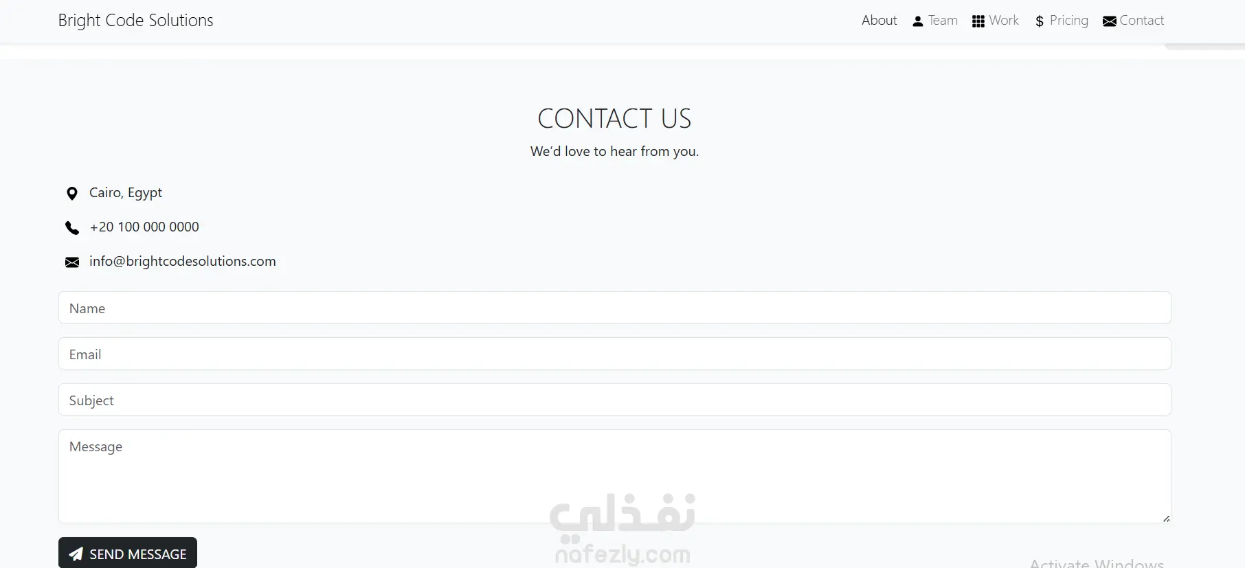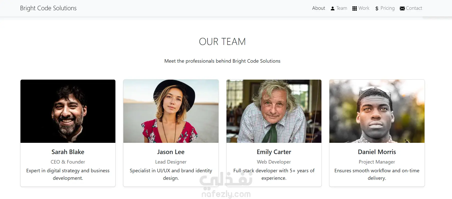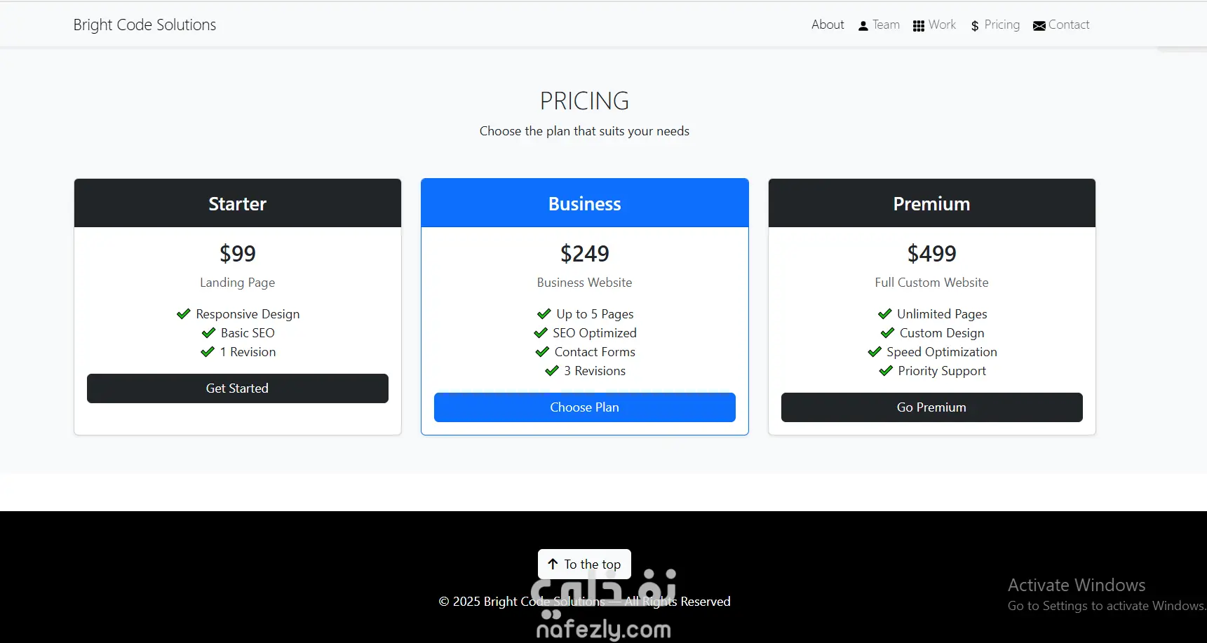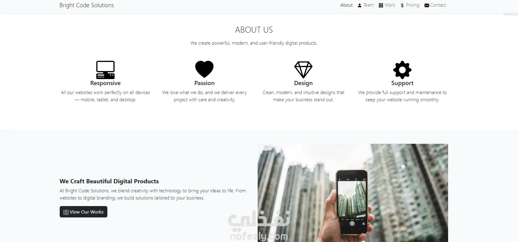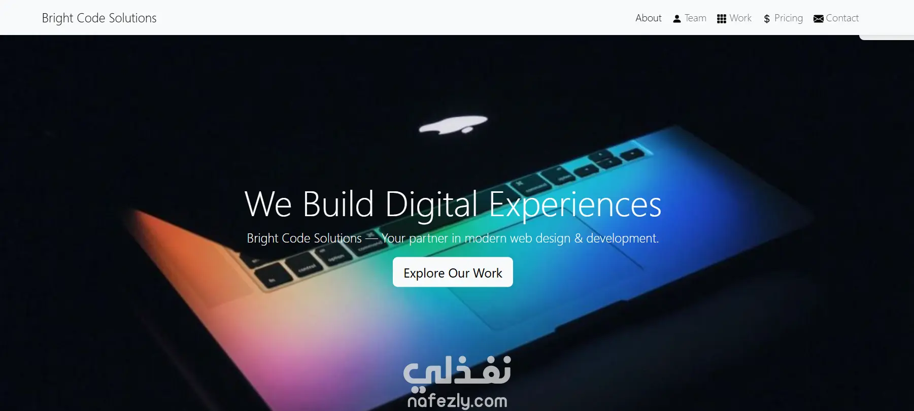 موقع شركة Bright Code Solutions مصمم لعرض خدمات الشركة الرقمية. يحتوي على صفحات About، Team، Work، Pricing، Contact بشكل جذاب ومتجاوب. تم تطويره بـ ,Bootstrap,HTML، CSS، JS ونشره مباشرة على الإنترنت.