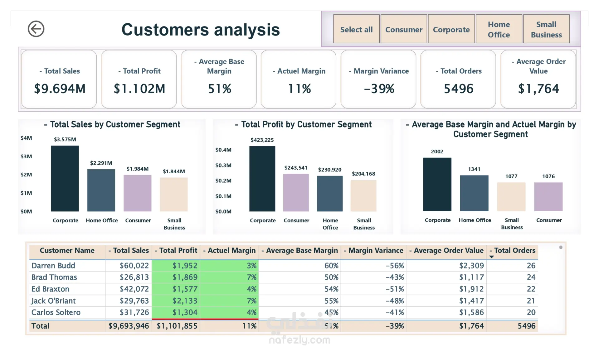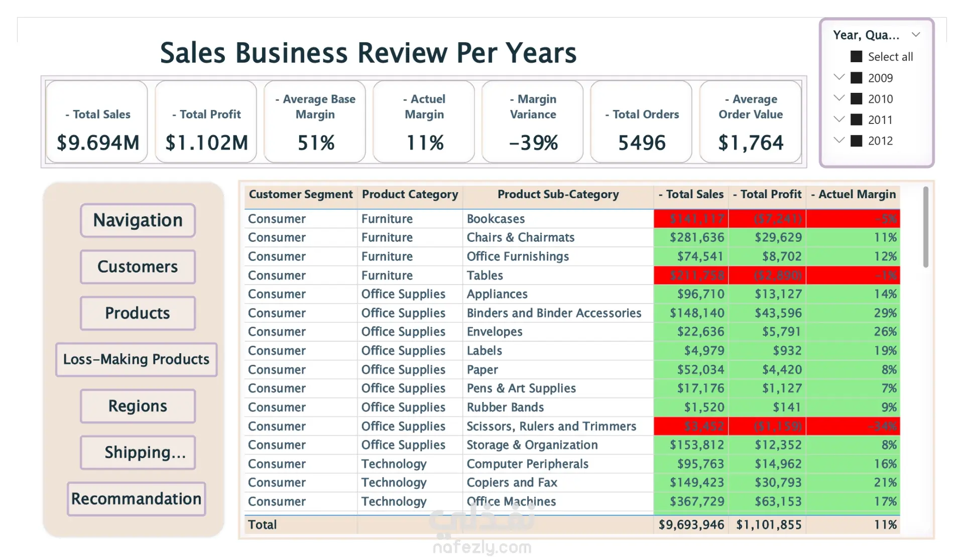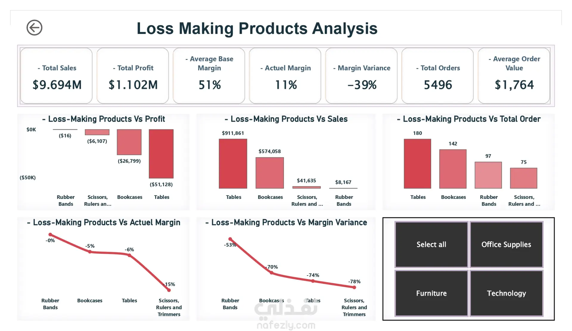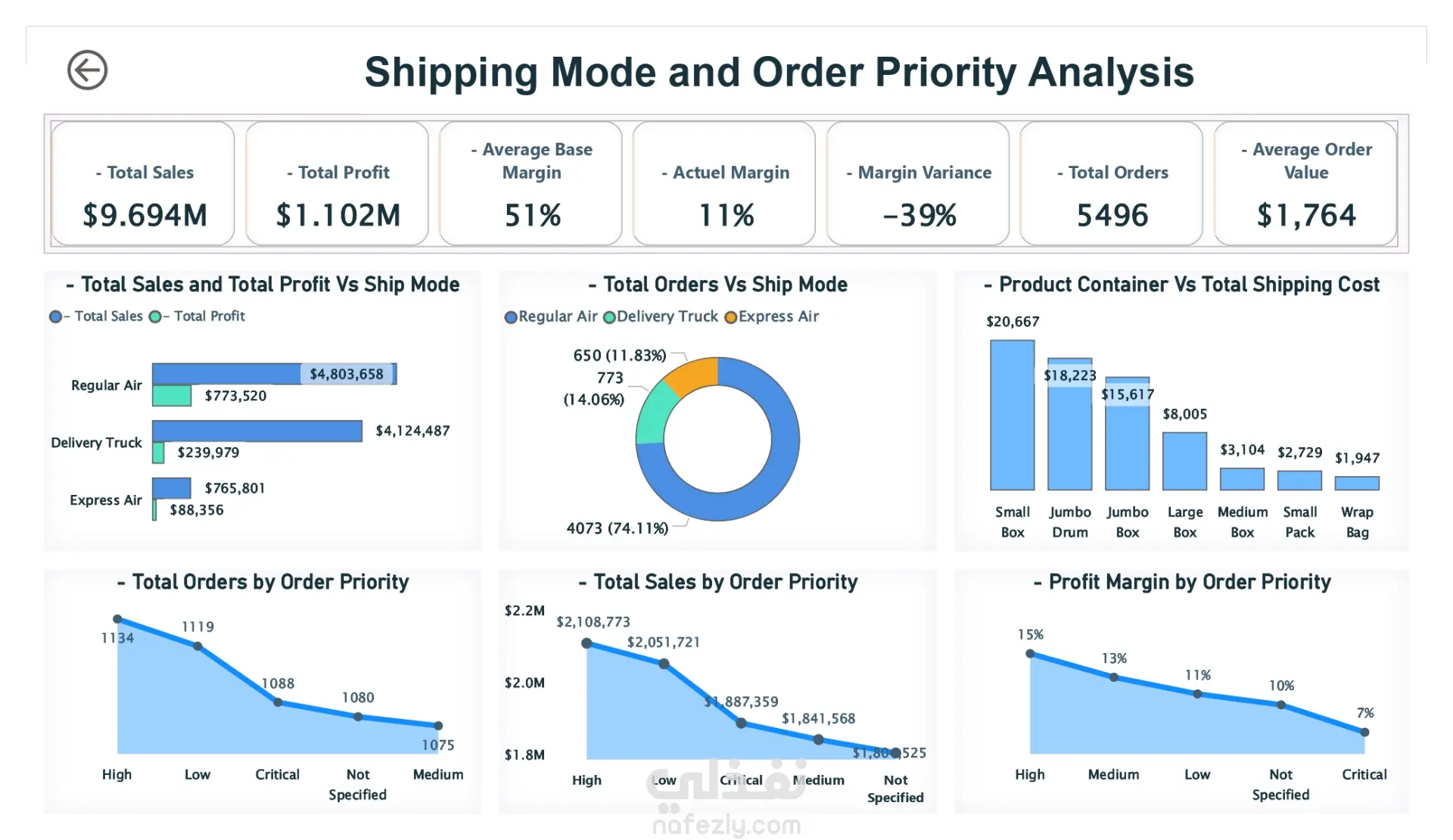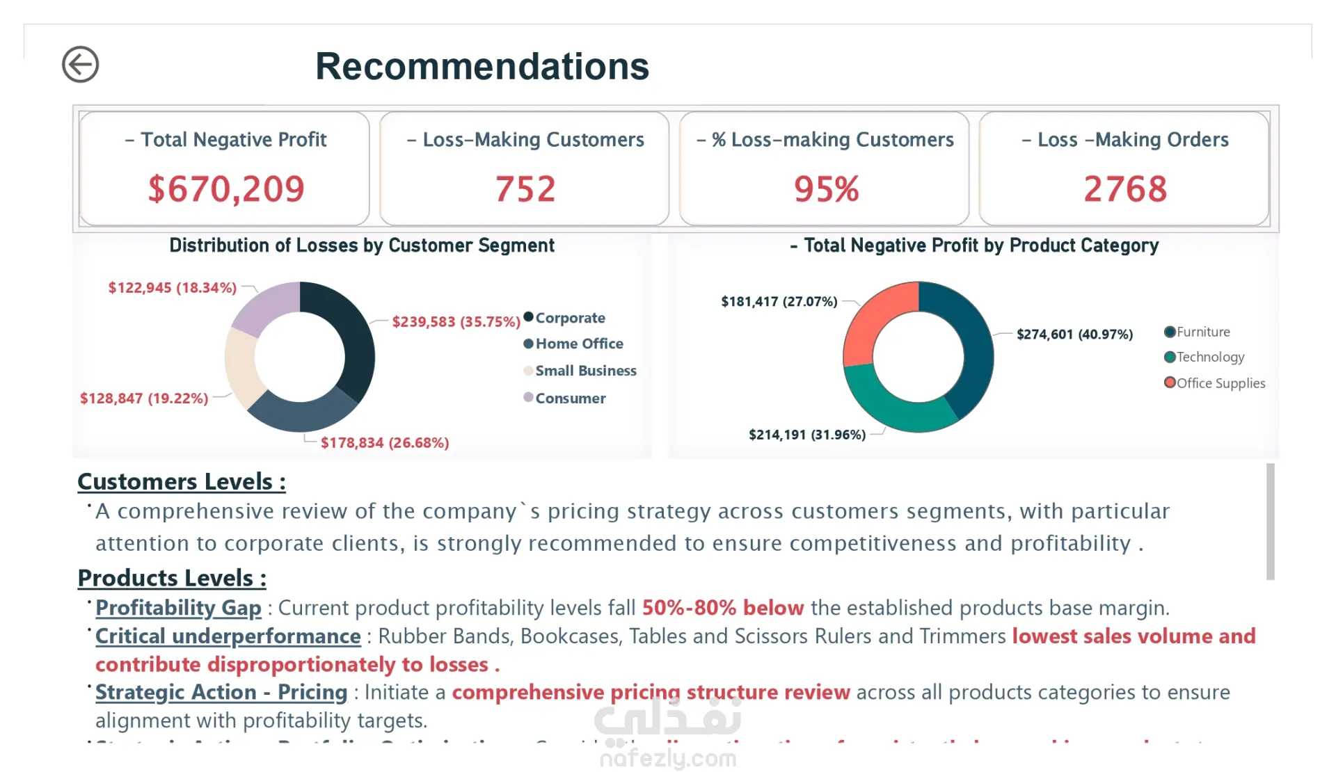 - تحليل مفصل يشمل تحليل العملاء - تحليل المنتجات - تحليل المنتجات الخاسرة - تحليل المناطق الأكثر والأقل مبيعاً - تحليل وضعيات الشحن وأولوية الطلبات - توصيات على مستوى العملاء - المنتجات - المناطق.