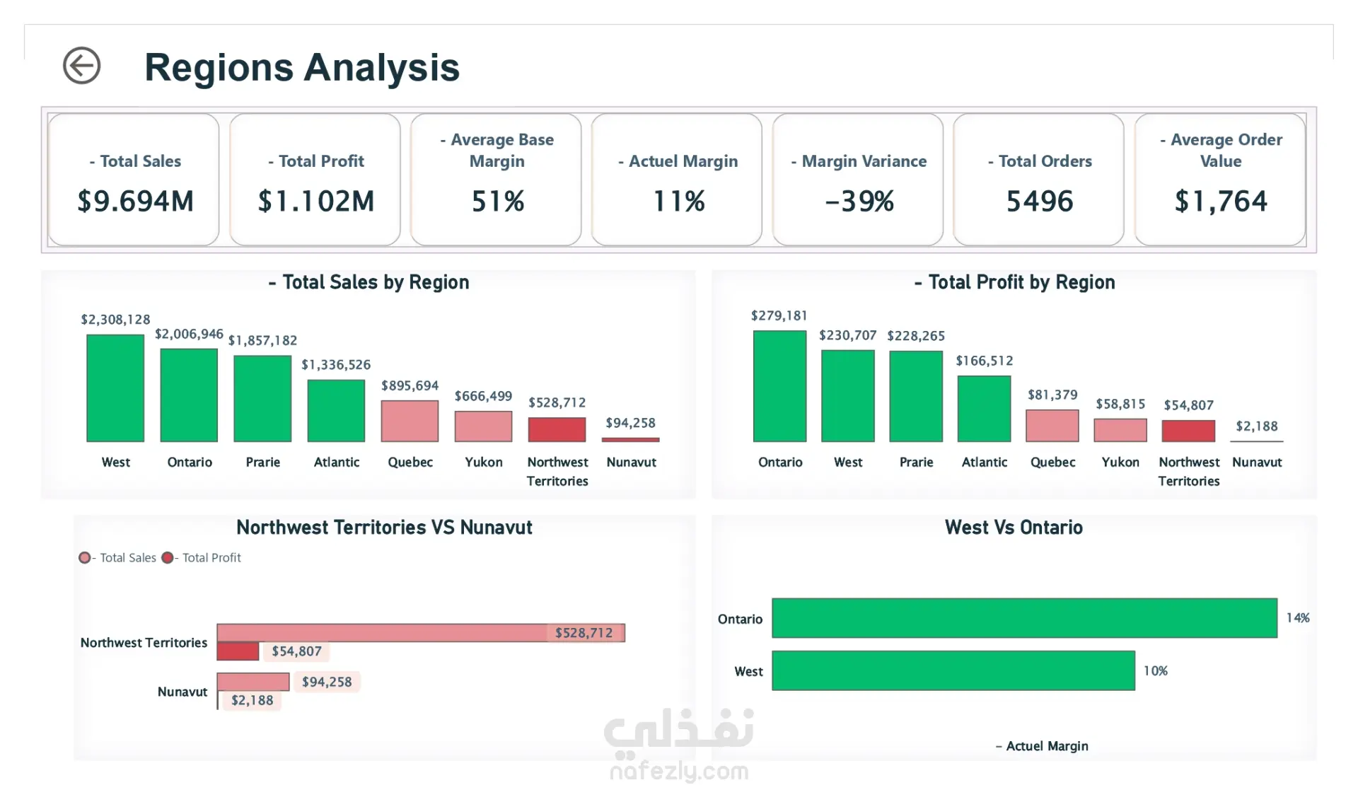 - عمل Dax Mesures لحساب مؤشرات الأداء الرئيسية (KPIs) إجمالى المبيعات - إجمالي الأرباح - متوسط هامش الربح الأساسى - هامش الربح الفعلي - إنحراف الهامش بين (هامش الربح الأساسى والهامش الفعلي) - عدد الطلبات - متوسط قيمة الطلب.