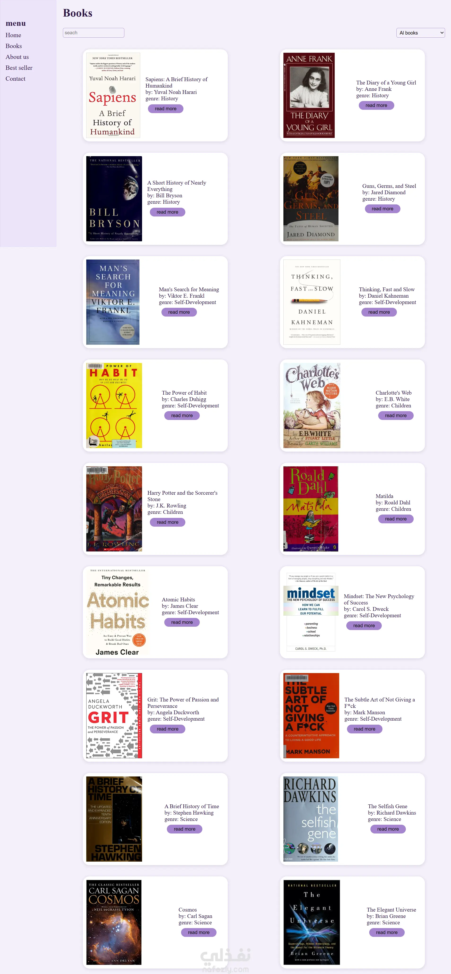 تم إنشاء موقع يعرض مجموعات الكتب بطريقة منظمة وجذابة، مع التركيز على تسهيل تصفح الأقسام المختلفة مثل الرئيسية، الكتب، من نحن، الأكثر مبيعًا، والتواصل. اعتمد العمل على HTML وCSS لتصميم واجهة متجاوبة تعمل بسلاسة على مختلف الأجهزة، مع اهتمام كبير بتناسق الألوان، وضوح المحتوى، وسهولة الانتقال بين الصفحات، مما يمنح المستخدم تجربة تصفح مريحة وممتعة. كما تم إضافة JavaScript لتوفير وظائف تفاعلية، مثل البحث الفوري عن الكتب والفلترة حسب الأقسام أو الفئات، مما يسهّل على المستخدم الوصول إلى ما يبحث عنه بسرعة وكفاءة. الموقع مصمم ببنية كود نظيفة ومرنة تتيح تطويره مستقبلًا وإضافة مزيد من الخصائص التفاعلية بسهولة، مثل التقييمات أو قائمة المفضلة، دون التأثير على أداء أو تصميم الموقع الحالي.