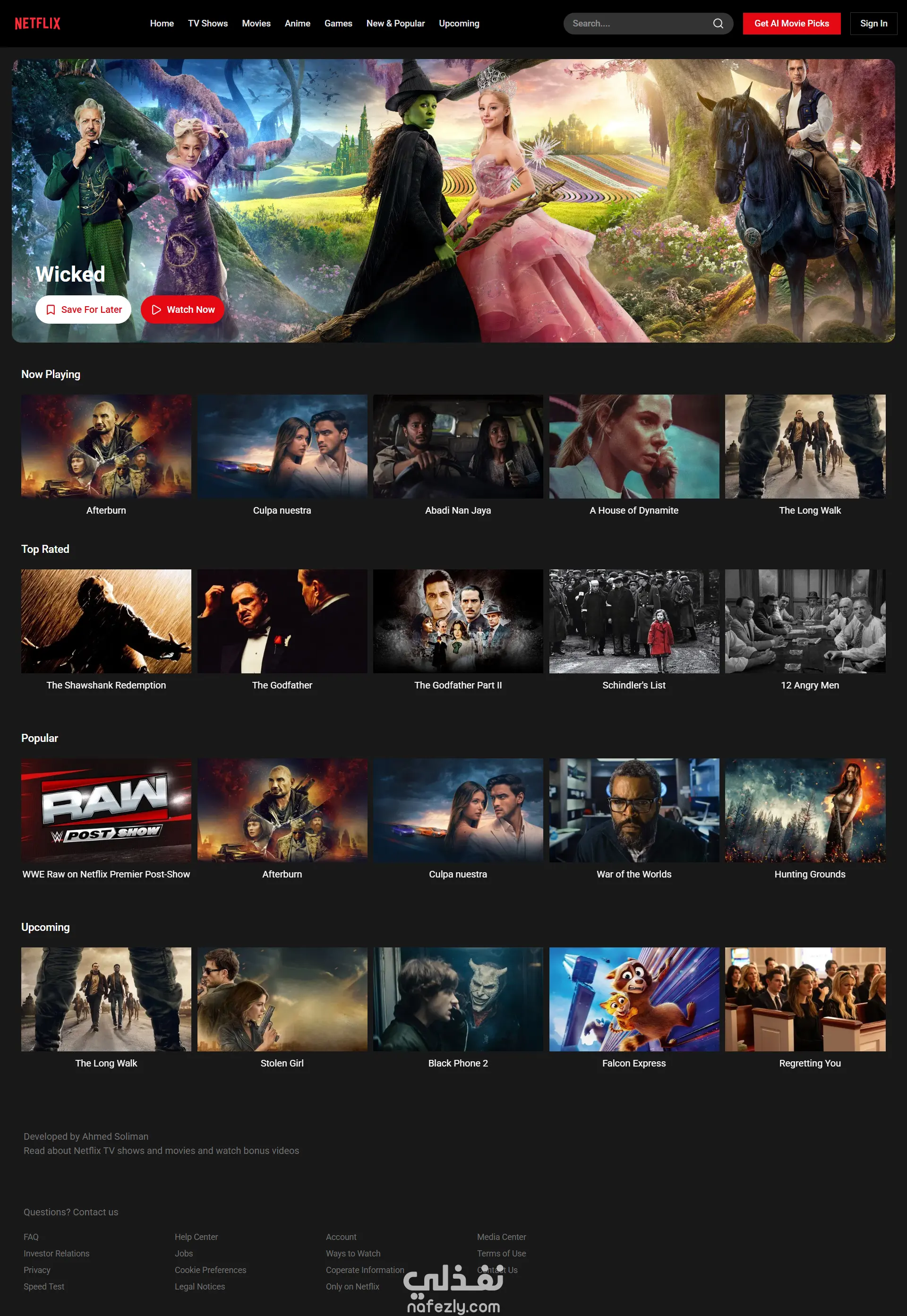 في هذا المشروع، تم تطوير نسخة مشابهة لموقع Netflix تسمح للمستخدمين بتصفح مكتبة واسعة من الأفلام والمسلسلات، مشاهدة المحتوى حسب الطلب، وإدارة قائمة المشاهدة الخاصة بهم. يوفر الموقع واجهة استخدام حديثة وسلسة مع تصميم متجاوب يعمل بكفاءة على مختلف الأجهزة (موبايل، تابلت، وديسكتوب).