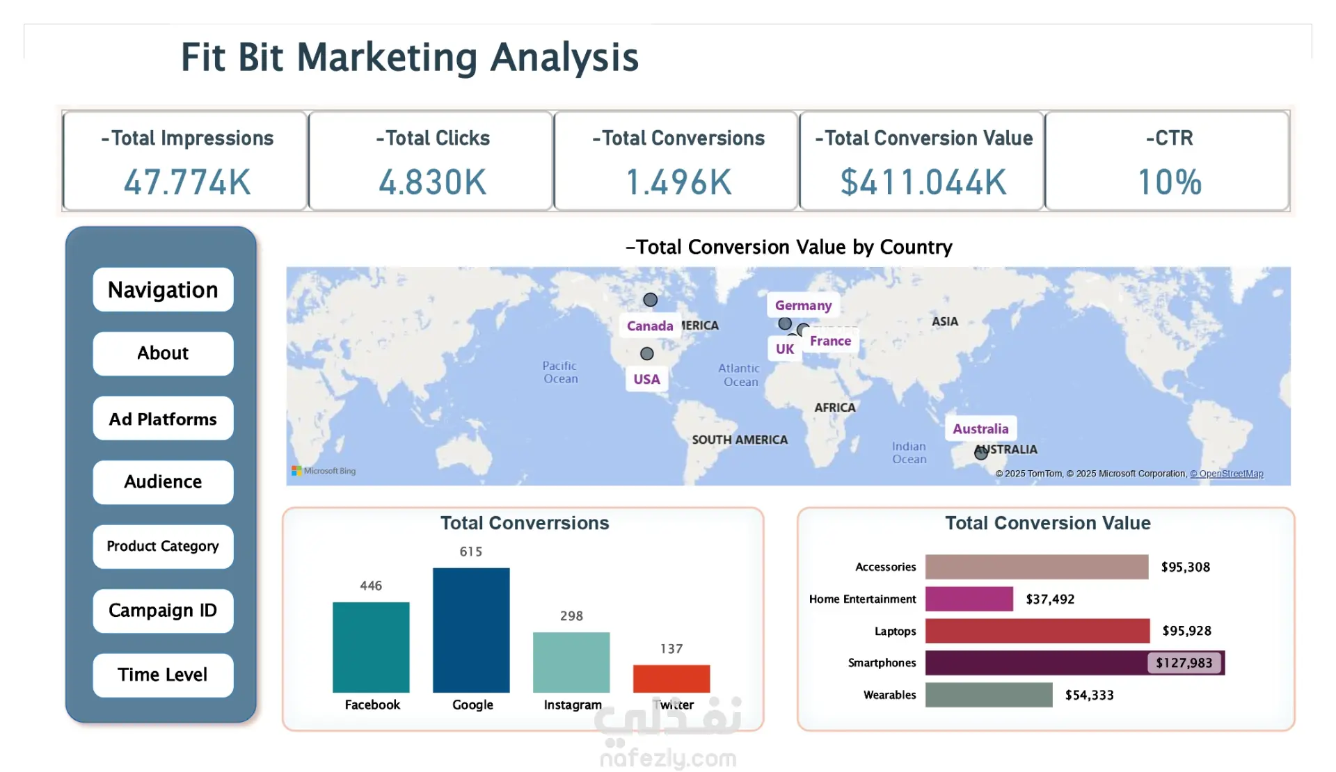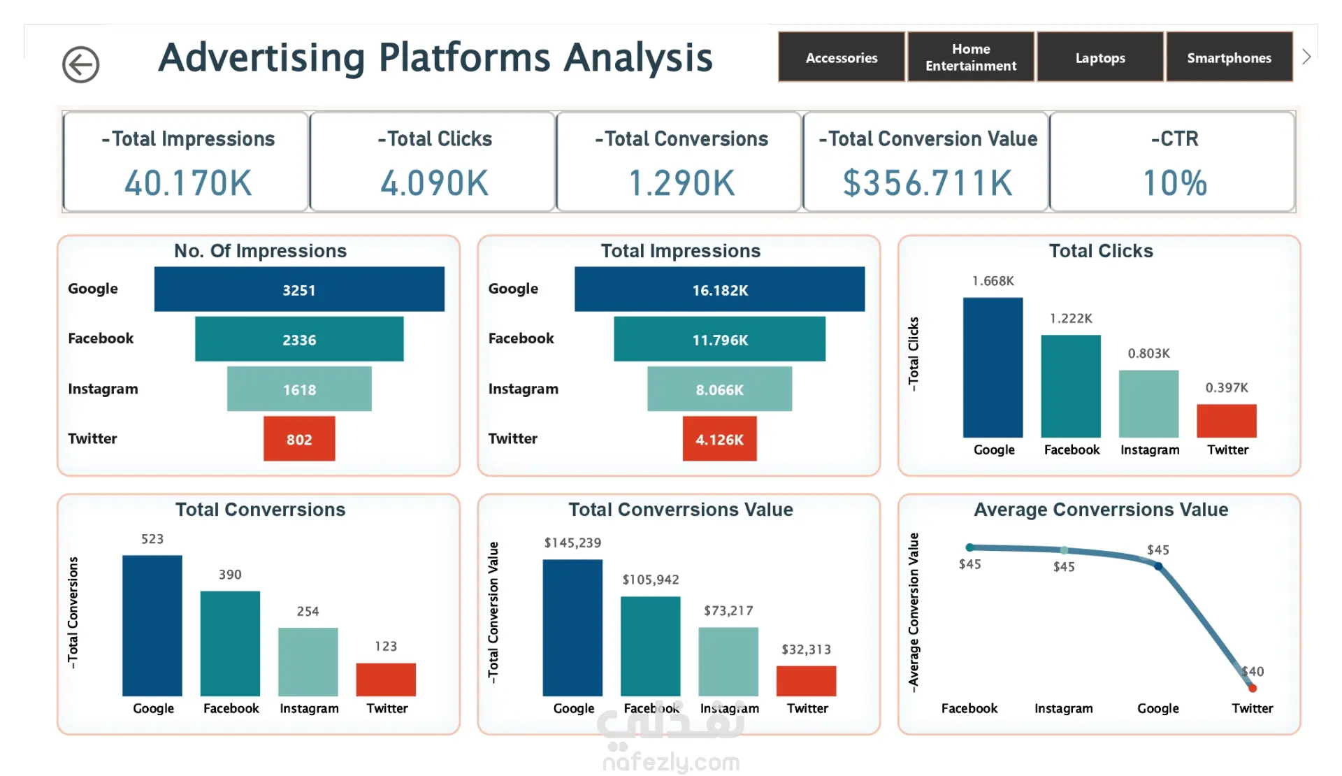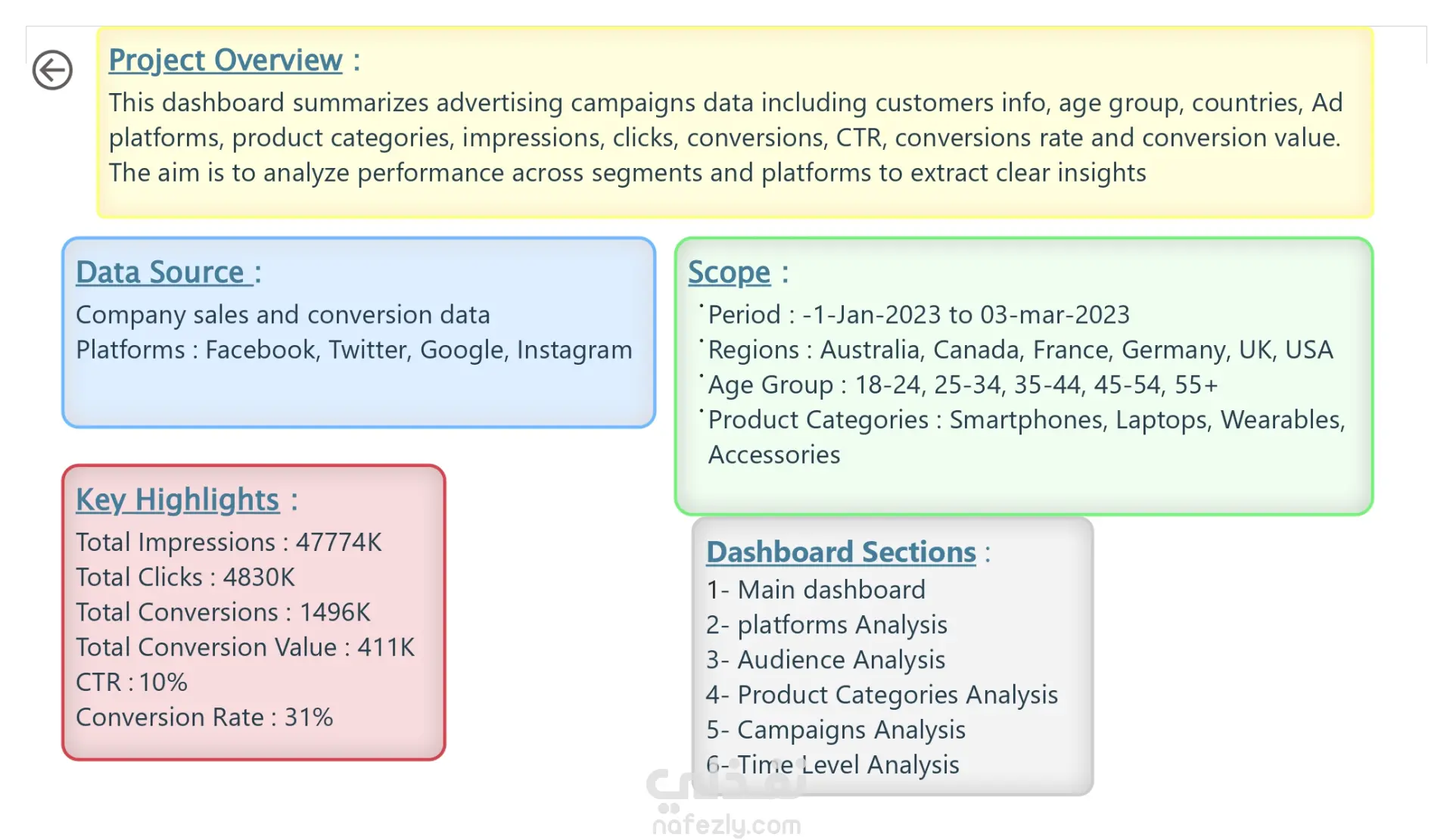 - تحليل مفصل يشمل تحليل منصات الإعلانات - تحليل الجمهور المستهدف - تحليل فئات المنتجات - تحليل الحملات الإعلانية - التحليل الزمنى.