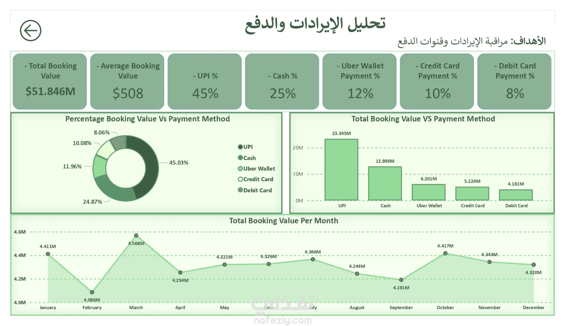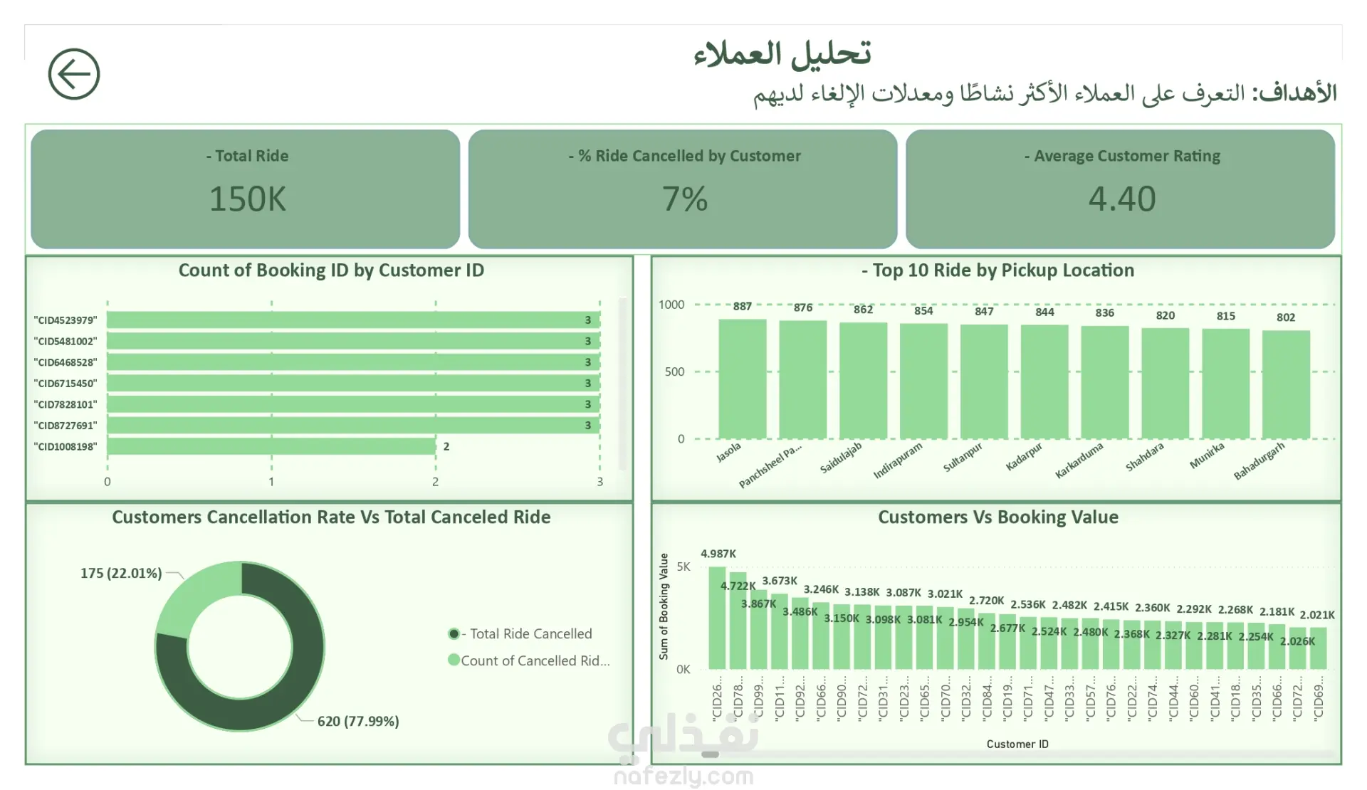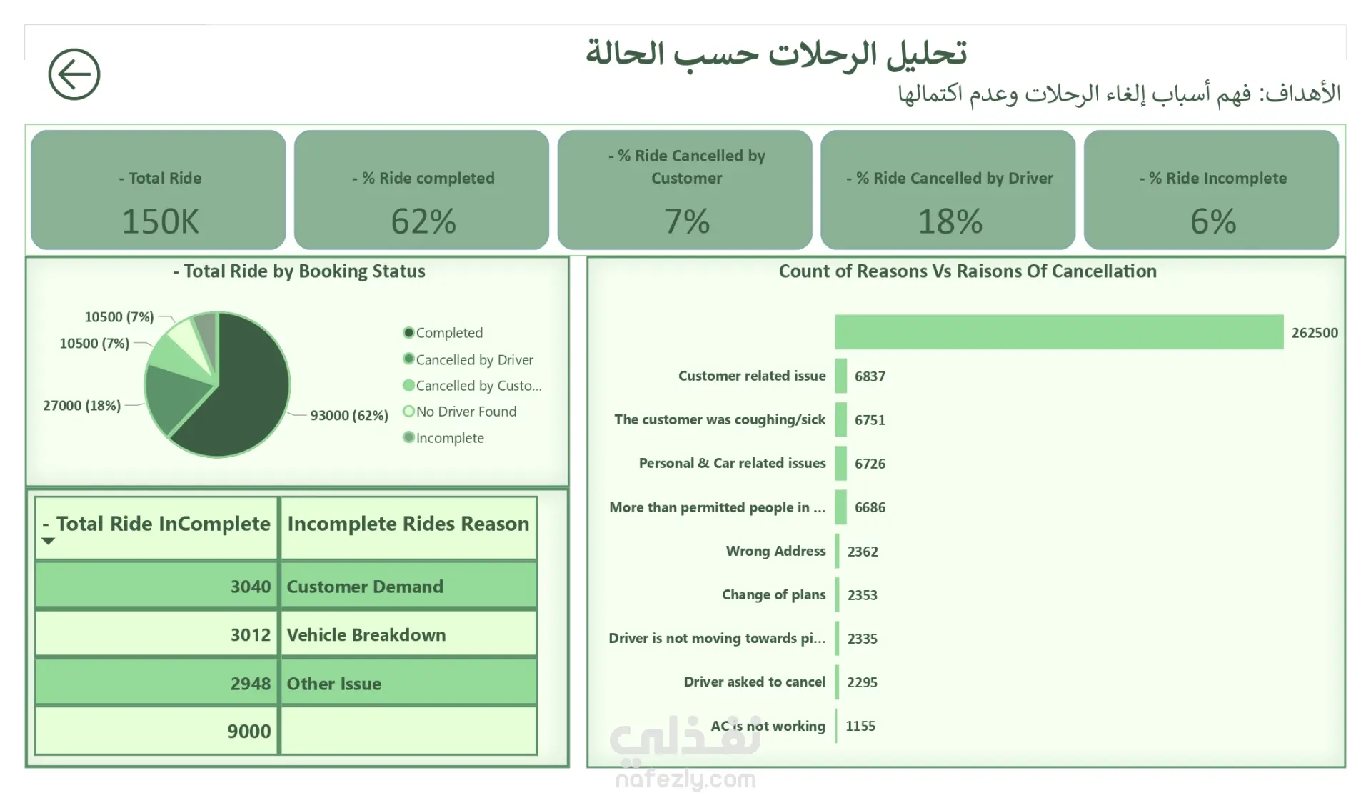 - عمل Dax Mesures لحساب مؤشرات الأداء الرئيسية (KPIs) (اجمالى عدد الرحلات - اجمالى قيمة الرحلة - اجمالى الرحلات المكتملة - اجمالى الرحلات غير المكتملة - اجمالى الرحلات الملغاه - متوسط زمن وصول السيارة إلى العميل - متوسط زمن إكمال الرحلة - نسبة الرحلات المكتملة - نسبة الرحلات غير المكتملة - نسبة الرحلات الملغاه من العميل - نسبة الرحلات الملغاه من السائق - متوسط تقييم العملاء - متوسط تقييم السائق - متوسط الرحلات الملغاه من السائق - اجمالى عدد الرحلات حسب نوع السيارة - متوسط زمن وصول السيارة إلى العميل حسب نوع السيارة - متوسط مسافة الرحلة - المدة المستغرقة لأسرع رحلة - المدة المستغرقة لأبطئ رحلة - اجمالى قيمة الرحلات - متوسط قيمة الحجوزات - نسبة الدفع على حسب قنوات الدفع لعدد 5 قنوات دفع ).