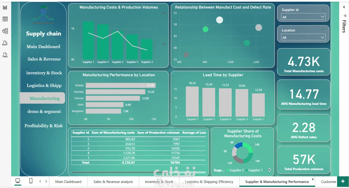 تتضمن الداشبورد تحليلًا شاملًا لتكاليف التصنيع، أحجام الإنتاج، أزمنة التوريد، معدلات العيوب، وأداء الموردين حسب الموقع.
