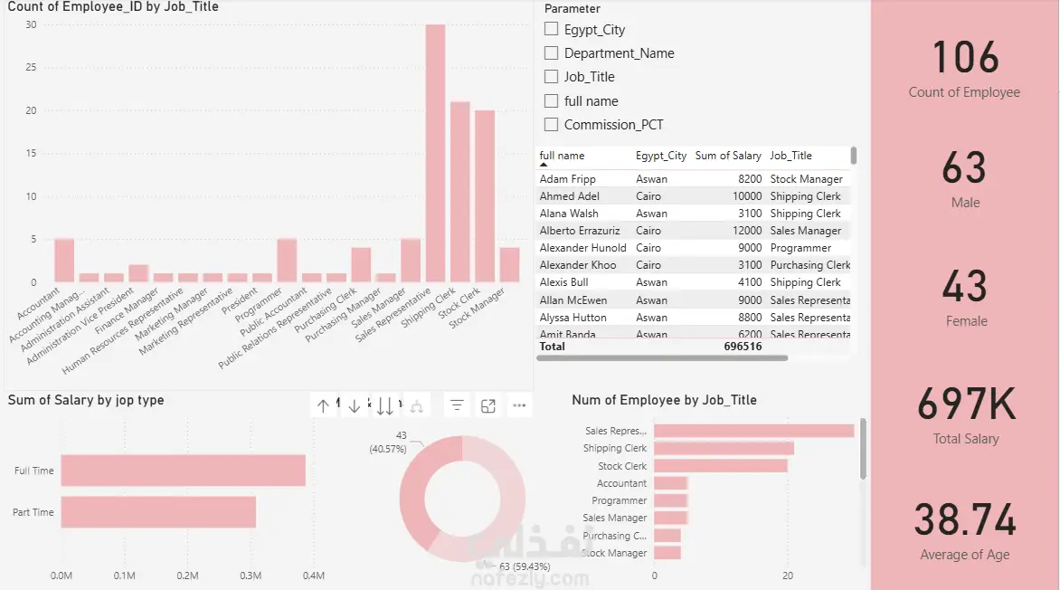 الداشبورد تُمكن الإدارة من متابعة عدد الموظفين، توزيعهم حسب الوظائف، الجنس، نوع العمل (دوام كامل أو جزئي)، بالإضافة إلى تحليل الرواتب وإجمالي تكلفة الأجور.