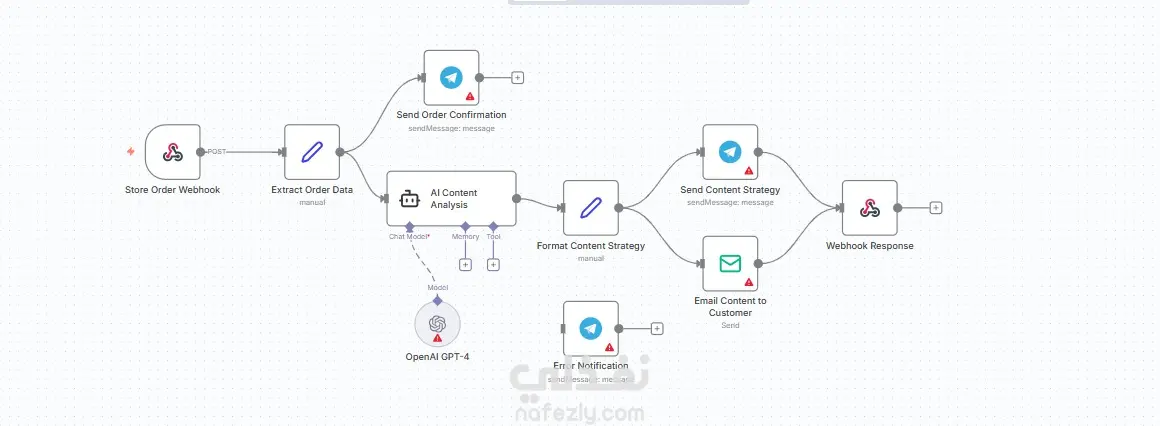 هذا المشروع عبارة عن عميل ذكي (AI Agent) يعمل عبر منصة n8n، مخصّص للأعمال التي تقدّم خدمات المحتوى. يستقبل الطلبات من المتجر، يرسل تأكيد للعميل على تيليجرام، يُنشئ استراتيجية محتوى كاملة باستخدام الذكاء الاصطناعي، ثم يرسلها إلى العميل عبر البريد الإلكتروني وتيليجرام بشكل تلقائي بالكامل. شرح سير العمل بالكامل 1. استقبال الطلبات (Webhook) يبدأ النظام من Webhook يستقبل طلبات المحتوى مباشرة من المتجر، ويأخذ كل تفاصيل العميل والمنتج. 2. استخراج وتنظيم البيانات يتم تنظيف وتنظيم بيانات الطلب مثل: اسم العميل البريد الإلكتروني معرف تيليجرام نوع المنتج متطلبات المحتوى رقم الطلب وذلك لضمان تمرير بيانات دقيقة ومنسّقة للذكاء الاصطناعي. 3. إرسال تأكيد الطلب عبر تيليجرام بمجرد استلام الطلب، يرسل الروبوت رسالة مخصصة للعميل على تيليجرام: تأكيد استلام الطلب عرض رقم الطلب إبلاغ العميل بأن الذكاء الاصطناعي بدأ إعداد الاستراتيجية 4. توليد استراتيجية المحتوى بالذكاء الاصطناعي يستخدم الروبوت Agent مبني على LangChain و GPT-4 لإنتاج استراتيجية محتوى احترافية بناءً على: نوع المنتج متطلبات العميل أهداف المحتوى الجمهور المستهدف الناتج يتضمن: ملخص تنفيذي تحليل الجمهور أنواع المحتوى المقترحة أفكار وعناوين جاهزة خطة نشر محتملة ويكون مهيكلًا بالكامل بتنسيق Markdown. 5. تجهيز الناتج وتنسيقه بعد توليد الاستراتيجية، يتم إعادة تنسيقها لتكون جاهزة للإرسال عبر: تيليجرام البريد الإلكتروني الرد النهائي للمتجر 6. إرسال الاستراتيجية للعميل عبر تيليجرام بتنسيق جميل وسهل القراءة على الهاتف. عبر البريد الإلكتروني يصل للعميل نسخة كاملة من الاستراتيجية. 7. الرد النهائي للمتجر يرسل النظام رد JSON للمتجر يحتوي على: حالة الطلب حالة الإشعارات رقم الطلب التوقيت مميزات المشروع أتمتة كاملة بدون تدخل بشري تواصل فوري عبر تيليجرام توليد استراتيجية محتوى متكاملة بالذكاء الاصطناعي إخراج احترافي بتنسيق Markdown إرسال عبر تيليجرام والبريد الإلكتروني مناسب للمتاجر الإلكترونية ووكالات المحتوى هذا المشروع مثالي للأعمال التي تريد أتمتة خدمات إنشاء المحتوى أو إضافة الذكاء الاصطناعي إلى أنظمتها
