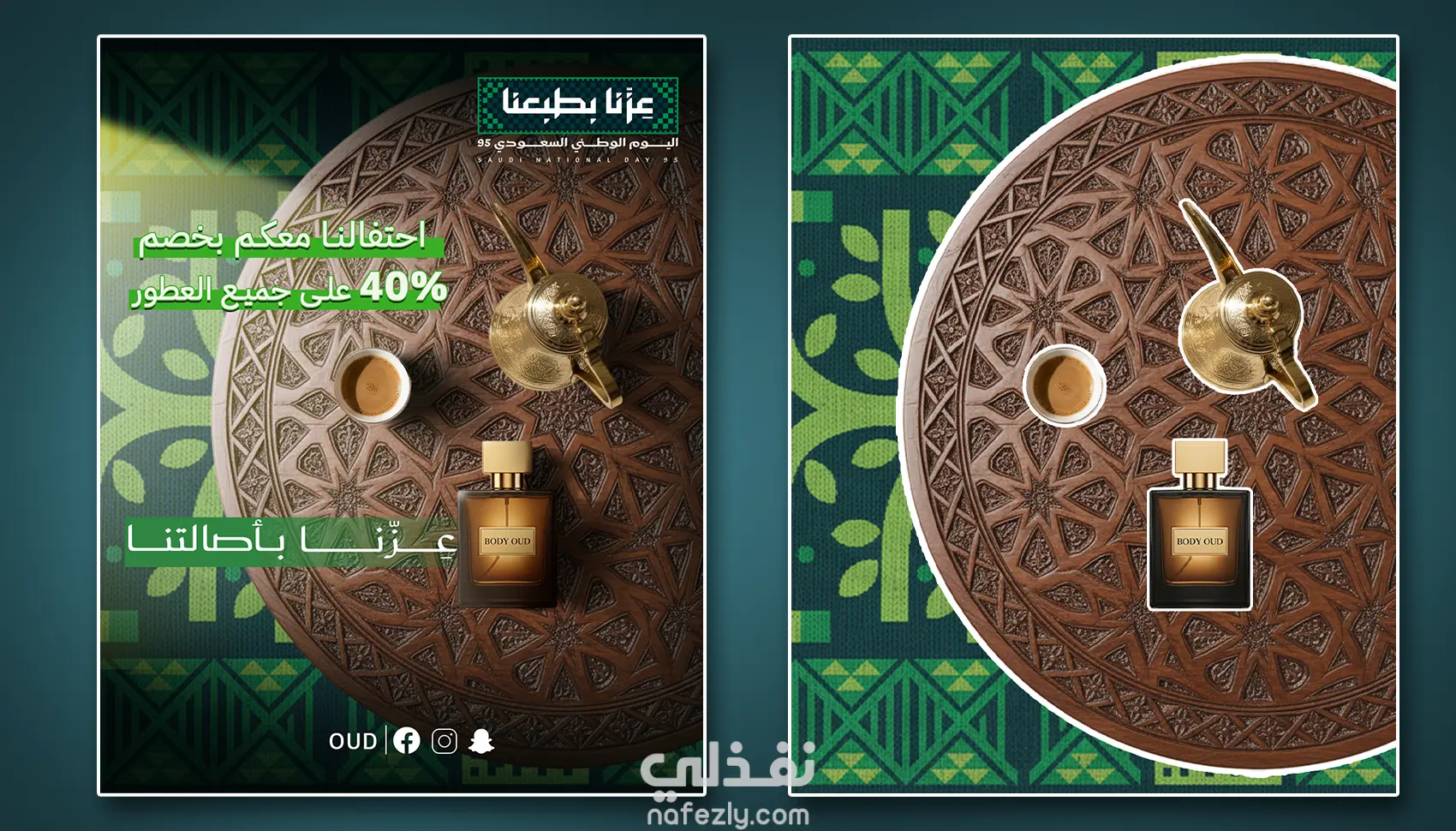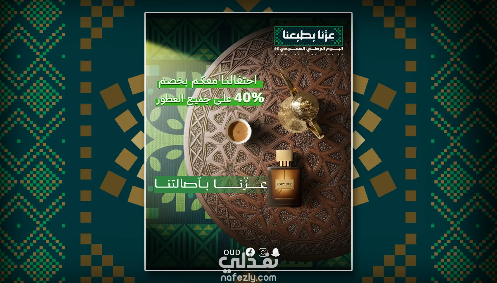 صميم إعلان سوشيال ميديا - اليوم الوطني السعودي 95 تم تصميم إعلان ترويجي لمنصة انستقرام بهدف الإعلان عن عرض خاص بمناسبة اليوم الوطني السعودي 95. تم استخدام برنامج أدوبي فوتوشوب للوصول إلى تصميم احترافي وجذاب يتناسب مع أهمية المناسبة