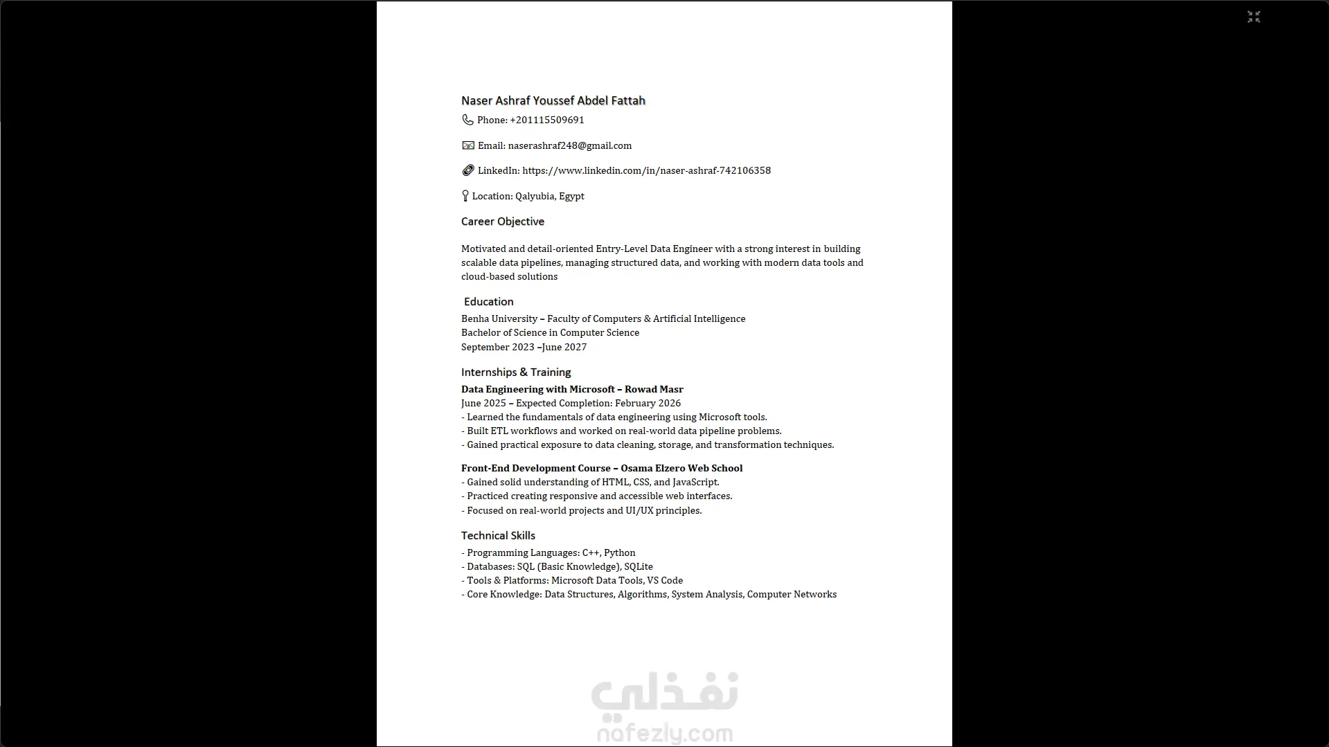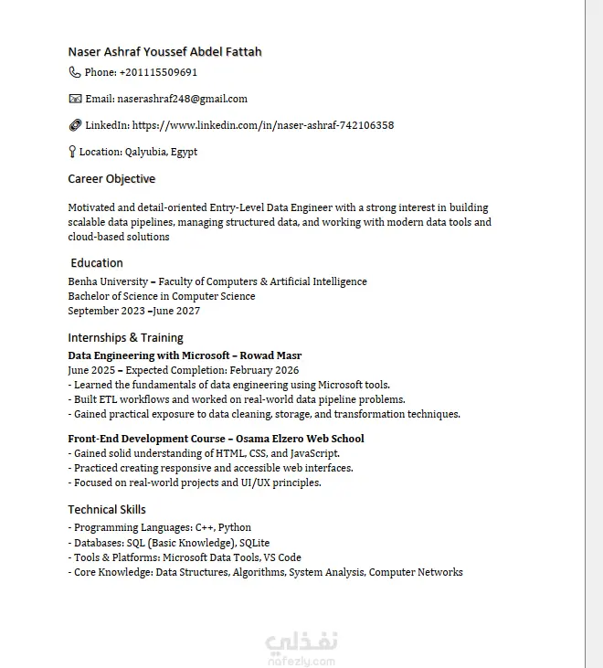 هل تحتاج إلى سيرة ذاتية (CV) قوية تساعدك في القبول بالوظائف أو التدريبات؟ أنا هعمل لك CV احترافي ومكتوب بعناية، بتنسيق جذاب وبأسلوب يناسب مجالك وخبراتك، سواء كنت طالب – خريج – صاحب خبرة – أو بتقدم في تدريب.