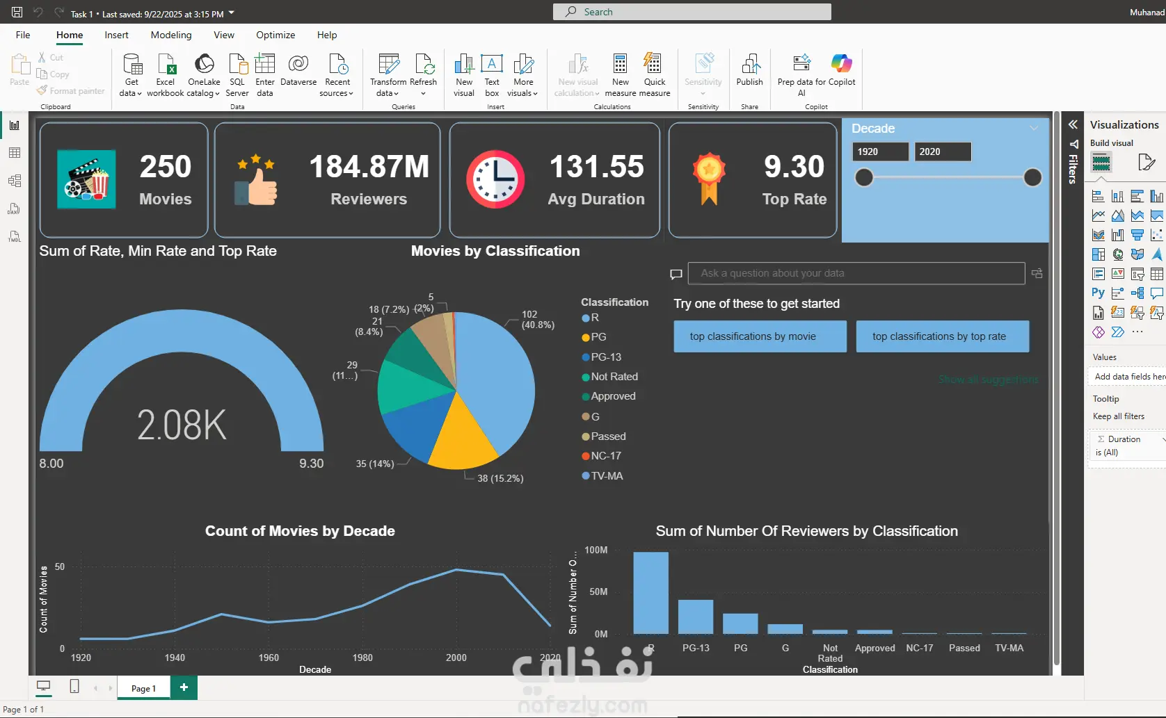 أقدّم خدمة تصميم وبناء لوحات تحكم (Dashboards) تفاعلية باستخدام Power BI بشكل احترافي يساعدك على فهم بياناتك واتخاذ قرارات أفضل. يشمل العمل: تحليل البيانات وتجهيزها للنمذجة تصميم Dashboard ديناميكي وسهل الاستخدام إضافة فلاتر تفاعلية مثل: السنوات، التصنيفات، الفترات الزمنية، ... إنشاء مخططات ورسوم بيانية (Pie – Bar – Line – Gauge) إضافة KPIs مثل: عدد الأفلام عدد المراجعين متوسط المدة أعلى تقييم تحسين المظهر العام باستخدام تصميمات عصرية ومناسبة للهوية البصرية القدرة على تصدير وعرض النتائج على Power BI Service