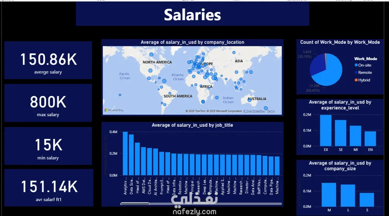 تحتوي أيضًا على خريطة تفاعلية ومخططات توضح توزيع أنماط العمل (On-site, Remote, Hybrid).