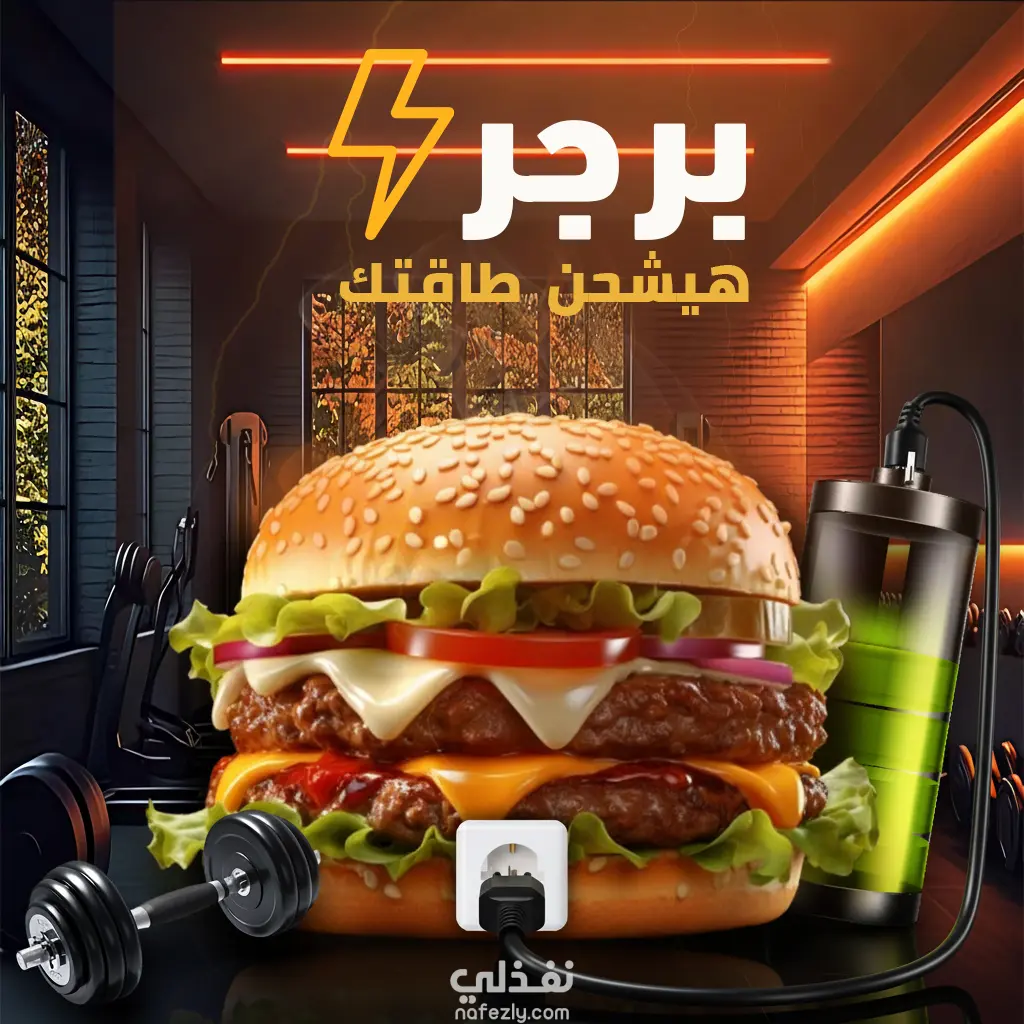 ده بوست إعلاني (Promo Post) لمطعم أو براند بيقدم ساندويتش برجر، والفكرة التسويقية هنا تعتمد على تشبيه البرجر كمصدر للطاقة زي الشحن الكهربائي، خصوصًا موجه للجيم lovers أو الناس اللي محتاجة Boost سريع.