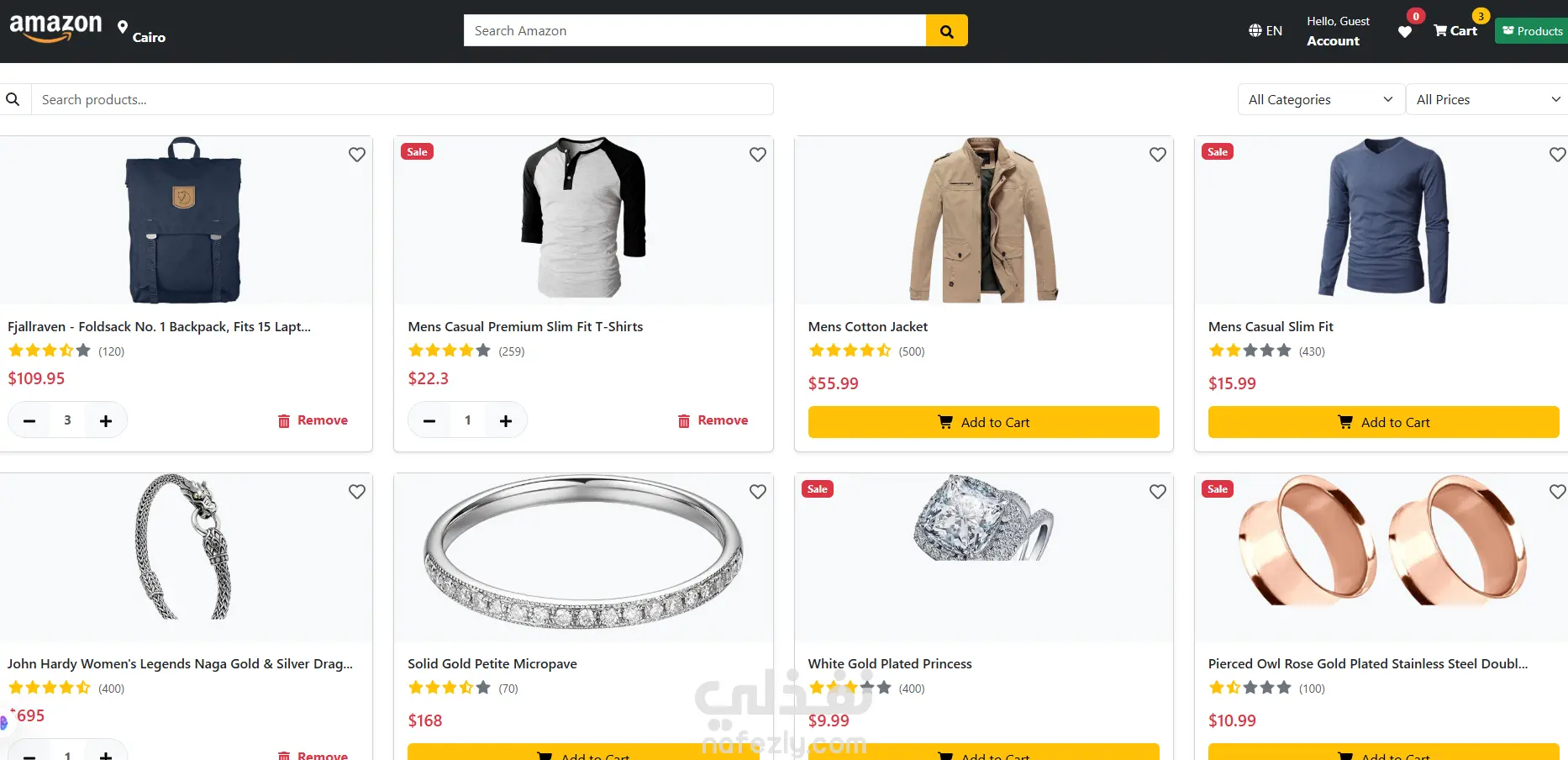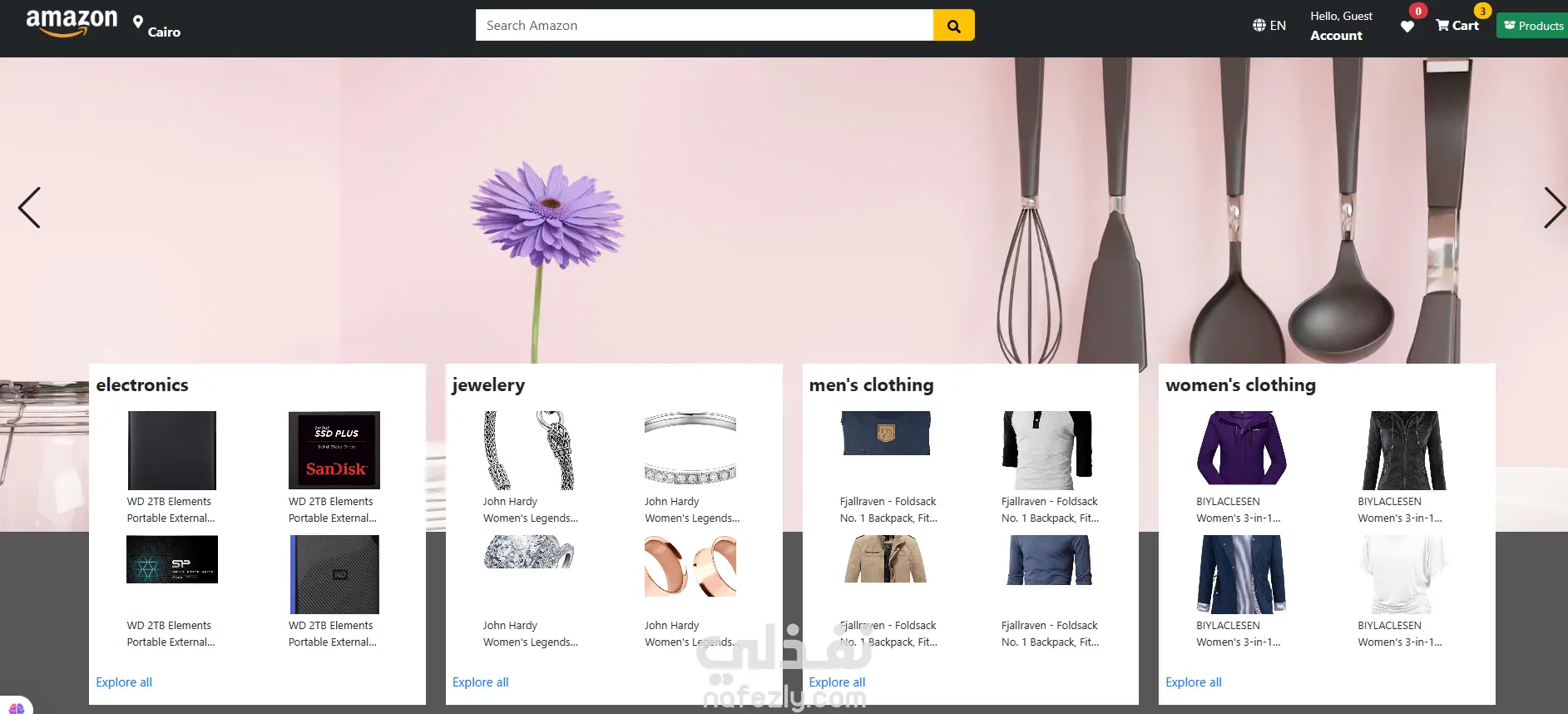 مشروع Amazon هو تطبيق تجارة إلكترونية متكامل يحاكي تجربة موقع أمازون الحقيقي،