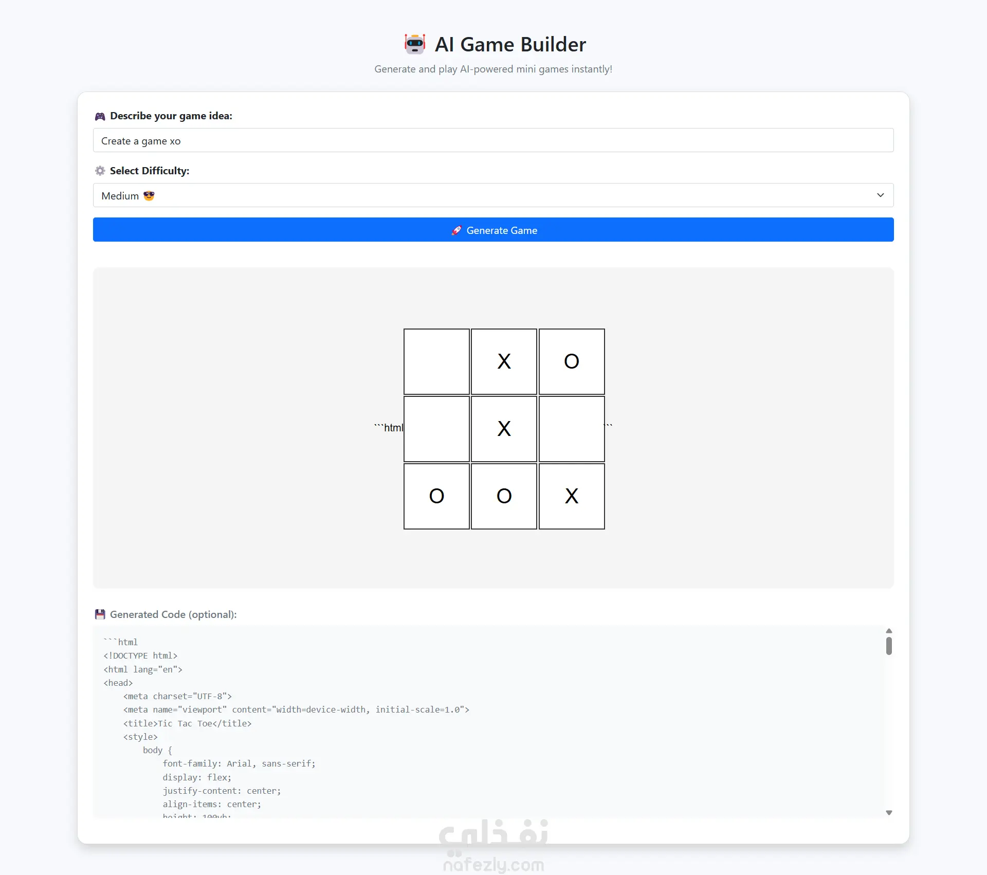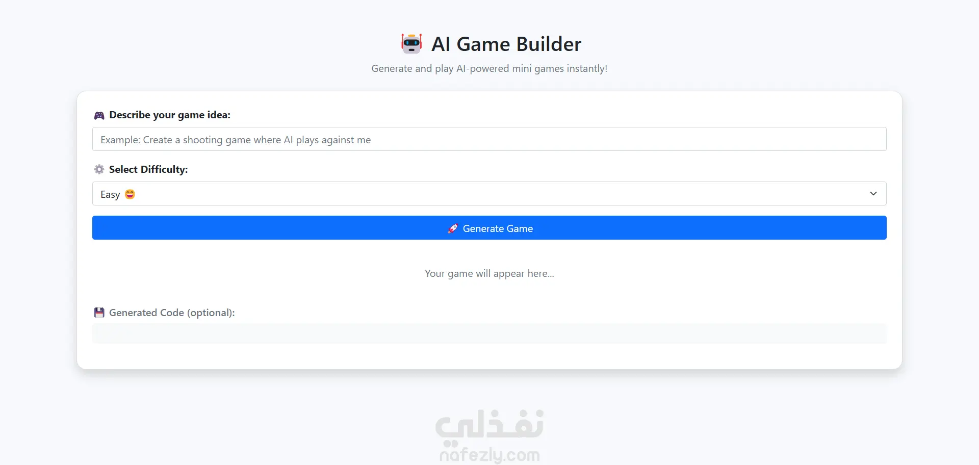 يسمح للمستخدم بوصف فكرة لعبته، اختيار مستوى الصعوبة، ثم يقوم المشروع بتوليد لعبة HTML قابلة للعب مباشرة داخل الصفحة.