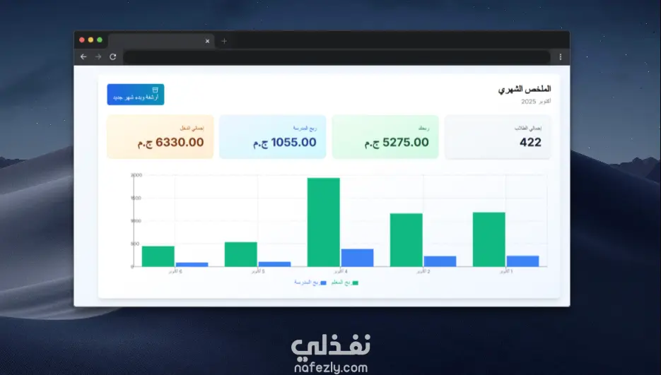 نظام متكامل لإدارة دخل المعلمين، يسمح بحساب الأرباح اليومية والشهرية من الحصص الدراسية، مع إمكانية أرشفة البيانات الشهرية وحفظها في قاعدة البيانات لسهولة الرجوع إليها لاحقًا.