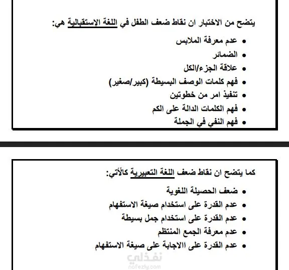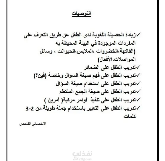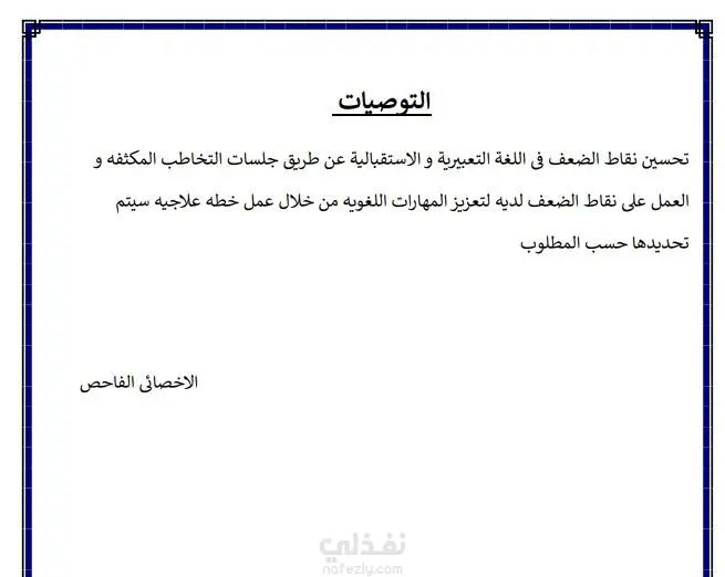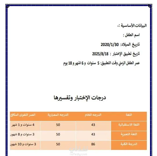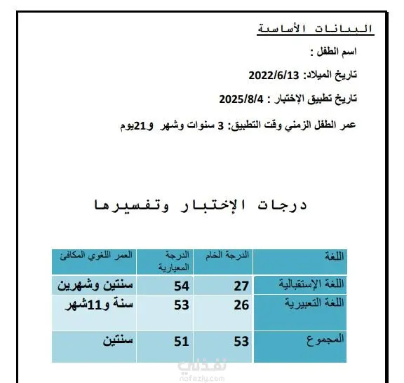 لقد اتبعت الخطوات التالية لضمان أن يكون التقرير شاملاً ودقيقاً ومفهوماً للأهل والأخصائيين المعنيين: - مرحلة جمع البيانات الأولية • مراجعة ملف الحالة: جمع المعلومات الأساسية عن الطفل (الاسم، العمر، التاريخ الصحي والنمائي). • تسجيل النتائج الخام: تجميع درجات الطفل بالتفصيل على بنود مقياس PLS-4، والتي تشمل مقياسين رئيسيين: 1- اللغة الاستقبالية : فهم اللغة. 2- اللغة التعبرية : استخدام اللغة. • الملاحظات السلوكية: تدوين أي ملاحظات ذات صلة بسلوك الطفل أثناء الاختبار (مثل: مستوى التعاون، الانتباه، التواصل غير اللفظي، الاستجابة للتعليمات). - مرحلة التحليل الإحصائي والتحويل • حساب العمر اللغوي (Language Age): تحويل الدرجات الخام إلى العمر المكافئ للغة في كل من مجالي ( اللغة الاستقبالية واللغة التعبرية ). • تحويل الدرجات المعيارية (Standard Scores): تحويل الدرجات الخام إلى درجات معيارية ، وهي ضرورية لمقارنة أداء الطفل بأقرانه. - مرحلة كتابة التقرير (الهيكلة) قمت بتنظيم التقرير وفقاً للهيكل القياسي للتقارير النفسية واللغوية: 1. معلومات أساسية • اسم الطفل وتاريخ ميلاده. • تاريخ إجراء الاختبار وعمر الطفل بالضبط (بالسنوات والأشهر والأيام). • اسم الأخصائي الذي أجرى الاختبار. 2. سبب عمل الاختبار • تحديد الغرض من التقييم (مثلاً: الشك في تأخر لغوي، تقييم مدى التقدم). • ذكر اسم الاختبار المُستخدم (Preschool Language Scale-4). 3. الملاحظات السلوكية أثناء الاختبار • وصف موجز لحالة الطفل العامة، ومستوى التركيز، وكيفية تفاعله مع الأخصائي، وأي عوامل بيئية أثرت على الأداء. 4. النتائج الكمية (العددية) • عرض واضح لجميع الدرجات المعيارية والرتب المئينية والأعمار اللغوية لمجالي (AC) و (EC)، بالإضافة إلى الدرجة الكلية للغة. 5. تفسير النتائج (التحليل النوعي) • التحليل التفصيلي: وصف جوانب القوة والضعف اللغوية المحددة للطفل بناءً على البنود التي نجح فيها أو فشل فيها (مثلاً: القدرة على اتباع الأوامر البسيطة، أو صعوبة استخدام صيغ الجمع). • ربط النتائج بالبيانات: مقارنة أداء الطفل بمتوسط الأداء الطبيعي لأقرانه. - التوصيات • تقديم خطة عمل مقترحة ومحددة وقابلة للتطبيق (مثل: بدء جلسات علاج النطق، الإحالة إلى أخصائي سمع، أنشطة لغوية يمكن للأهل القيام بها في المنزل).