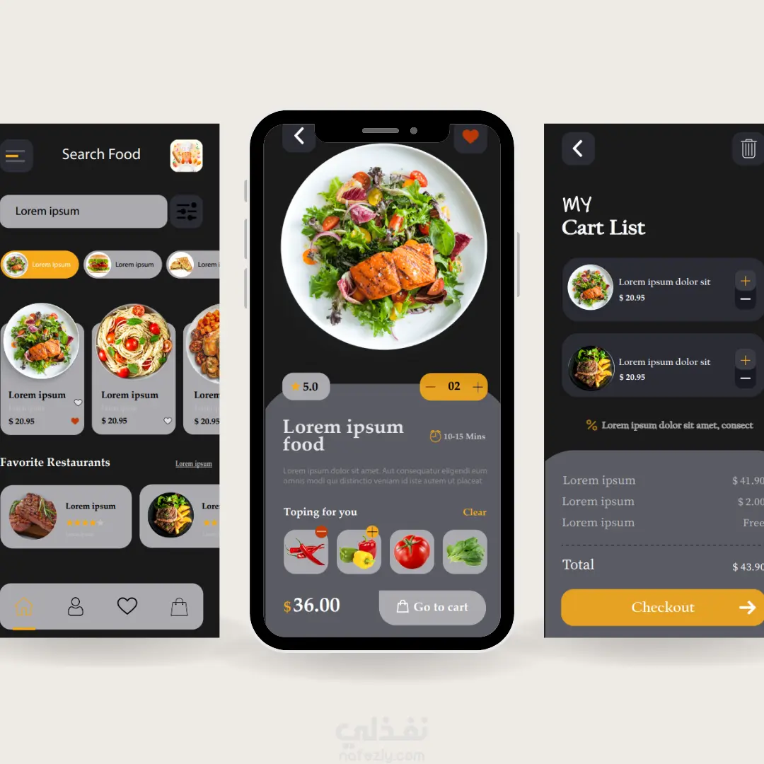 واجهة الرئيسية (Home Page) الغرض: هذه هي الشاشة الأولى التي يراها المستخدم بعد فتح التطبيق. تعرض المطاعم المتاحة، والعروض، والفئات. واجهة تفاصيل الطبق (Product Details Page) الغرض: عرض تفاصيل طبق معين بعد النقر عليه من قائمة المطعم، والسماح للعميل بتخصيص الطلب من خلال الإضافات واختيار الكمية. واجهة سلة التسوق / تأكيد الطلب (Cart & Checkout) الغرض: مراجعة الطلبات وإدخال معلومات التوصيل والدفع لإكمال العملية. البرامج المستخدمة: Photoshop و Adobe Illustrator.