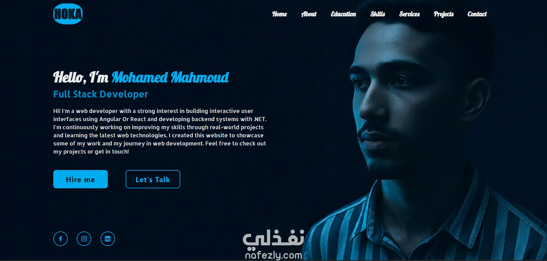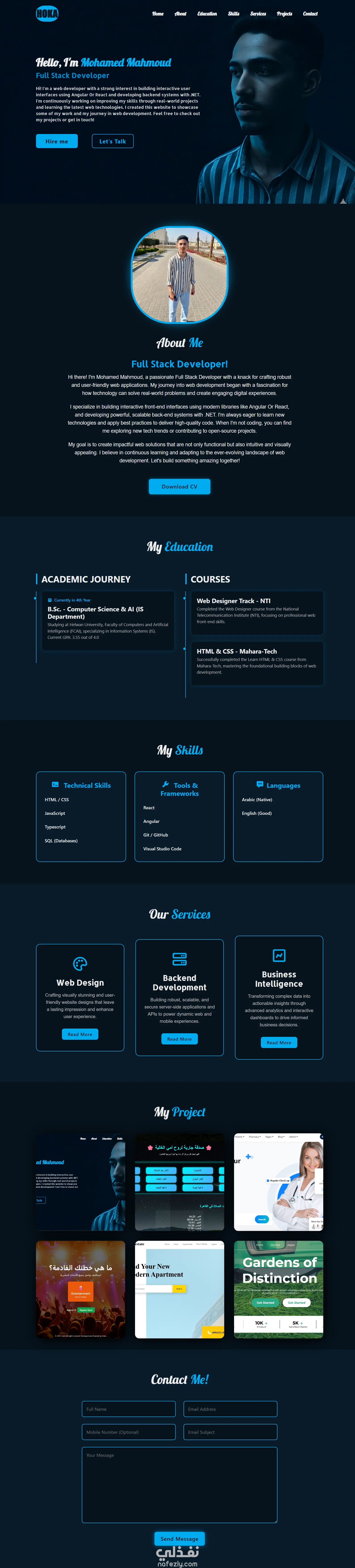 يضم أقسامًا مثل: الصفحة الرئيسية، من أنا، الأعمال (Portfolio)، الخدمات، والتواصل.