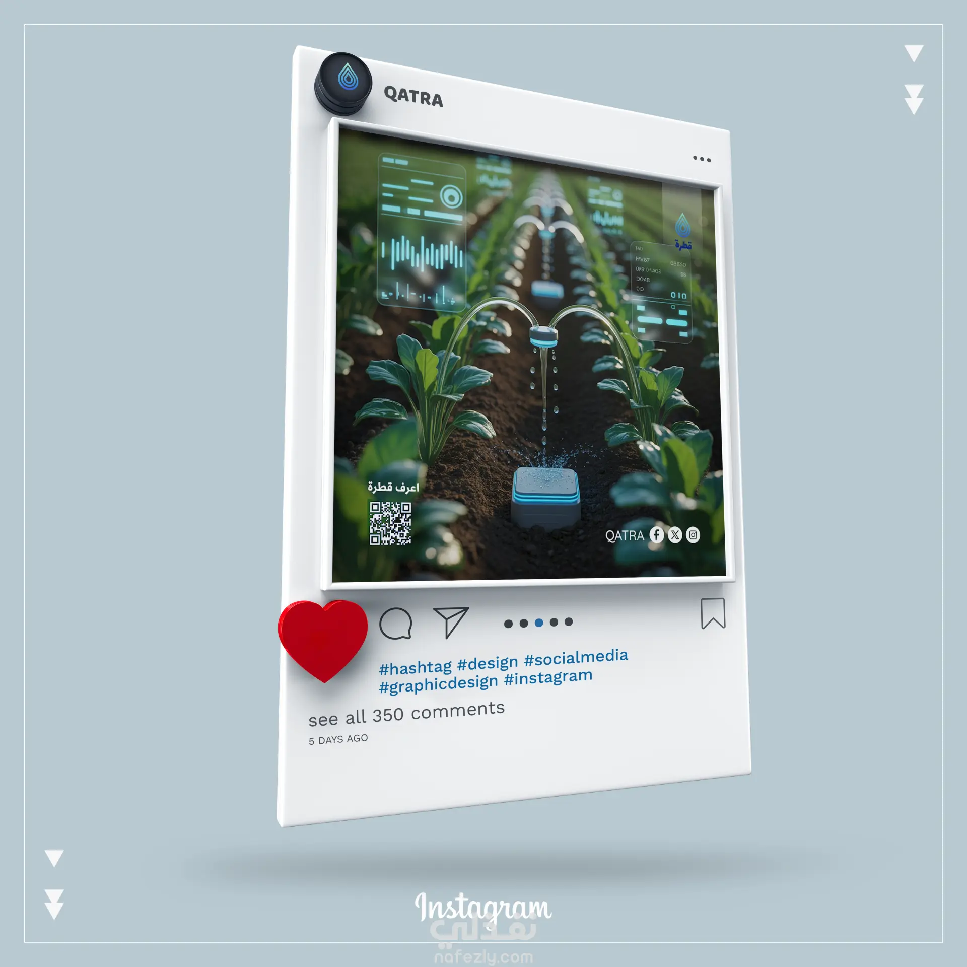 قمت بتنفيذ مجموعة من تصميمات السوشيال ميديا الاحترافية الخاصة بمشروع قطرة، وهو تطبيق ذكي لإدارة المياه الحديثة، يساعد المستخدمين على متابعة استهلاكهم، إدارة فواتيرهم، والتحكم في أنظمة الري الذكية بدقة عالية. التصميمات تعتمد على أسلوب عصري يجمع بين الصور الواقعية للزراعة والبيئة المنزلية مع واجهات رقمية مستقبلية (Futuristic UI)، لإظهار التكنولوجيا المتقدمة التي يقدمها التطبيق