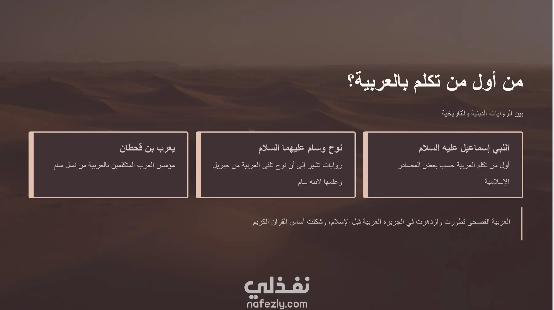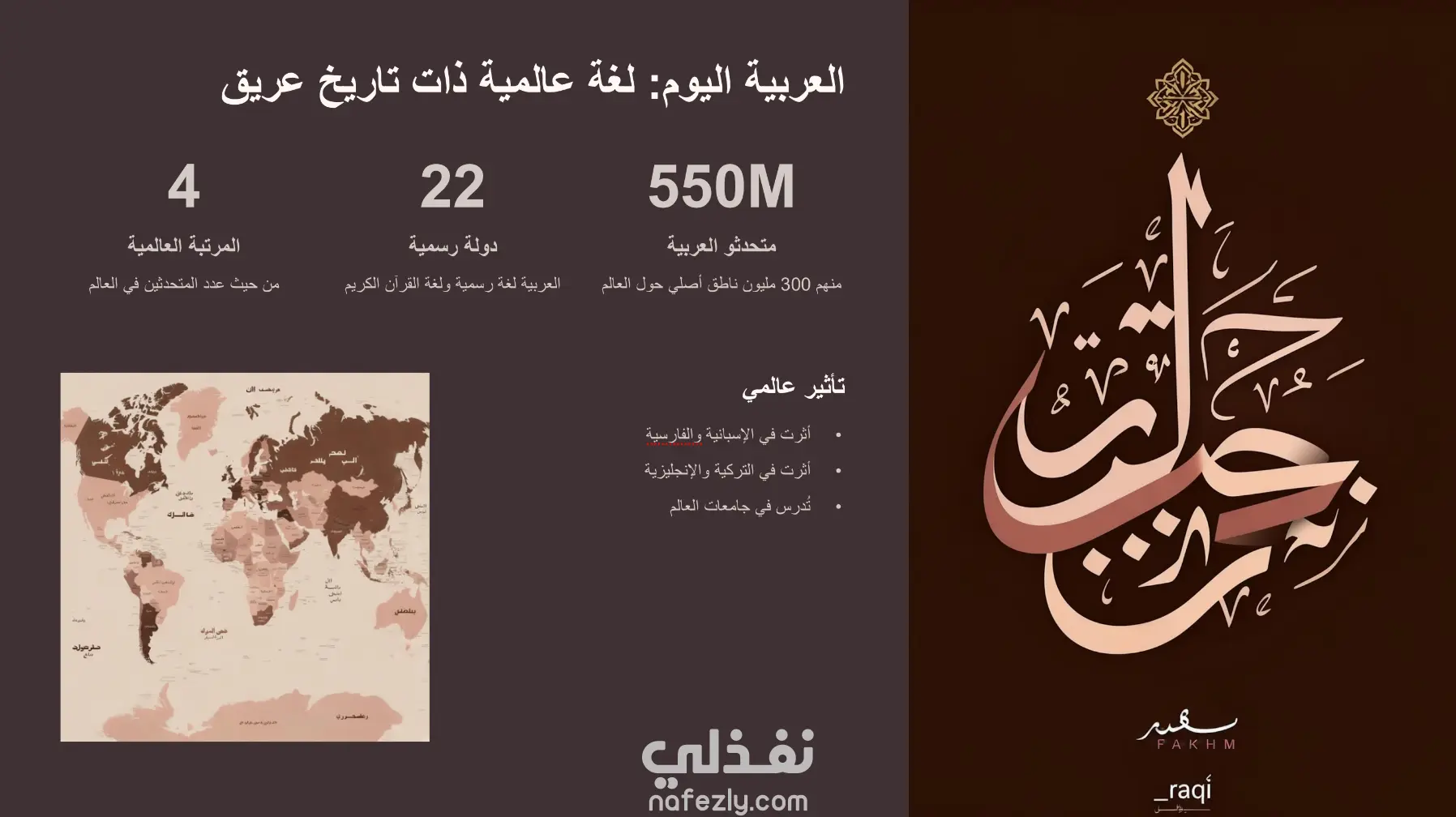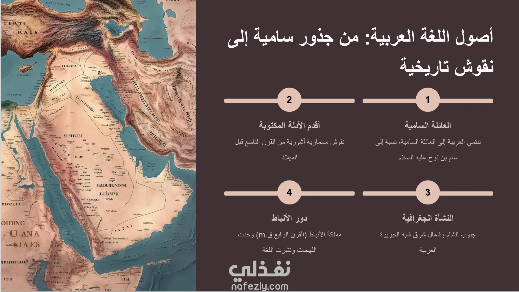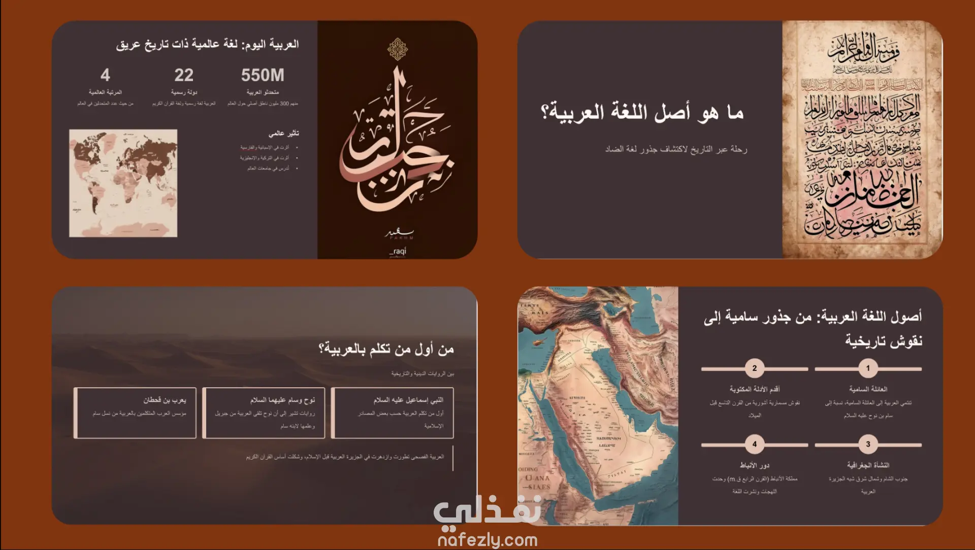 يستعرض هذا العرض تاريخ اللغة العربية العريق، وأصولها من النقوش التاريخية، ومكانتها العالمية اليوم كواحدة من أكثر اللغات انتشارًا، بالإضافة إلى معلومات حول الناطقين بها وأهميتها الثقافية والحضارية.