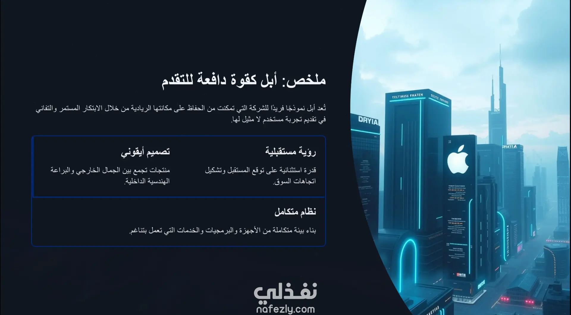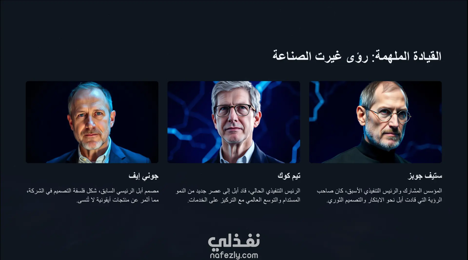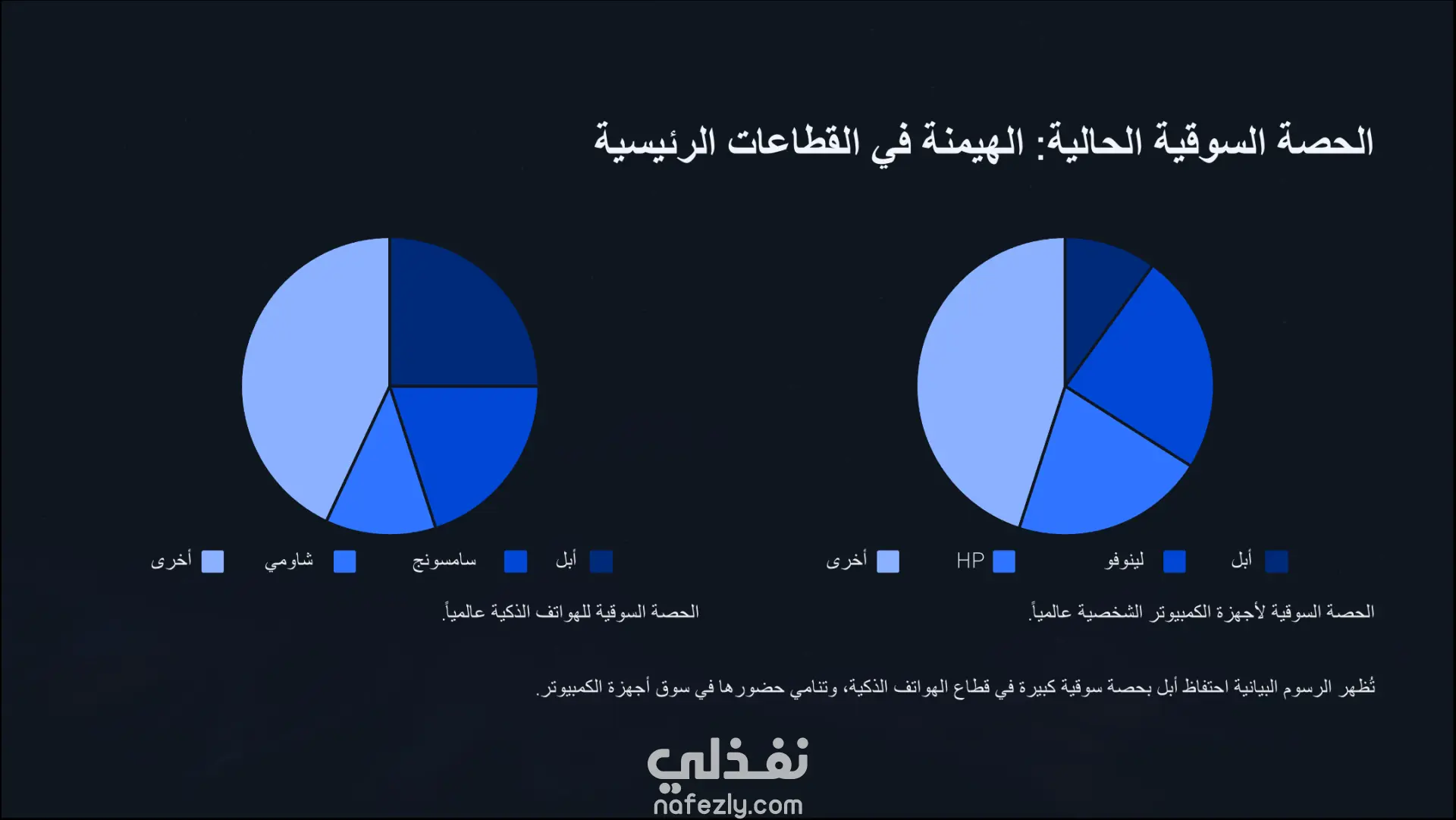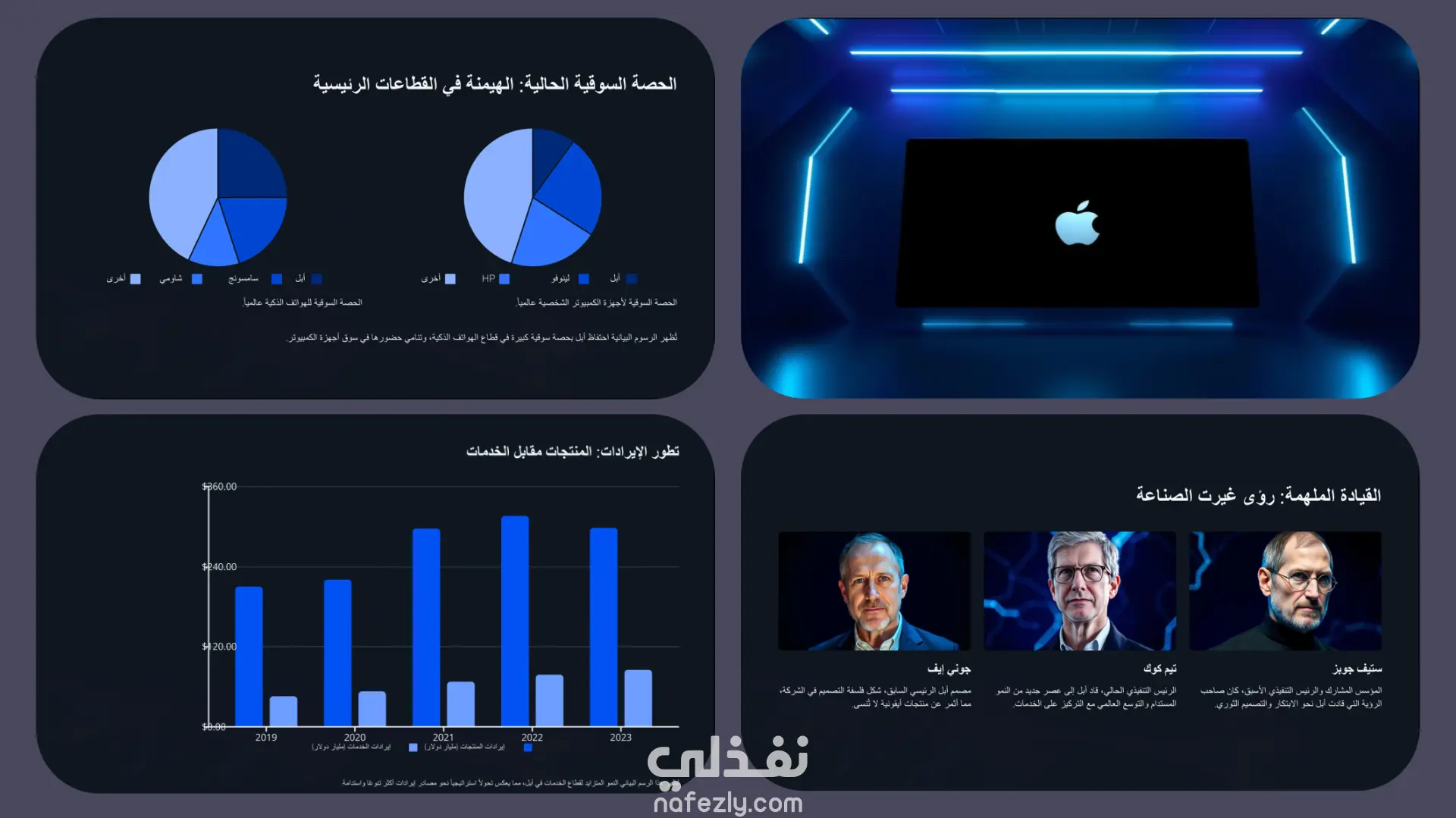 يتناول هذا العرض تاريخ شركة آبل وقياداتها المؤثرة (مثل ستيف جوبز)، ويحلل الحصة السوقية للشركة في القطاعات التكنولوجية الرئيسية، ويسلط الضوء على الإرث والابتكارات التي أسست ريادتها في الصناعة.