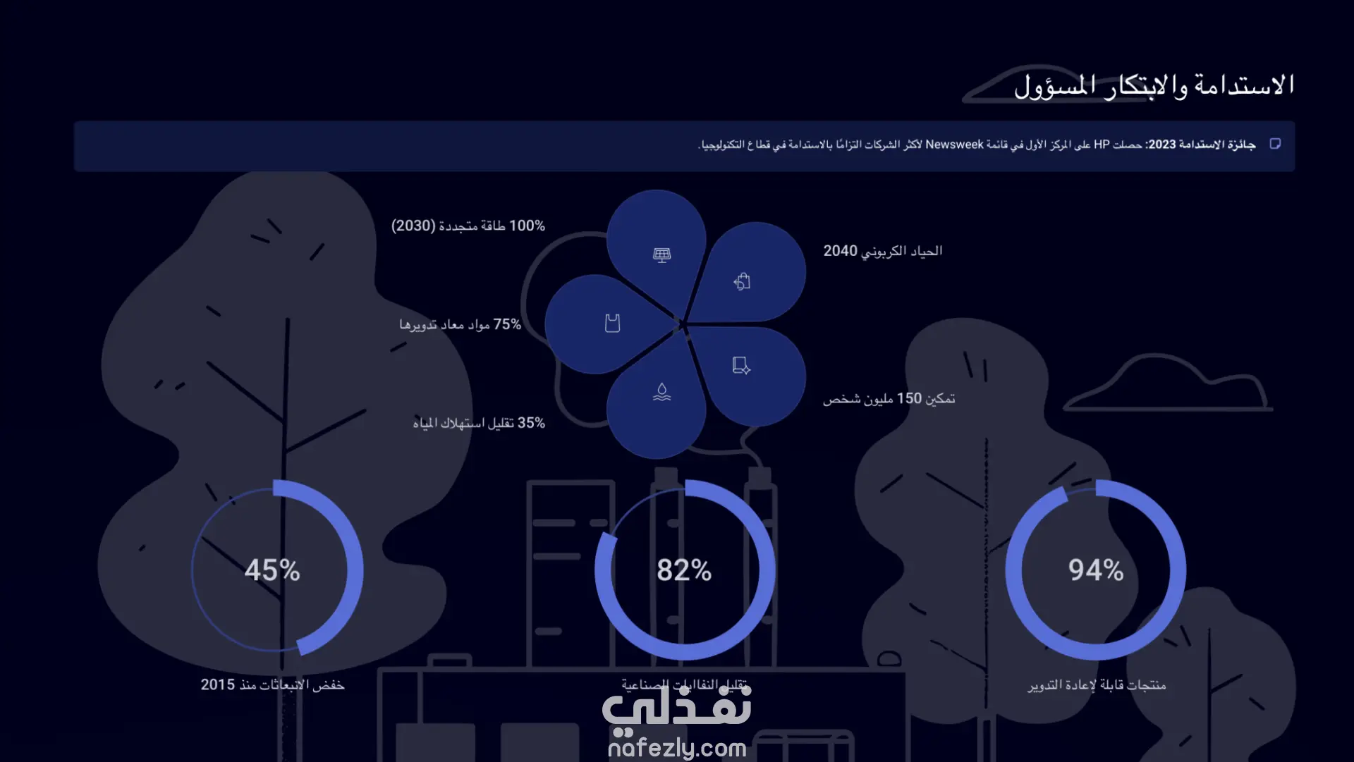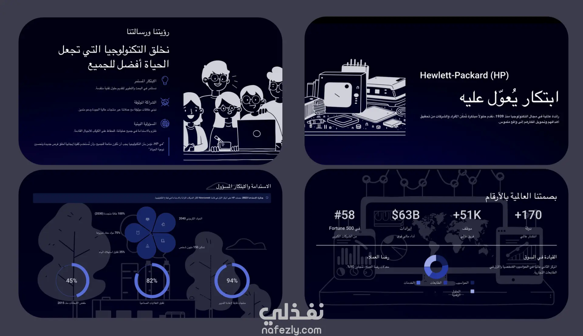 عرض بصري يعكس رؤية ورسالة شركة HP في تمكين الحياة عبر التكنولوجيا، مع إبراز إنجازاتها في الاستدامة والنجاح المالي. يتضمن رسومًا بيانية توضح تقليل الانبعاثات وتحويل النفايات، إلى جانب أرقام بارزة مثل الإيرادات، عدد براءات الاختراع، وانتشار الشركة عالميًا.