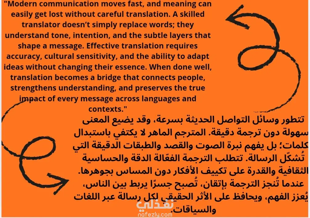 هذا العمل يتضمن ترجمة نصّ احترافي حول أهمية الترجمة ودورها في نقل المعنى بدقة عبر اللغات، مع إعادة صياغة النص بأسلوب واضح ومتقن والحفاظ على النبرة والمعنى. كما يشمل تنسيقاً بصرياً جذاباً ليظهر بشكل احترافي ومناسب للعرض في معرض الأعمال.