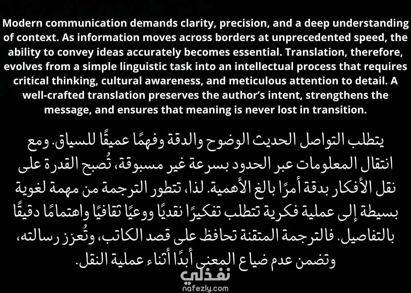 ترجمة نص إنجليزي متخصص إلى العربية بأسلوب واضح ودقيق مع الحفاظ على المعنى والسياق، وصياغة عربية متقنة وتنسيق بصري مناسب للعرض بشكل احترافي.