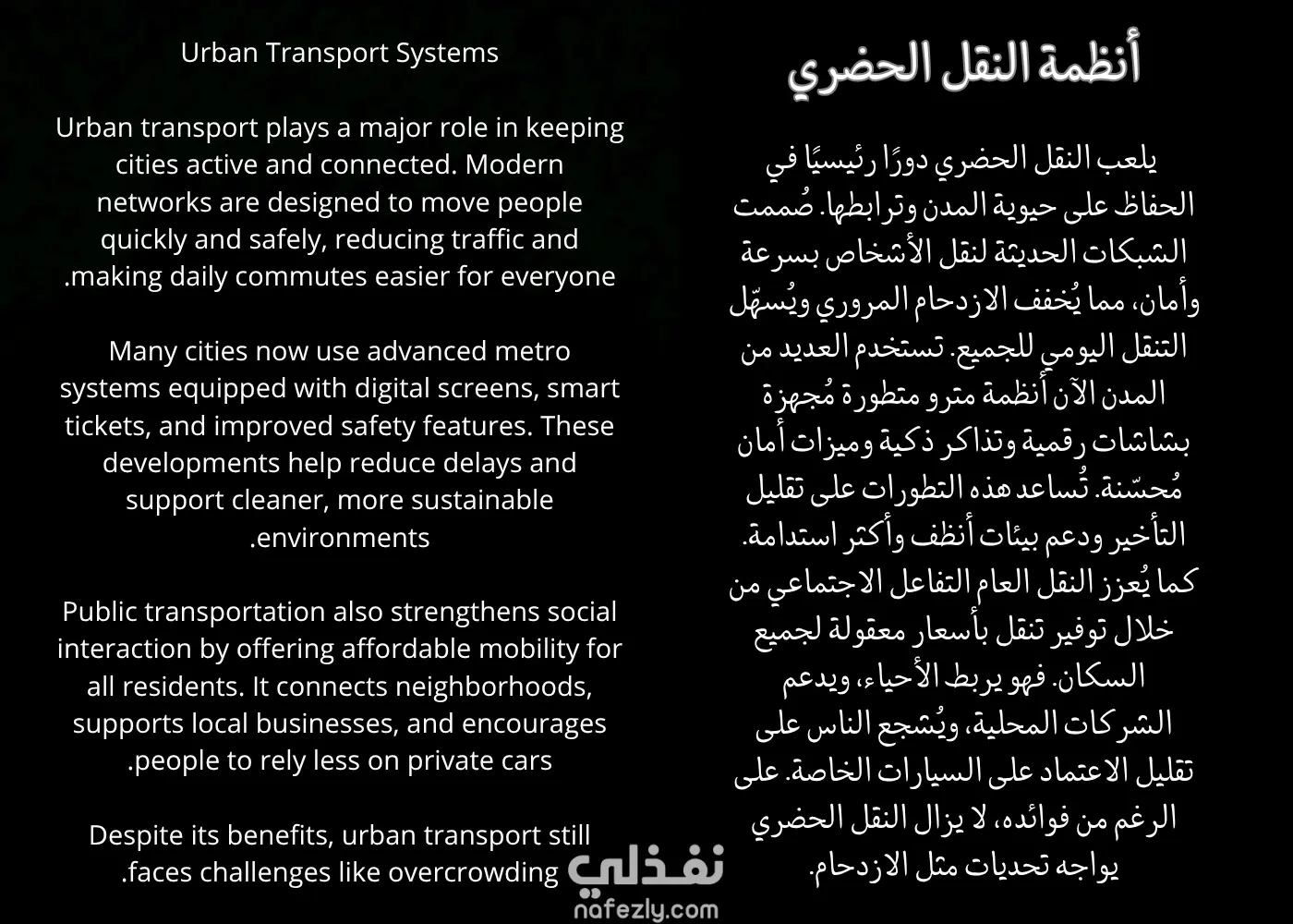 ترجمة احترافية دقيقة لنص ثنائي اللغة (إنجليزي – عربي) يتناول موضوع أنظمة النقل الحضري. يشمل العمل إعادة صياغة سلسة، ونقل المعنى بدقّة، مع الحفاظ على الأسلوب الأكاديمي للمحتوى. تمّت مراعاة التناسق بين اللغتين وتحسين الوضوح لتقديم نص جاهز للاستخدام في التقارير أو العروض التقديمية أو المشاريع البحثية.