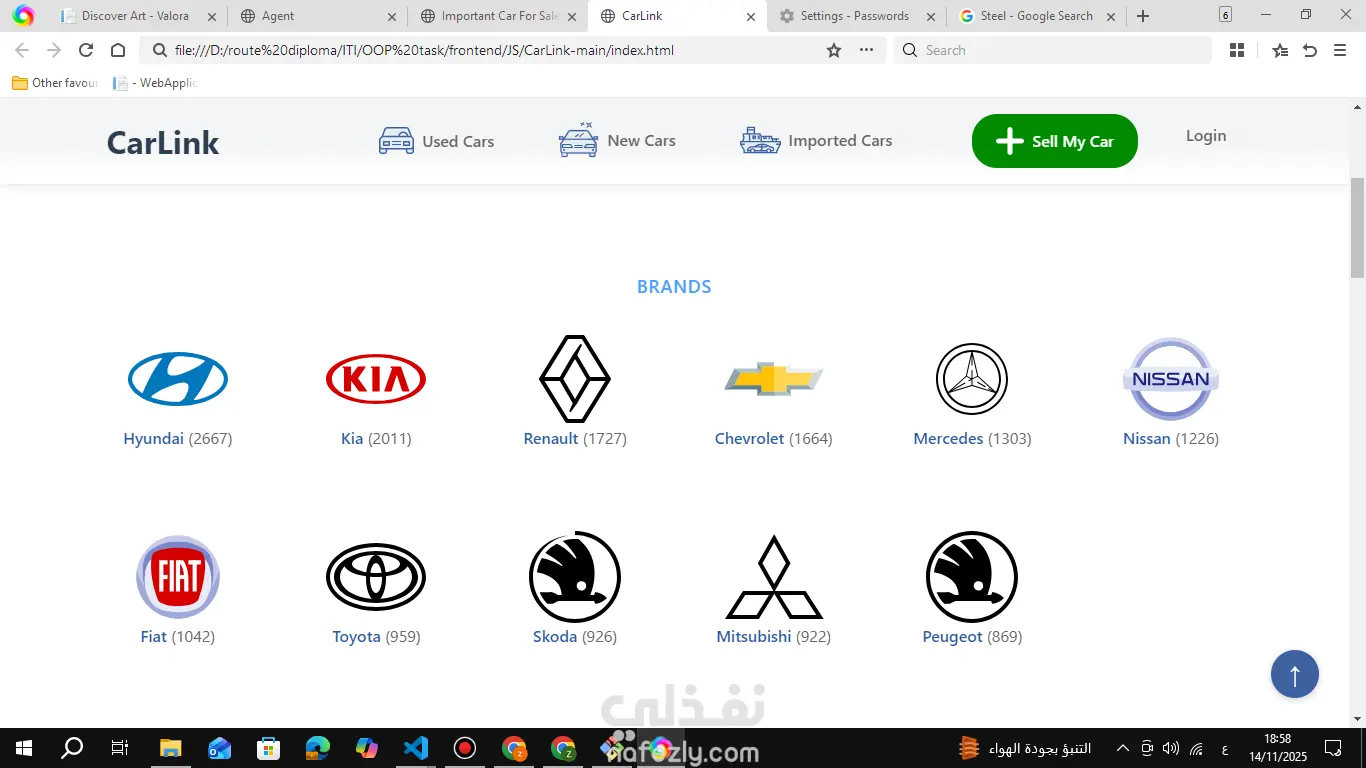 CarLink هو مشروع ويب متكامل يشبه موقع "هتلاقي"، يهدف إلى تسهيل عملية بيع وشراء السيارات الجديدة والمستعملة والمستوردة. يوفر المنصّة واجهة سهلة الاستخدام تتيح للمستخدمين تصفح السيارات وفق النوع، الموديل، السعر، والحالة. تم تطوير النظام باستخدام ASP.NET Core للباك إند و React/Angular للواجهة الأمامية. يدعم المشروع لوحة تحكم خاصة للبائعين لإضافة سياراتهم وإدارة إعلاناتهم بسهولة. كما يوفّر محرك بحث متقدم مع فلاتر ذكية تساعد المشترين في الوصول إلى السيارة المناسبة بسرعة. تم ربط النظام بقاعدة بيانات قوية باستخدام SQL Server لضمان سرعة وأمان البيانات. يحتوي الموقع على تصميم متجاوب يعمل بكفاءة على مختلف الأجهزة (موبايل – تابلت – كمبيوتر). أضفت فيه ميزات مثل حفظ السيارات المفضلة ومقارنة المواصفات بين أكثر من سيارة. التركيز الأساسي كان على تجربة المستخدم وتقديم أداء سريع وسلس. النتيجة منصة رقمية احترافية تساعد في ربط البائعين بالمشترين وتبسيط عملية البيع والشراء.