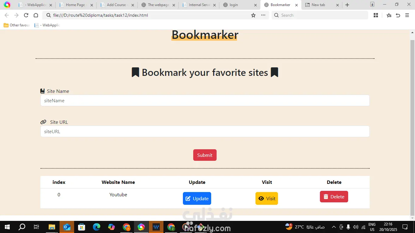 وقع Bookmarker بسيط وعملي يسمح للمستخدمين بحفظ الروابط المهمة في مكان واحد، مع إمكانية الزيارة المباشرة لأي رابط، وكذلك تحديثه أو حذفه بسهولة. تم تطوير الموقع باستخدام HTML وCSS وJavaScript وBootstrap لتصميم واجهة حديثة وسريعة الاستجابة. يوفر تجربة استخدام سلسة تساعد المستخدم على إدارة وتنظيم روابطه المفضلة بشكل فعال.
