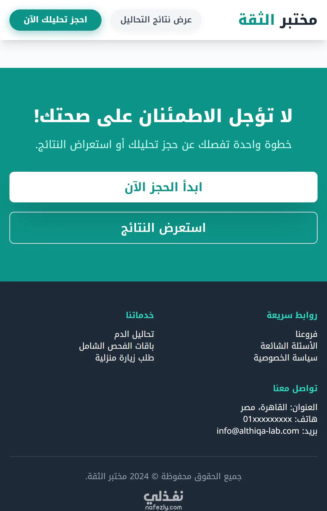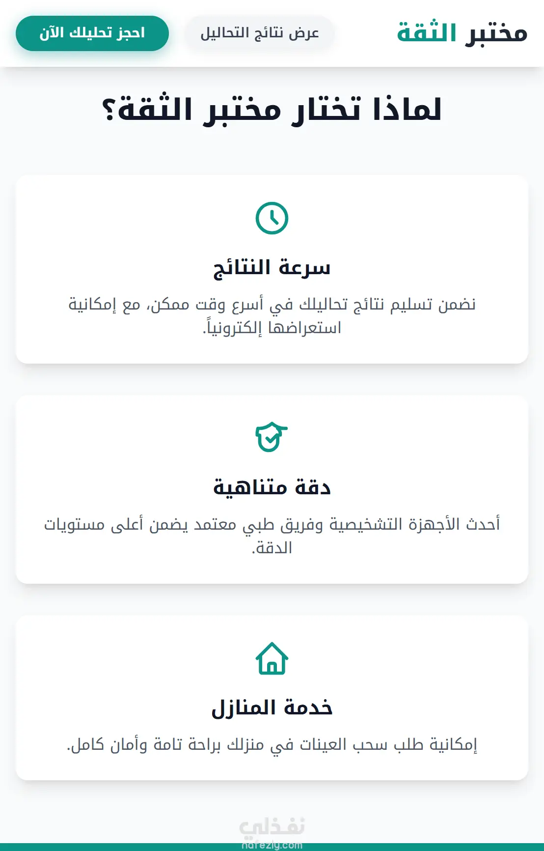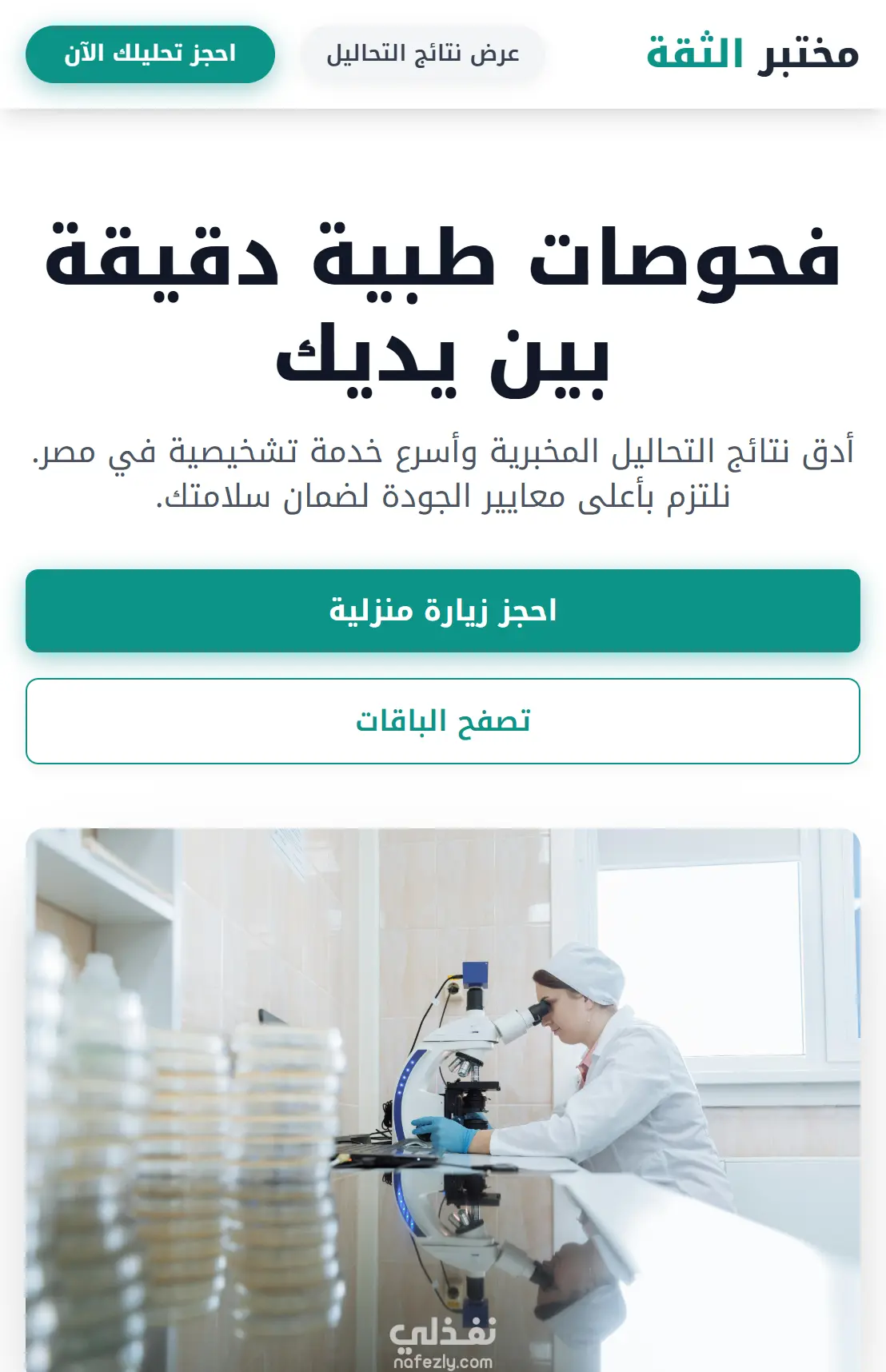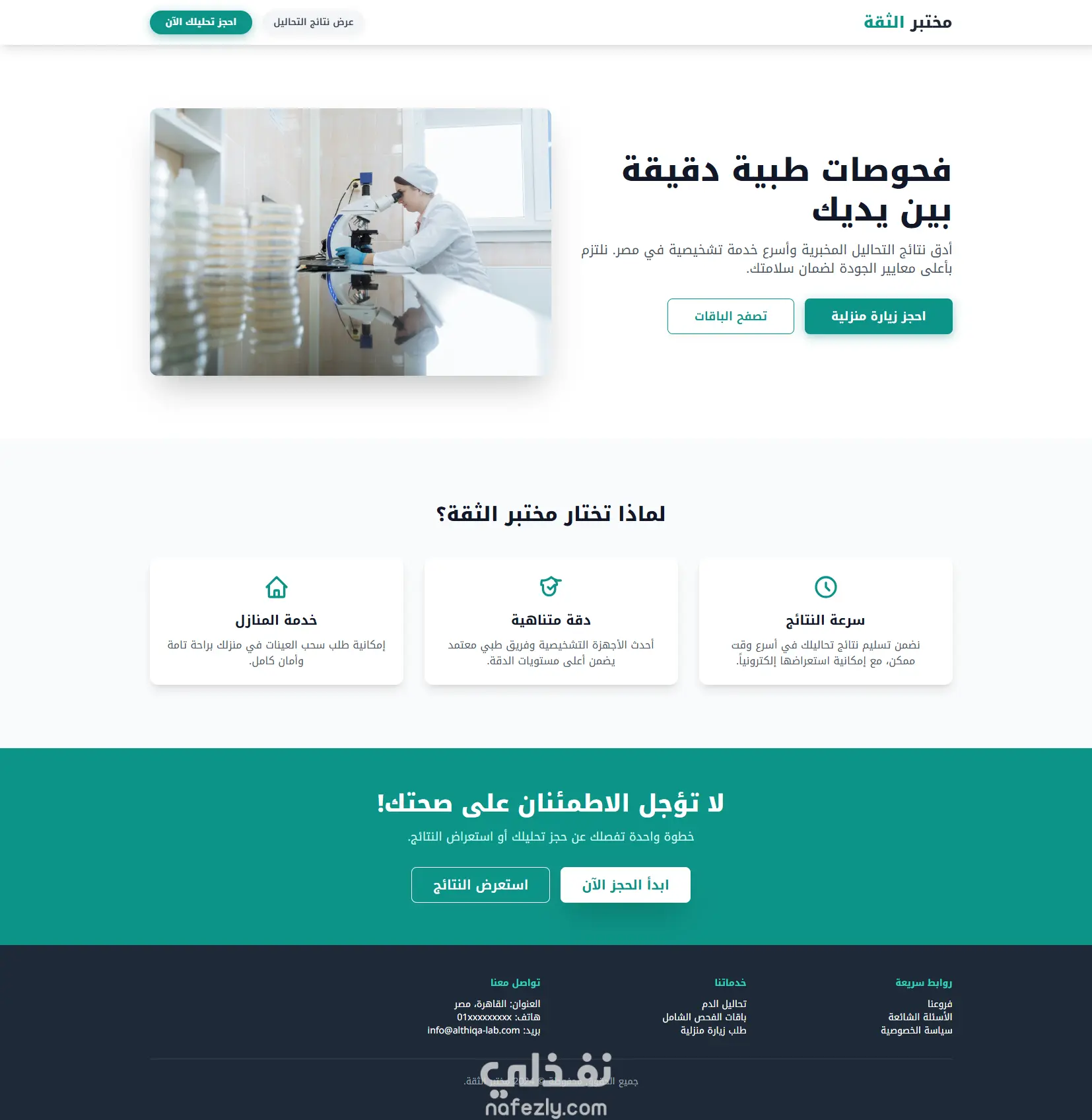 تركز الصفحة على بناء الثقة العالية وتوجيه المستخدمين بوضوح نحو إجراءات التحويل الأساسية (الحجز واستعراض النتائج). تم التنفيذ باستخدام HTML5 و Tailwind CSS لضمان تصميم احترافي، نظيف، ومتجاوب بالكامل مع جميع الأجهزة.