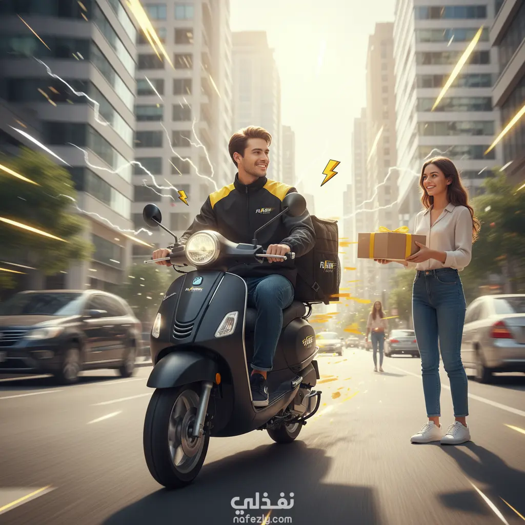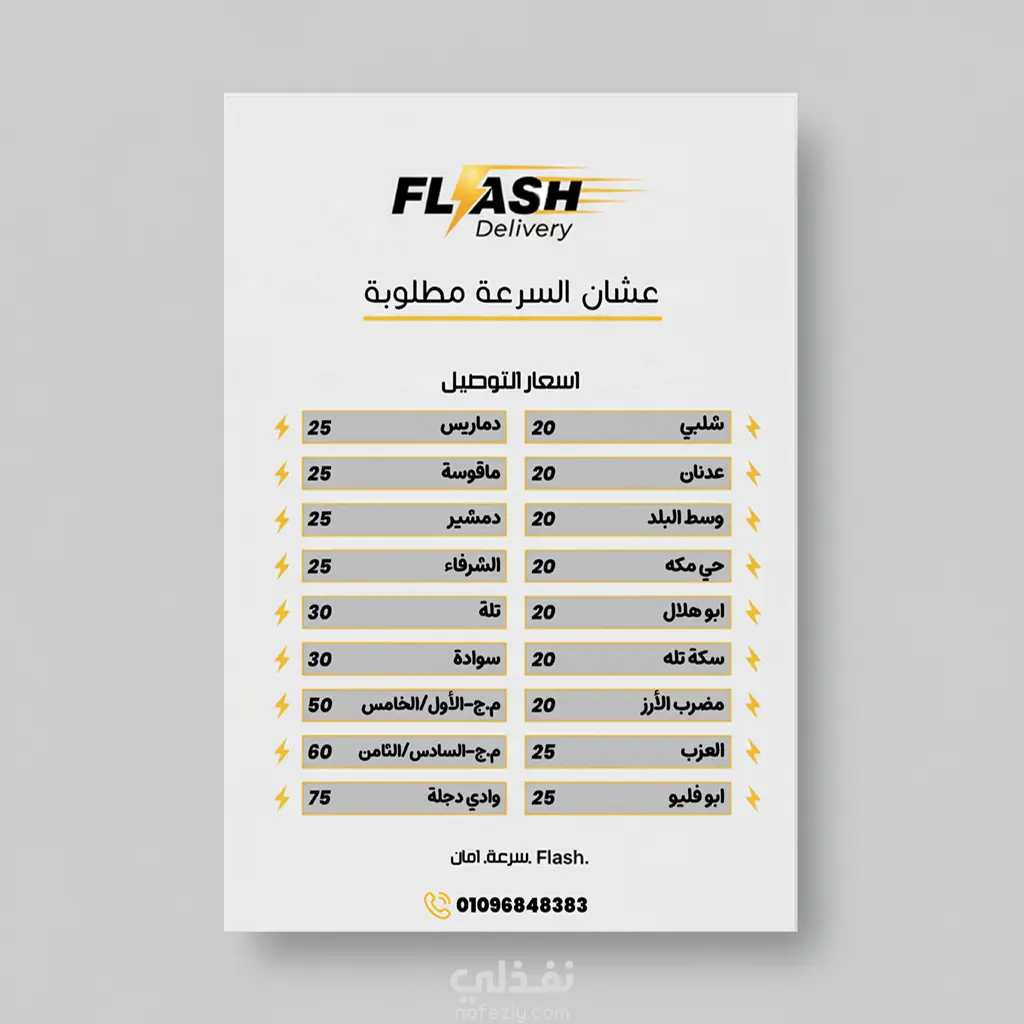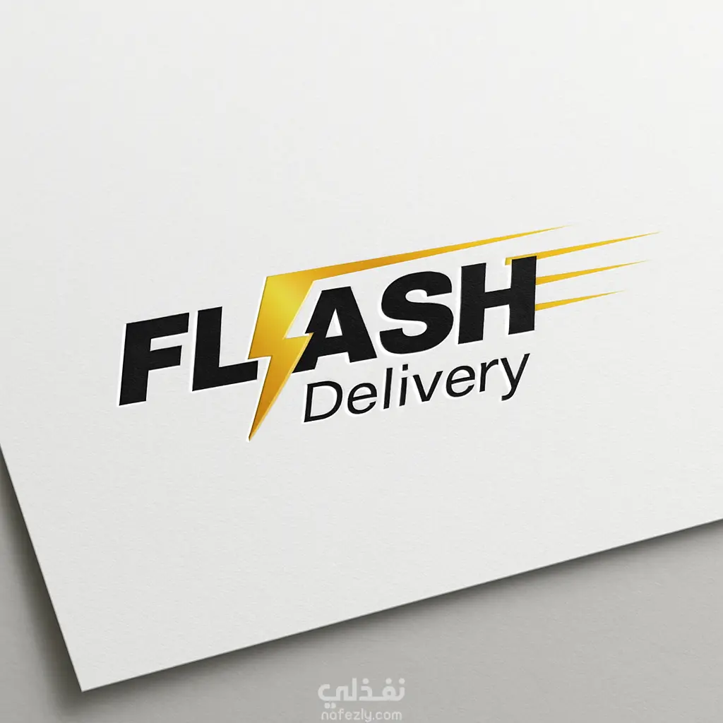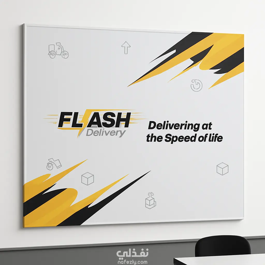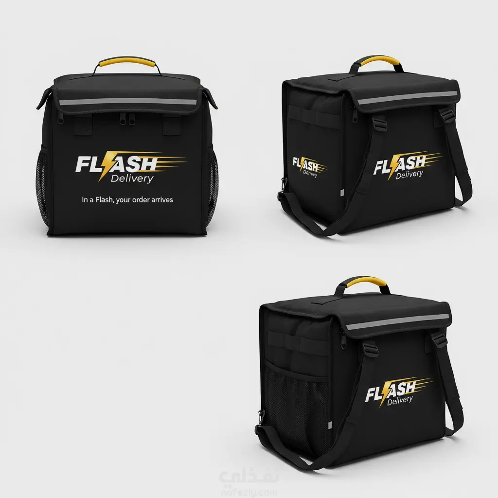 هوية بصرية كاملة لشركة توصيل طلبات باسم flash تتكون من لوجو للشركة وفلاير وبلتة الوان وتصميم سوشيل ميديا متناسقين