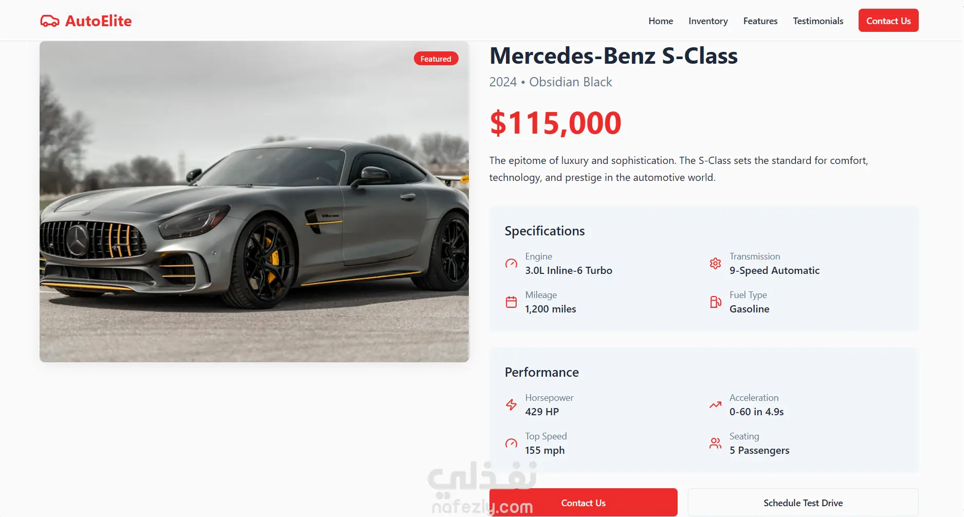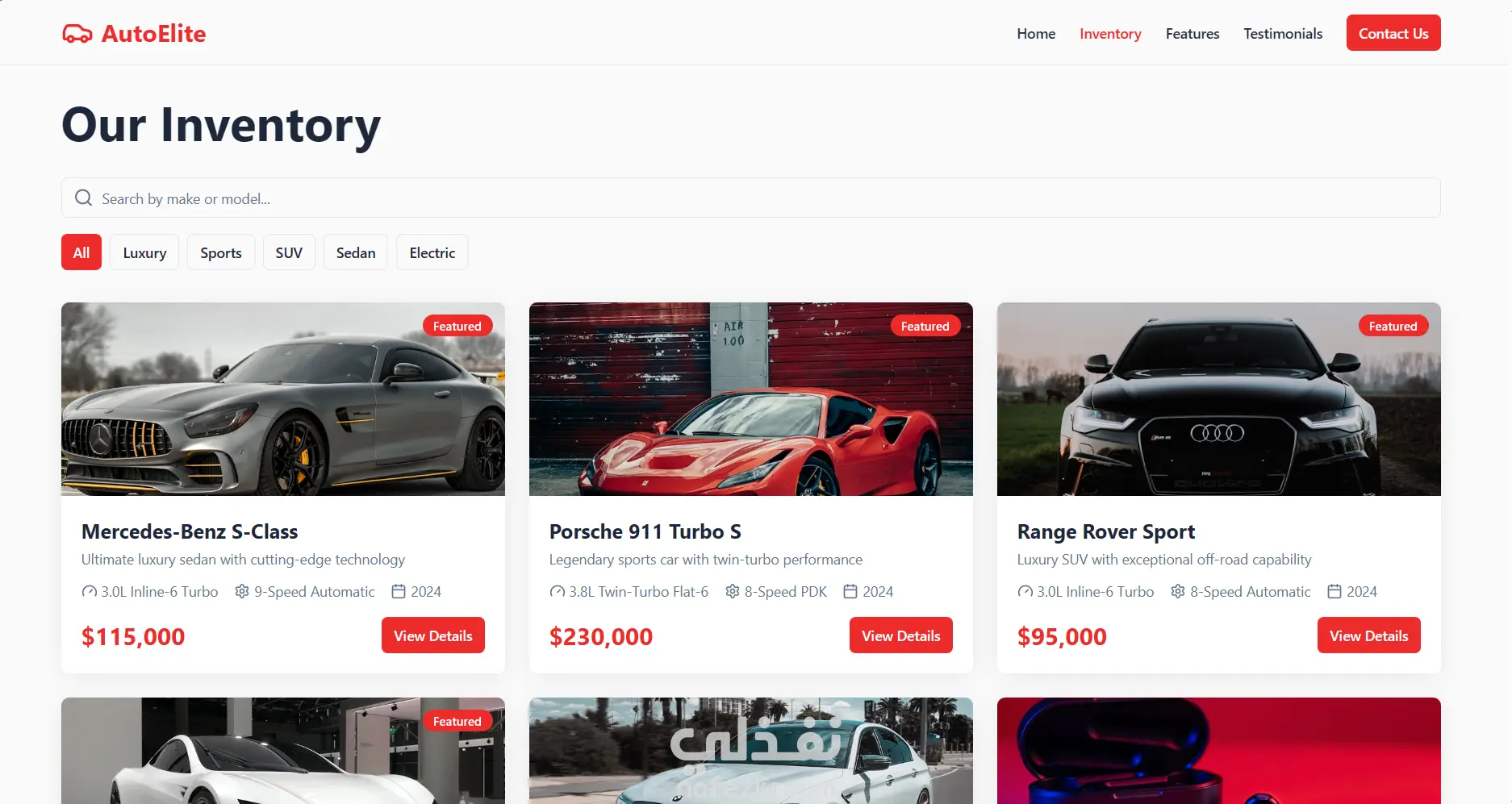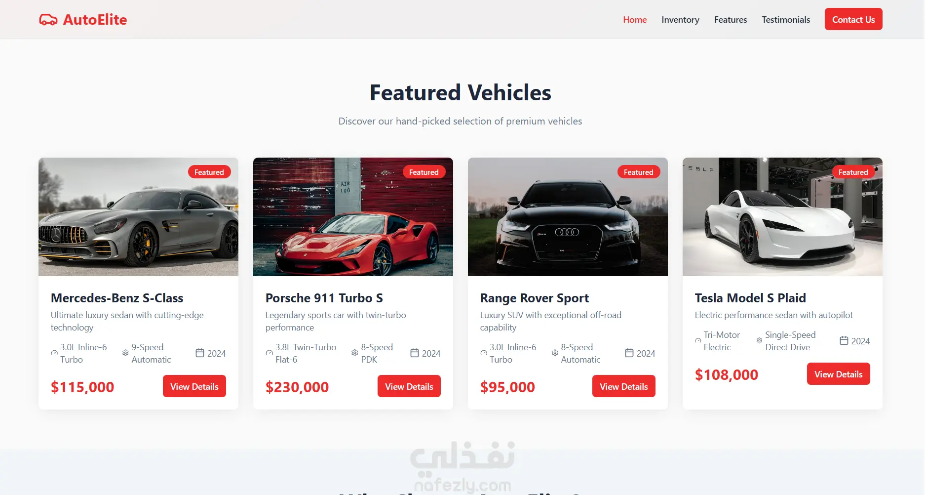 موقع AutoElite يقدم تجربة تصفح احترافية، وهيكلة قوية وواجهة مصممة بعناية لتناسب معارض السيارات والشركات التي تقدم خدمات البيع والشراء.