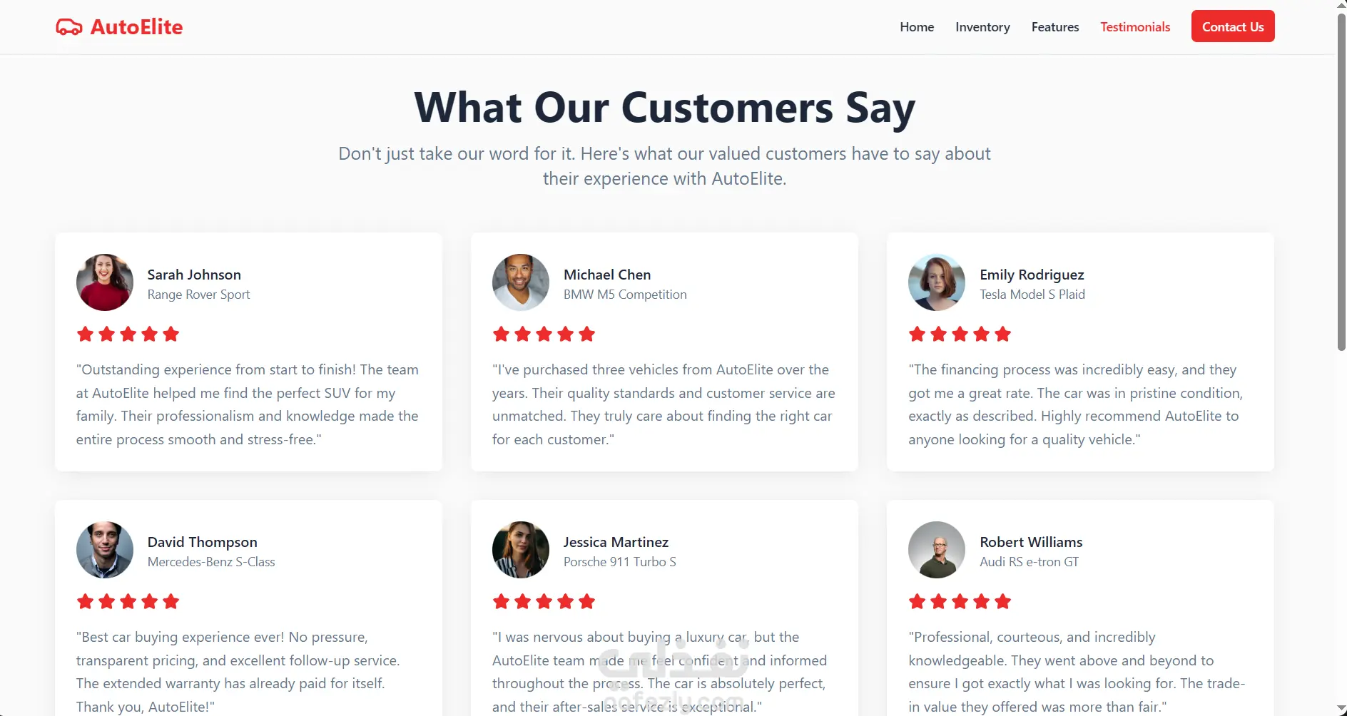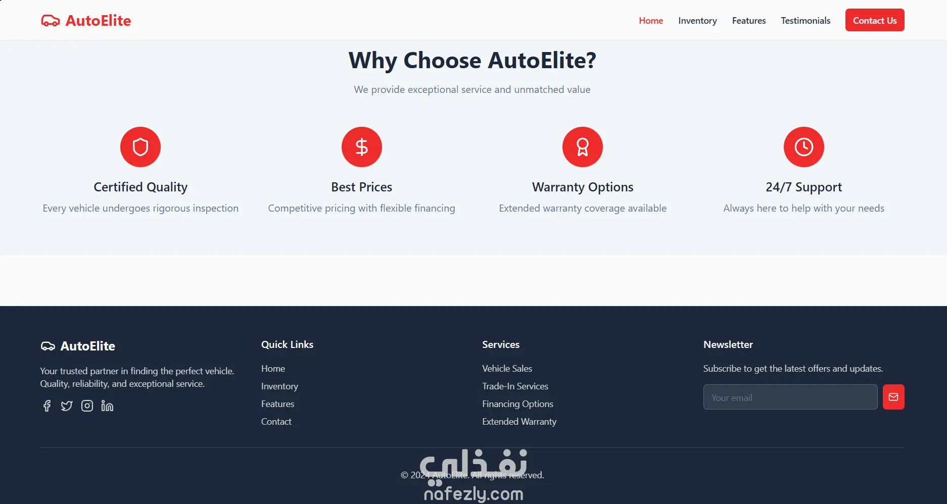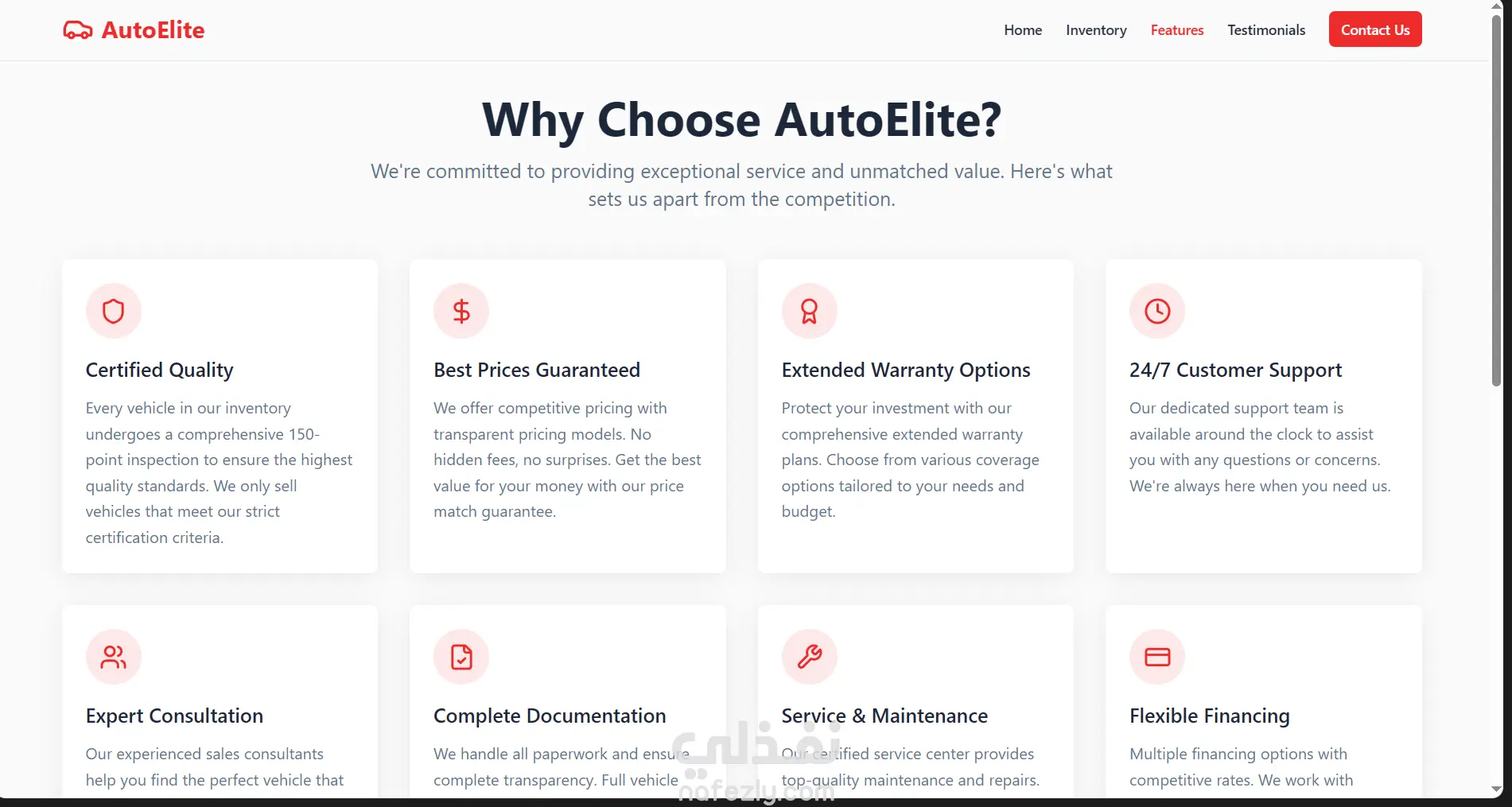 موقع AutoElite يقدم تجربة تصفح احترافية، وهيكلة قوية وواجهة مصممة بعناية لتناسب معارض السيارات والشركات التي تقدم خدمات البيع والشراء.